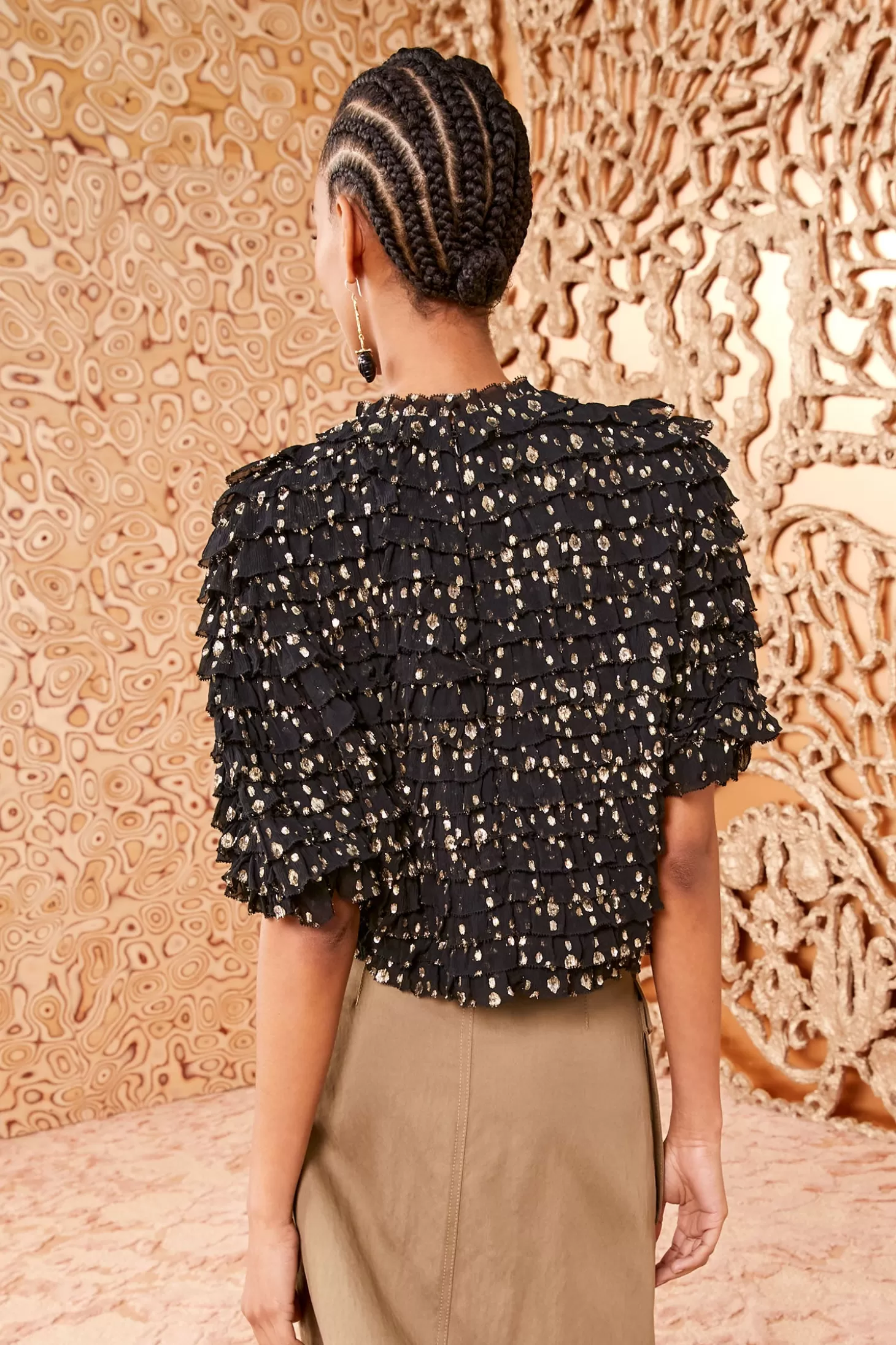 Visually stunning, our Carmella Blouse is made from crinkle chiffon that flickers with lurex dots woven into the fabric, bringing a shimmering touch to the classic black background. This short-sleeve style has a round neckline and a relaxed fit that’s exquisitely tiered and ruffled throughout. It fastens with a center-back zipper.
