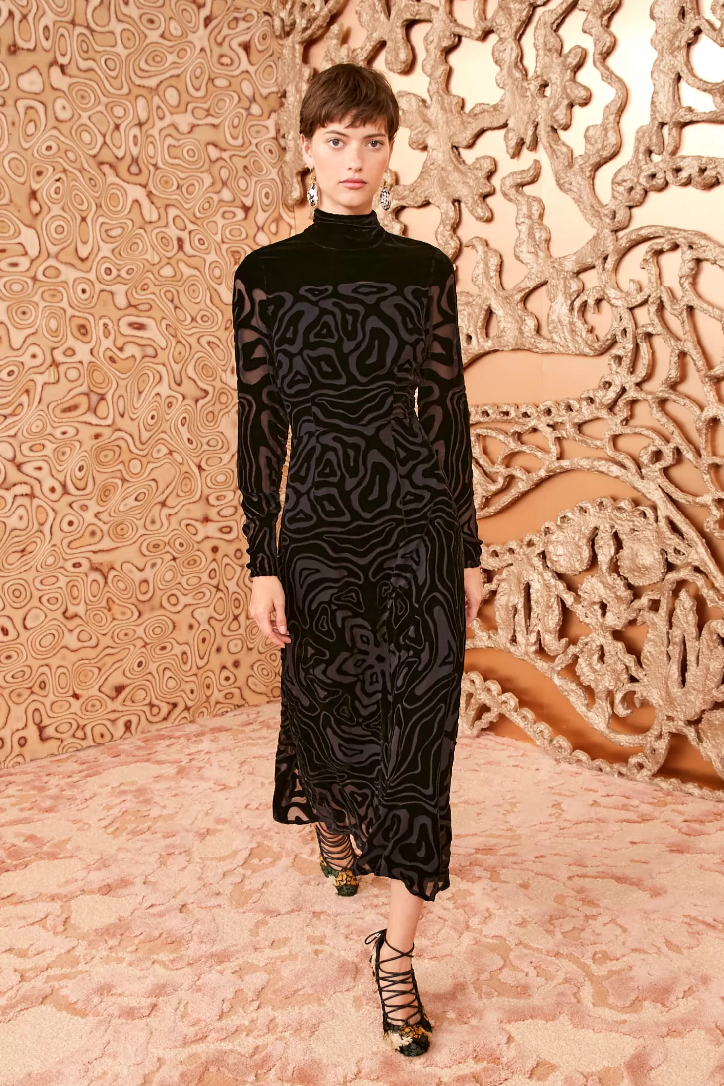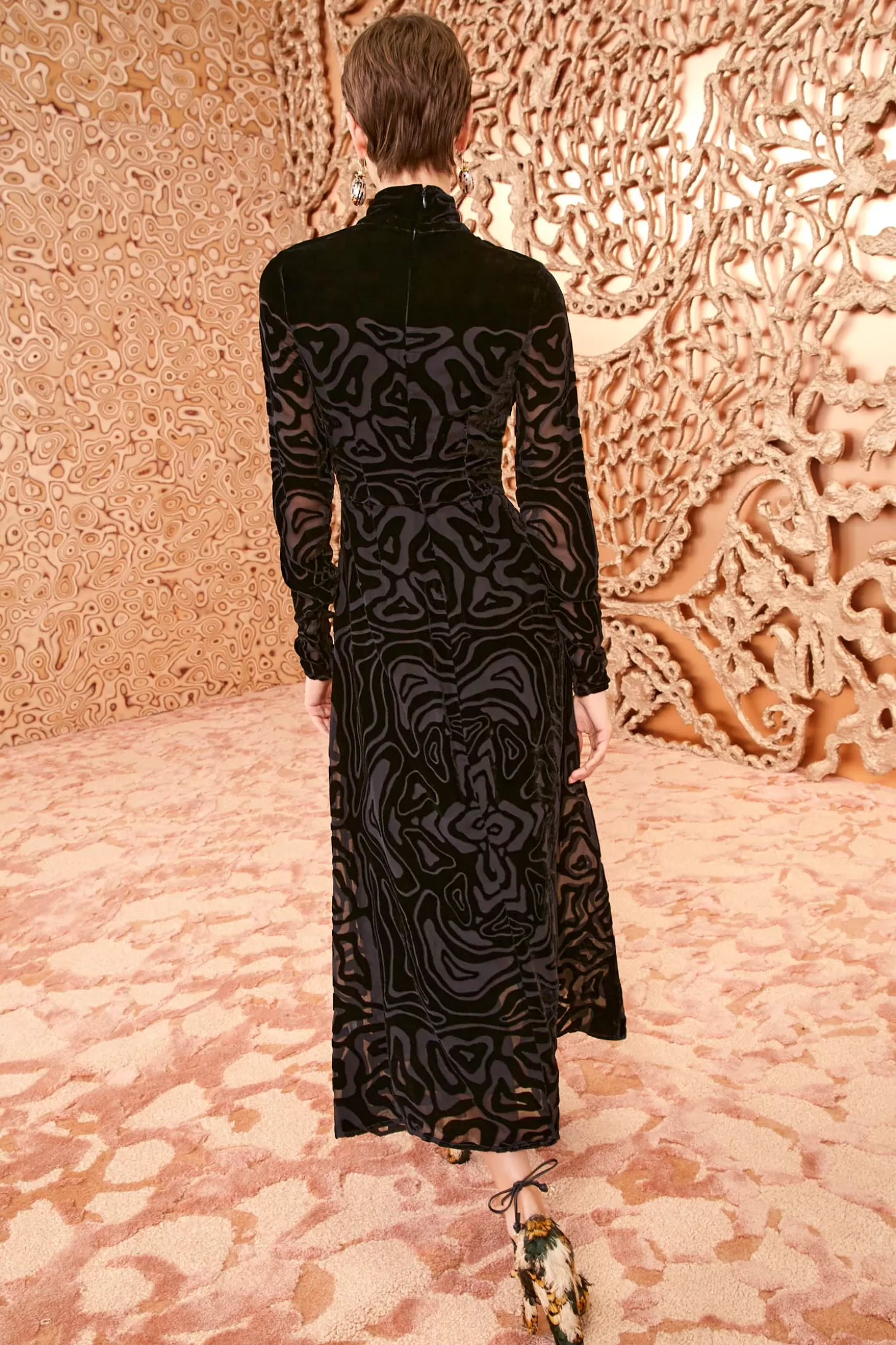 Sumptuous and artful, the Helena Dress is crafted from burnout velvet with a floral motif at the hem surrounded by wavy, animalesque patterns that dance throughout. This black style features sheer detailing, a high neckline, and unfurls to a figure-skimming silhouette that’s beautifully paneled. This event-ready frock is lined in the bodice and skirt and fastens with a concealed back zipper.