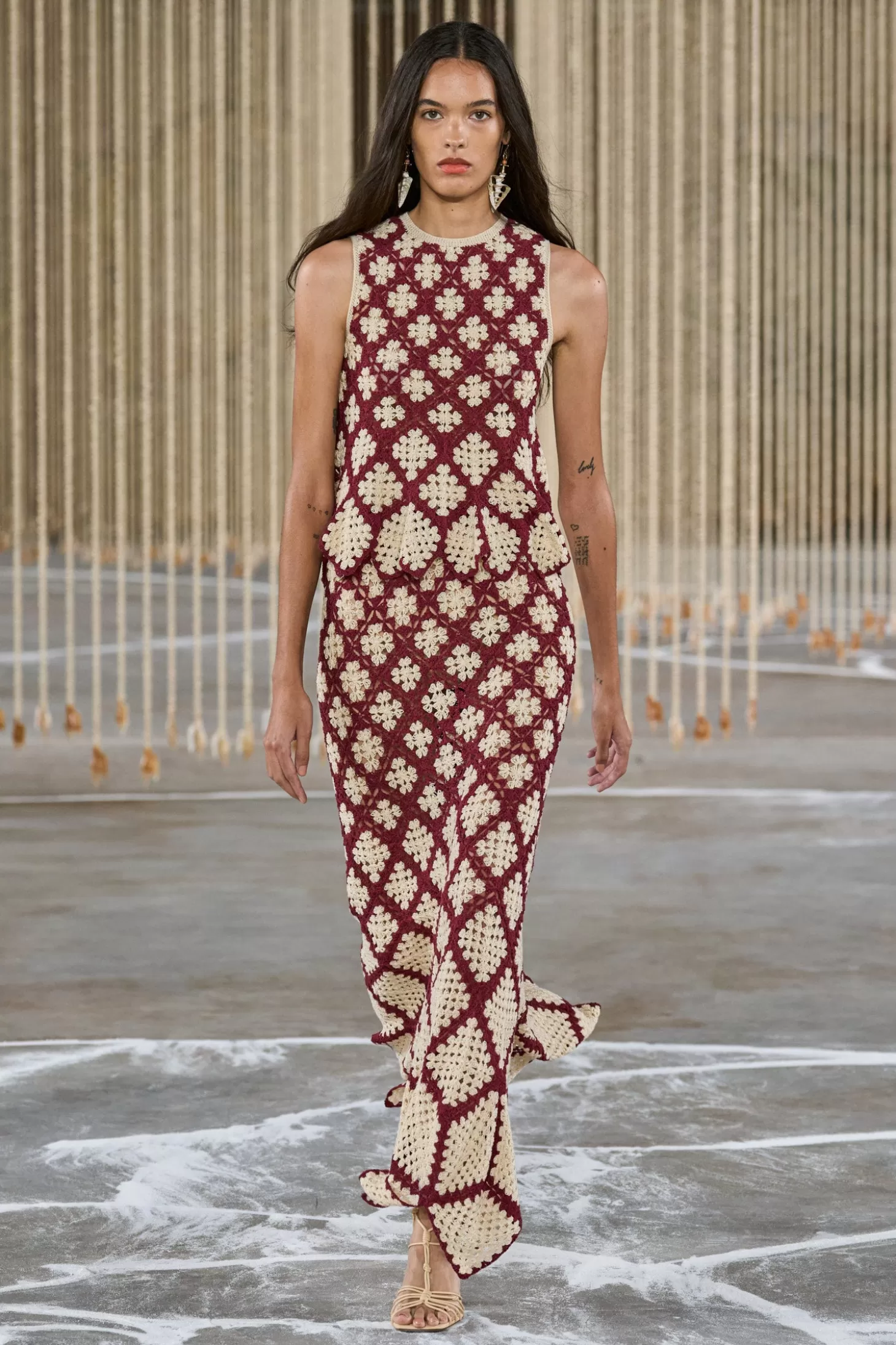 Featured in Look 32 of our Spring/Summer ‘24 Runway Show, the Summer Skirt is a future heirloom handcrafted by our longtime artisan partners in Peru–cotton yarn is hand-crocheted into squares that are then crocheted together into a beautiful geometric pattern. This midi silhouette features an asymmetric hem that creates fluttering movement and has lovely claret red and cream hues. It fastens with side buttons at the waist.