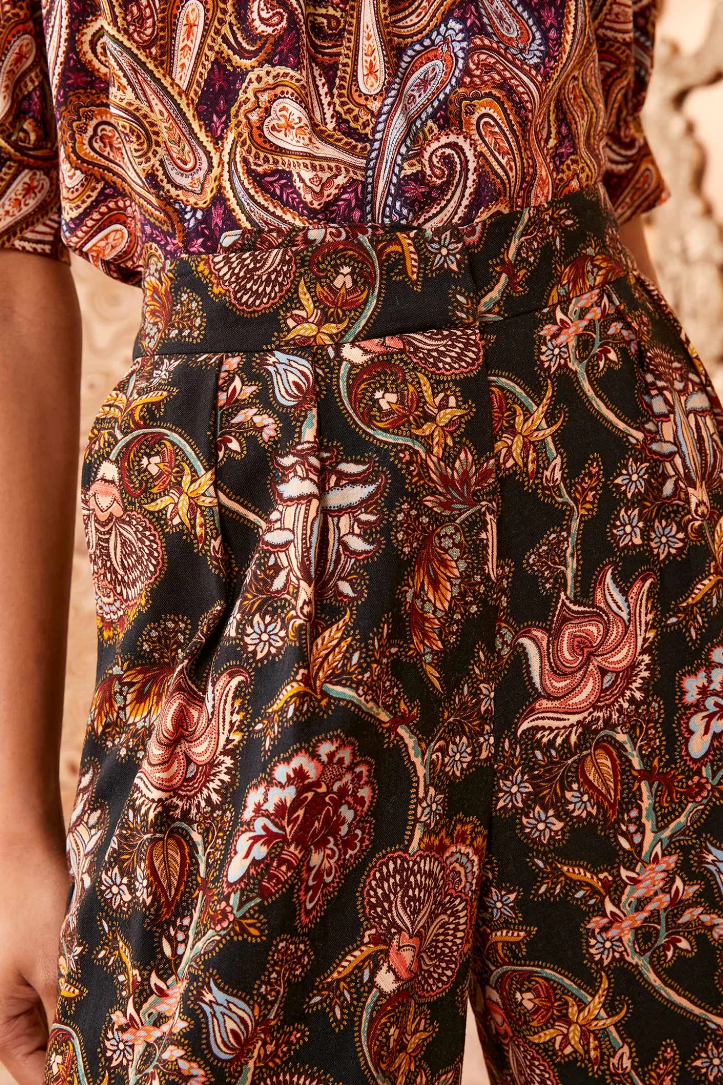 Tailored from wool twill, our Valencia Pant captivates with tumbling paisley botanicals, inspired by a classic French floral print. Featuring notes of peach and red against classic black, this wide-leg style is lightly pleated at the front for structure, has side pockets, and fastens with a hidden hook and zipper at the front. Complement this rich color story with our Suri Top.
