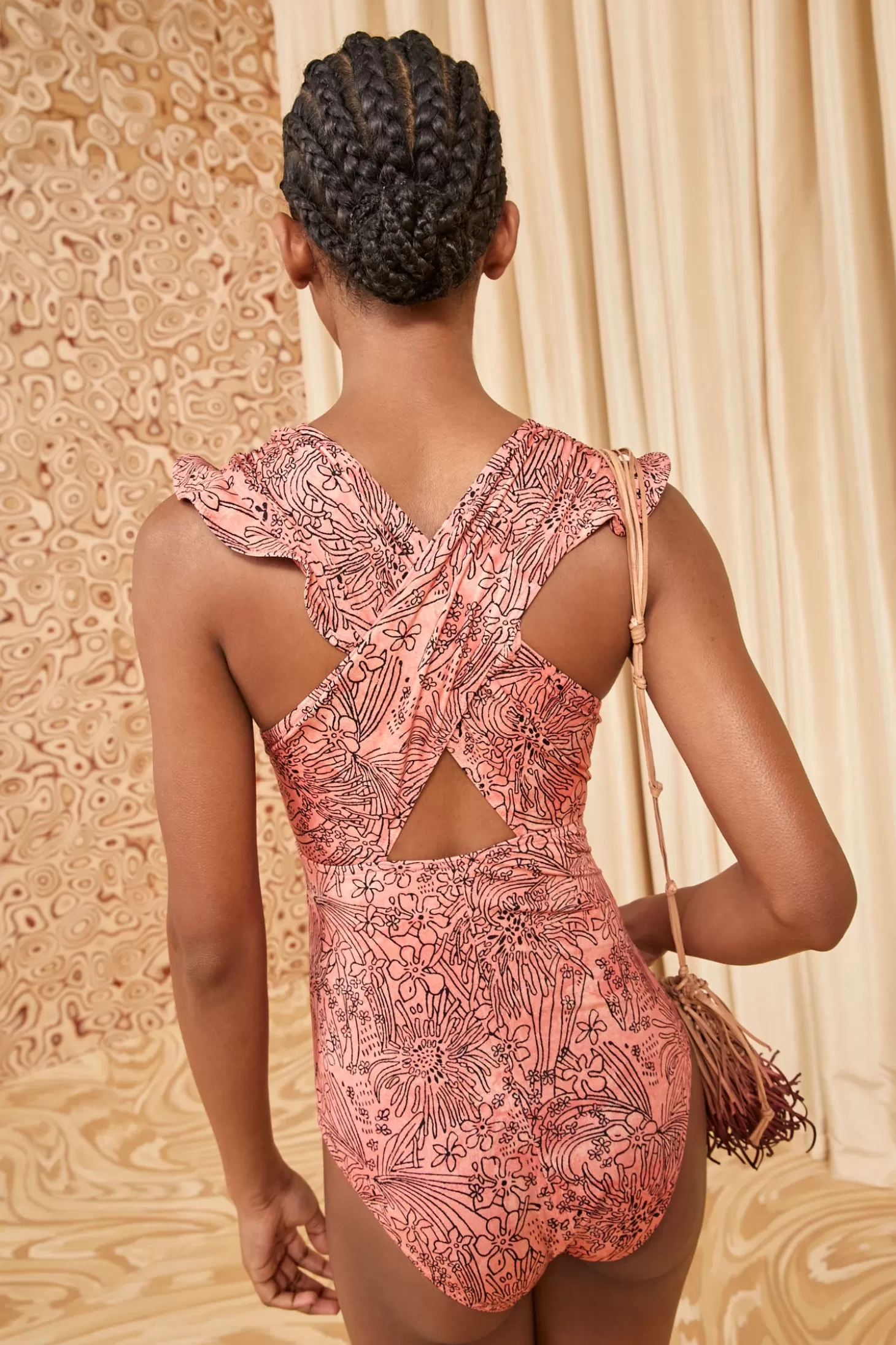The Pre-Fall 2024 Swimwear collection introduces the Antilles Maillot, a reimagined version of our favorite crisscross style, now adorned with subtle ruffles for a romantic touch. This coral-hued style is printed with our hand-drawn cosmos artwork set atop a painted background and has a full-coverage bottom.