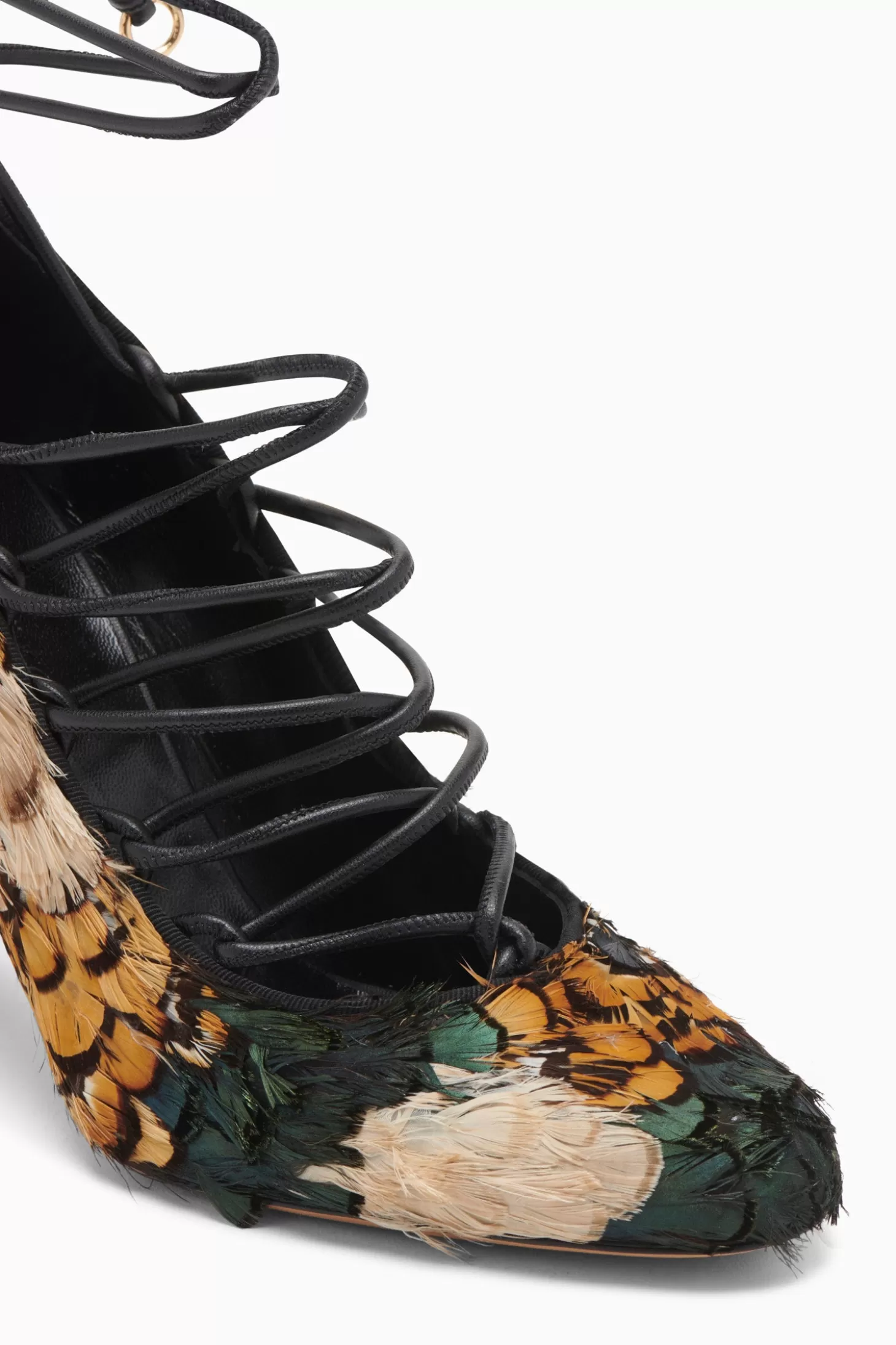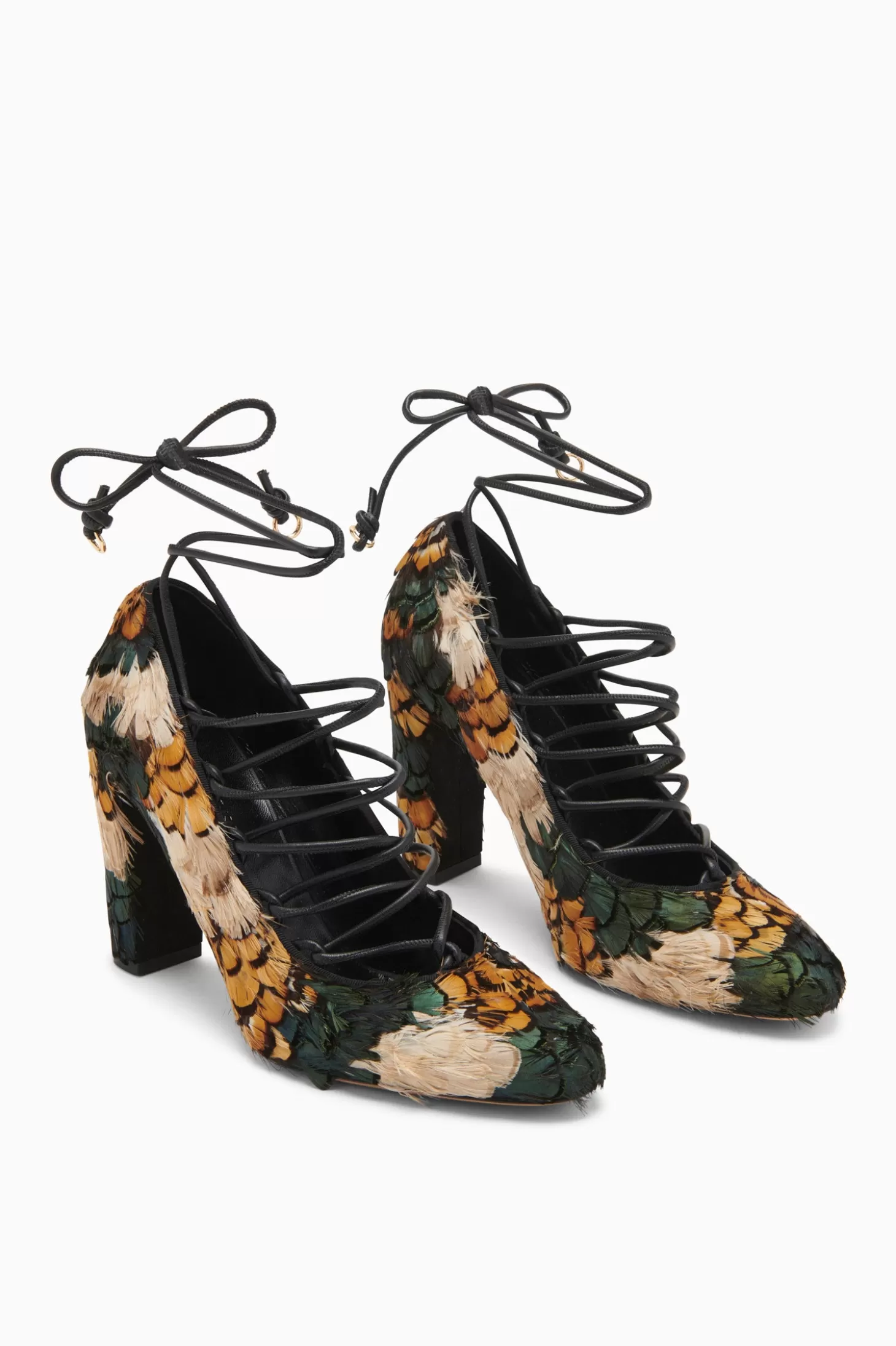 A key silhouette from our Autumn/Winter 2024 runway, the Rosalia is a stunning pump meticulously crafted in Italy with lush, hand-placed feathers. Alive with our seasonal gold and green hues, it rests on a sturdy, 95mm block heel and is secured with leather laces at the front. Our signature brass rings add a polished touch.