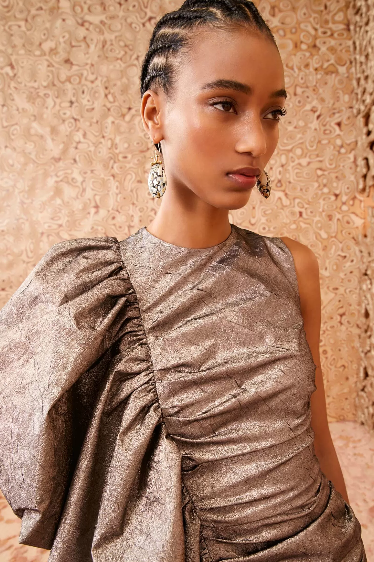 The Estella Dress from Look 14 of our Autumn/Winter ‘24 runway is made from crushed metallic taffeta—our beloved Italian fabrication that’s rich in structure yet with a featherlight feel. Arriving in flickering graphite gray, it has a mini silhouette with ample gathering that flatters the form and is finished with a voluminous, cascading ruffle. It fastens with a concealed back zipper.