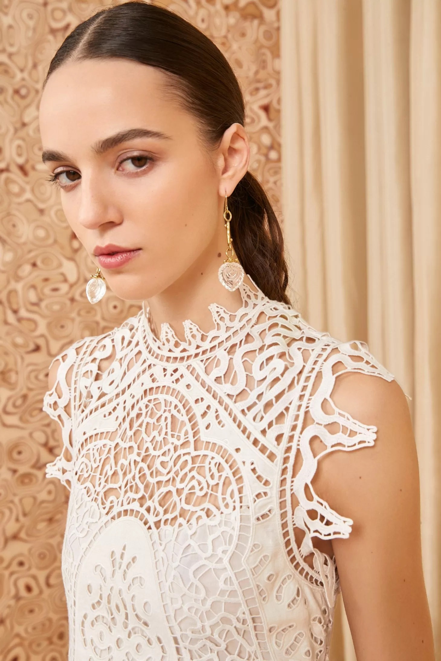 Featured in Look 4 of our Pre-Fall 2024 Lookbook, the Flora Dress is crafted from linen floral eyelets that are exquisitely patchworked with lace panels, conjuring a bold visual language of artful elegance. Perfect for a night out or special events, this captivating style features a long, midi-length and a flattering straight silhouette. It has a full lining and fastens with a concealed back zipper.