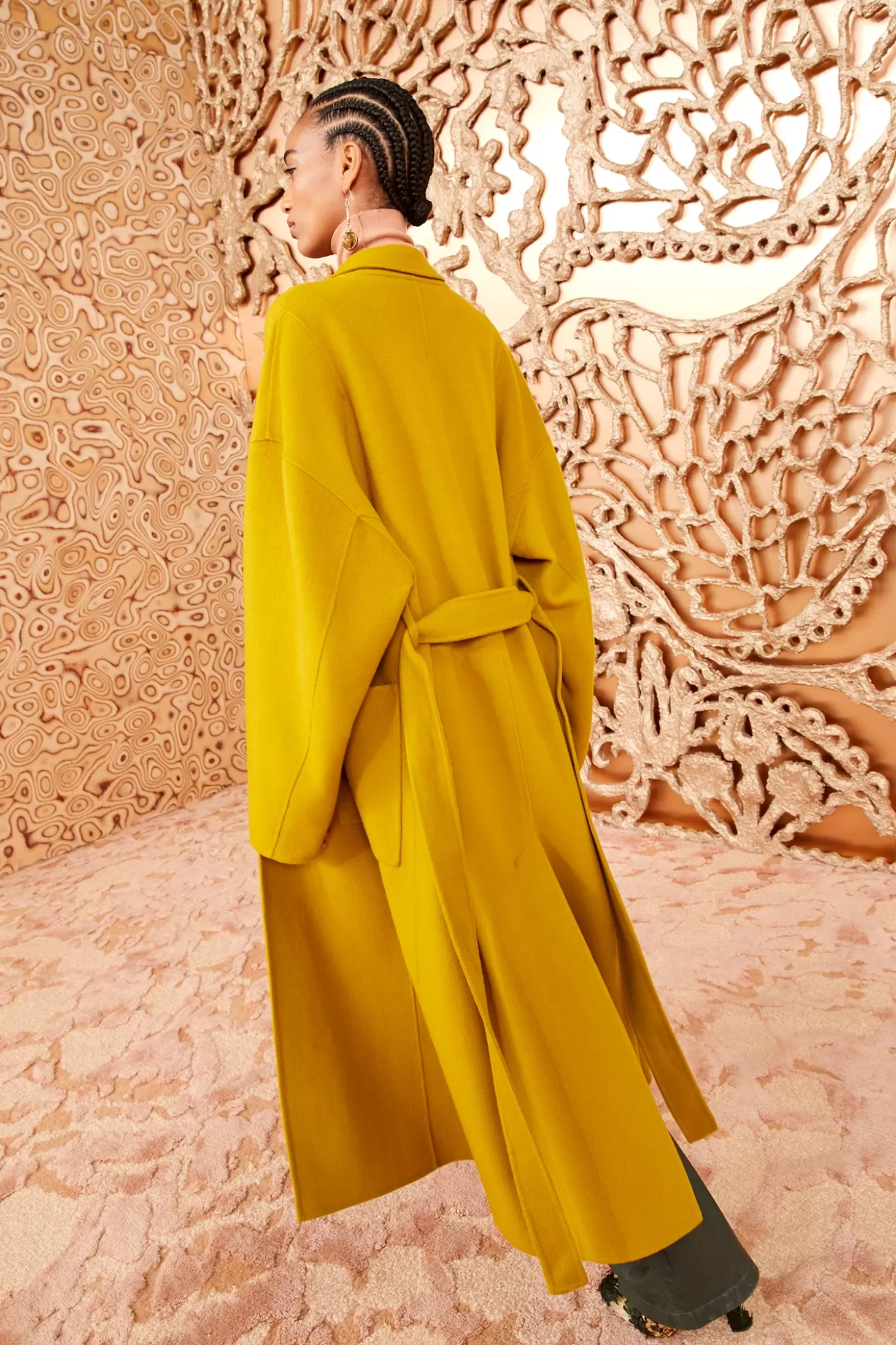 Showcased in Look 7 on the Autumn/Winter 2024 runway, our Harlow Coat is tailored from our beloved double-faced wool blended with cashmere in a saturated golden turmeric hue. This luxurious, single-breasted style features dropped shoulders, deep pockets, and a matching belt that cinches the silhouette.