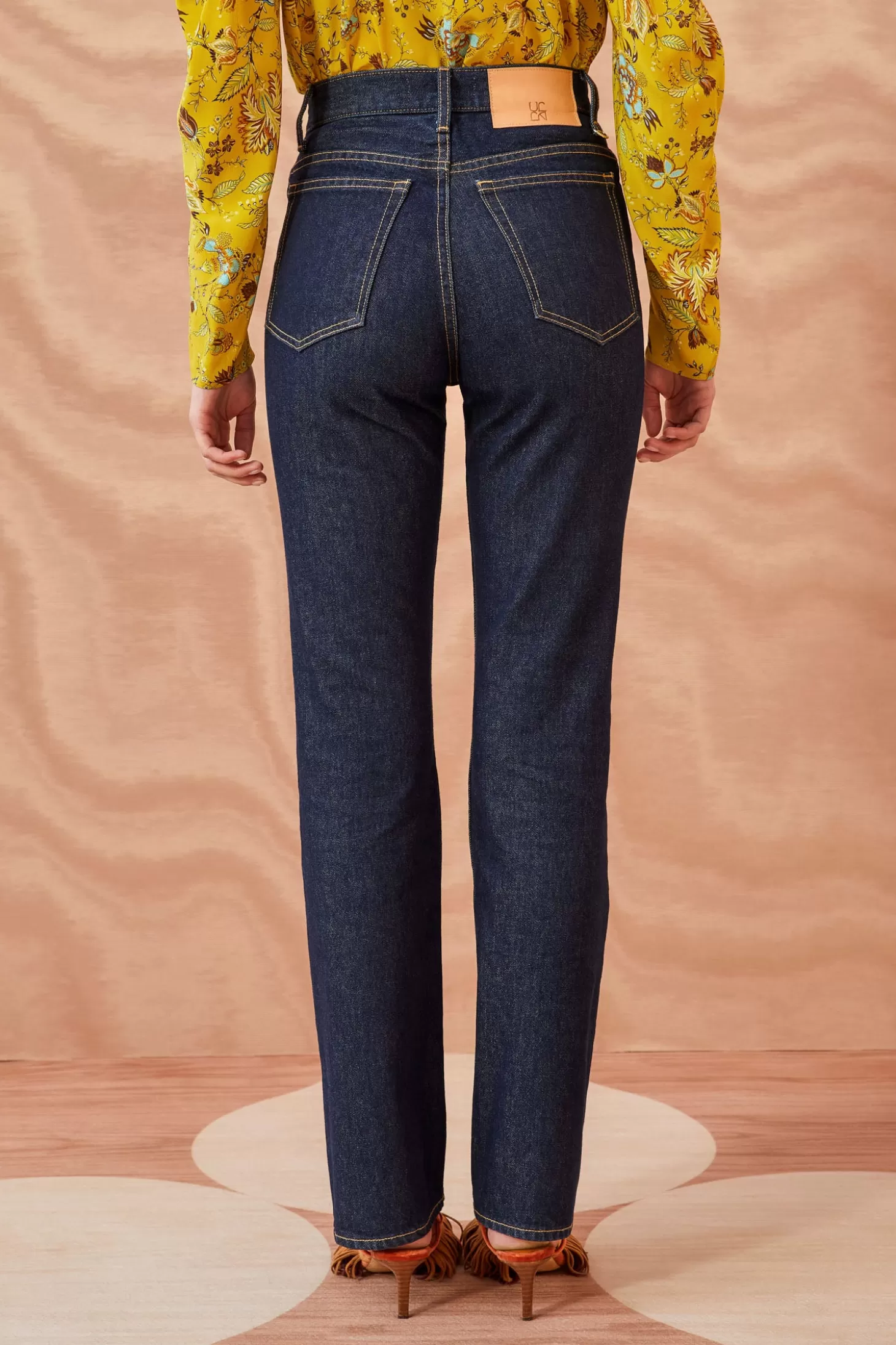 The Agnes Jean is one of our iconic styles of our inaugural denim collection, handmade in Los Angeles. This denim jean silhouette features a straight leg, high-waist and elegant, clean lines, arriving in deeply-hued Tigris. This jean is cut in non-stretch denim with a leather logo-embossed waistband patch and a hand-hammered ring attached to the back belt loop. Each style is designed to perfectly complement the silhouettes of every ready-to-wear collection.