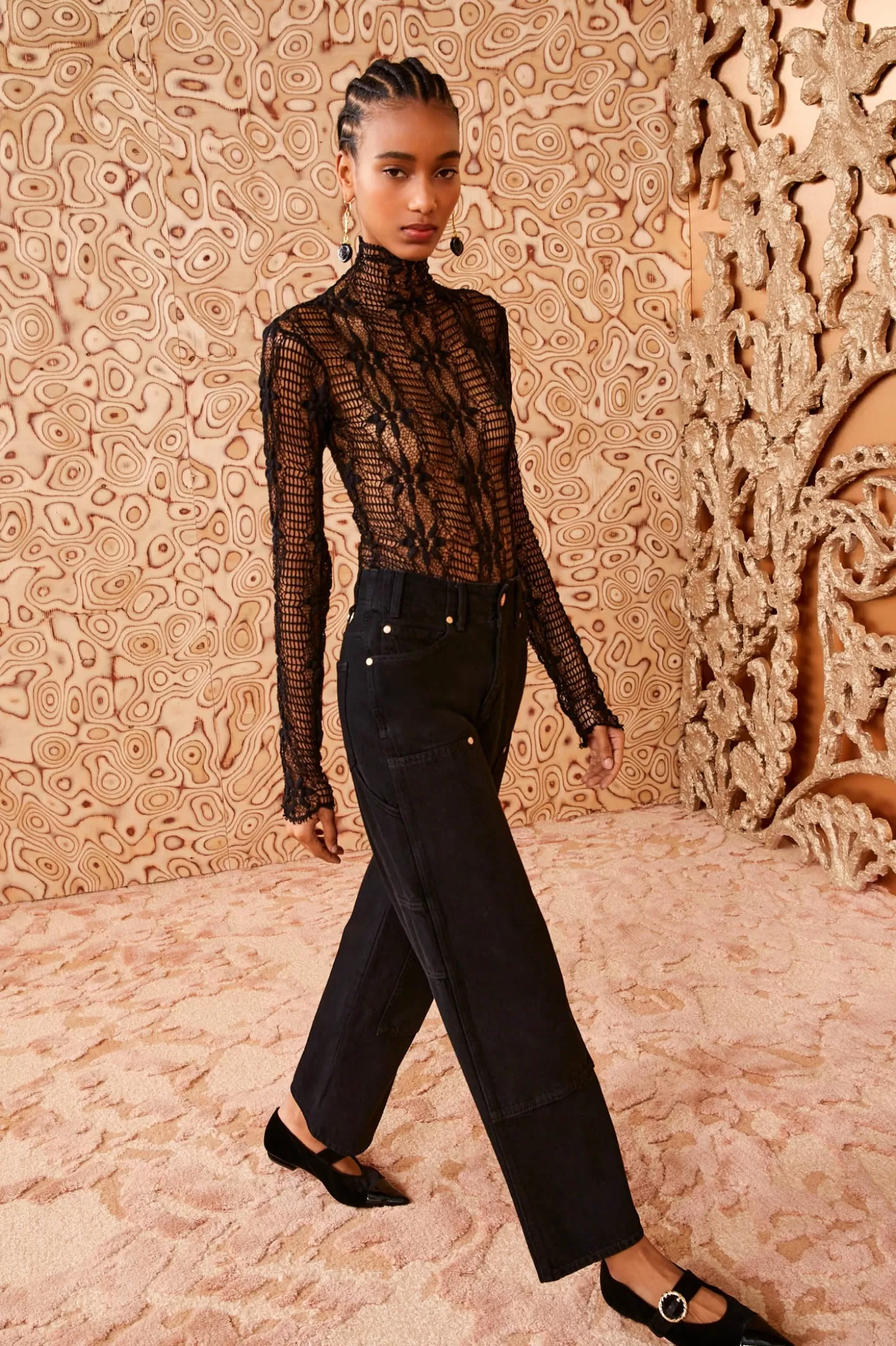 Featured in Look 15 on the Autumn/Winter 2024 runway, our black Amal Top is crafted from stretch Italian cotton lace with linear graphic florals adorning its length. Perfect for layering or wearing on its own, this fitted beauty features a mesh background, high neckline, and delicately scalloped hem. This fully sheer style is unlined and fastens with a concealed back zipper.
