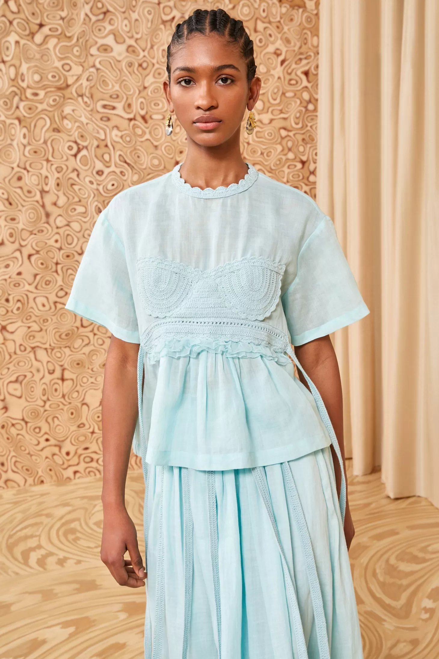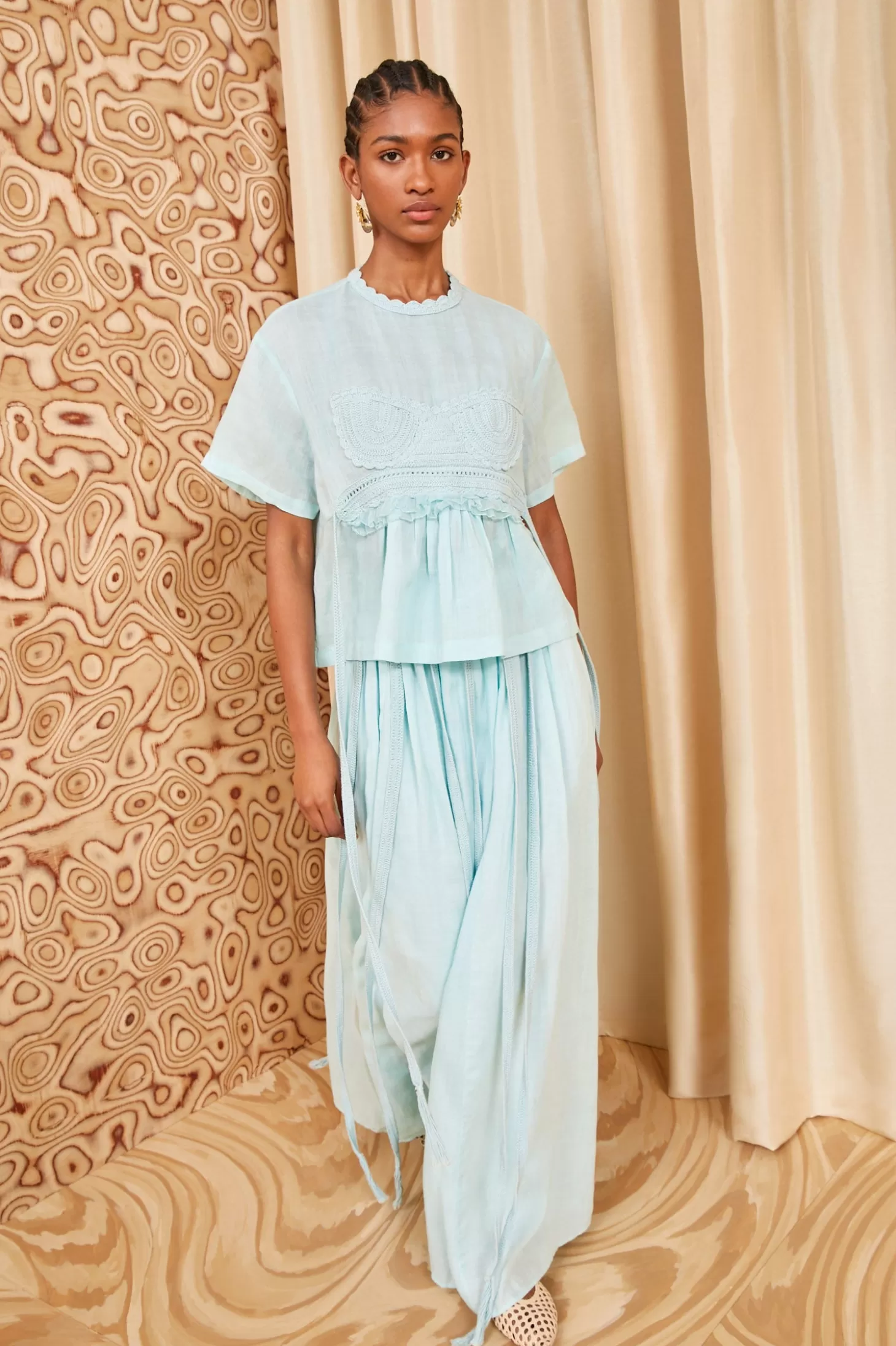The Cari Top is a modern and feminine T-shirt crafted from ramie, an eco-friendly fabric made from plant fibers that’s soft and lightweight. Tinged a delicate light blue, this loose-fitting style is appliquéd with hand-crocheted cotton that’s carefully engineered to outline the form for a perfect fit. The waist ties can be tied to cinch the silhouette, or left swaying for a unique tassel-like effect. It fastens with a buttoned keyhole at the back.