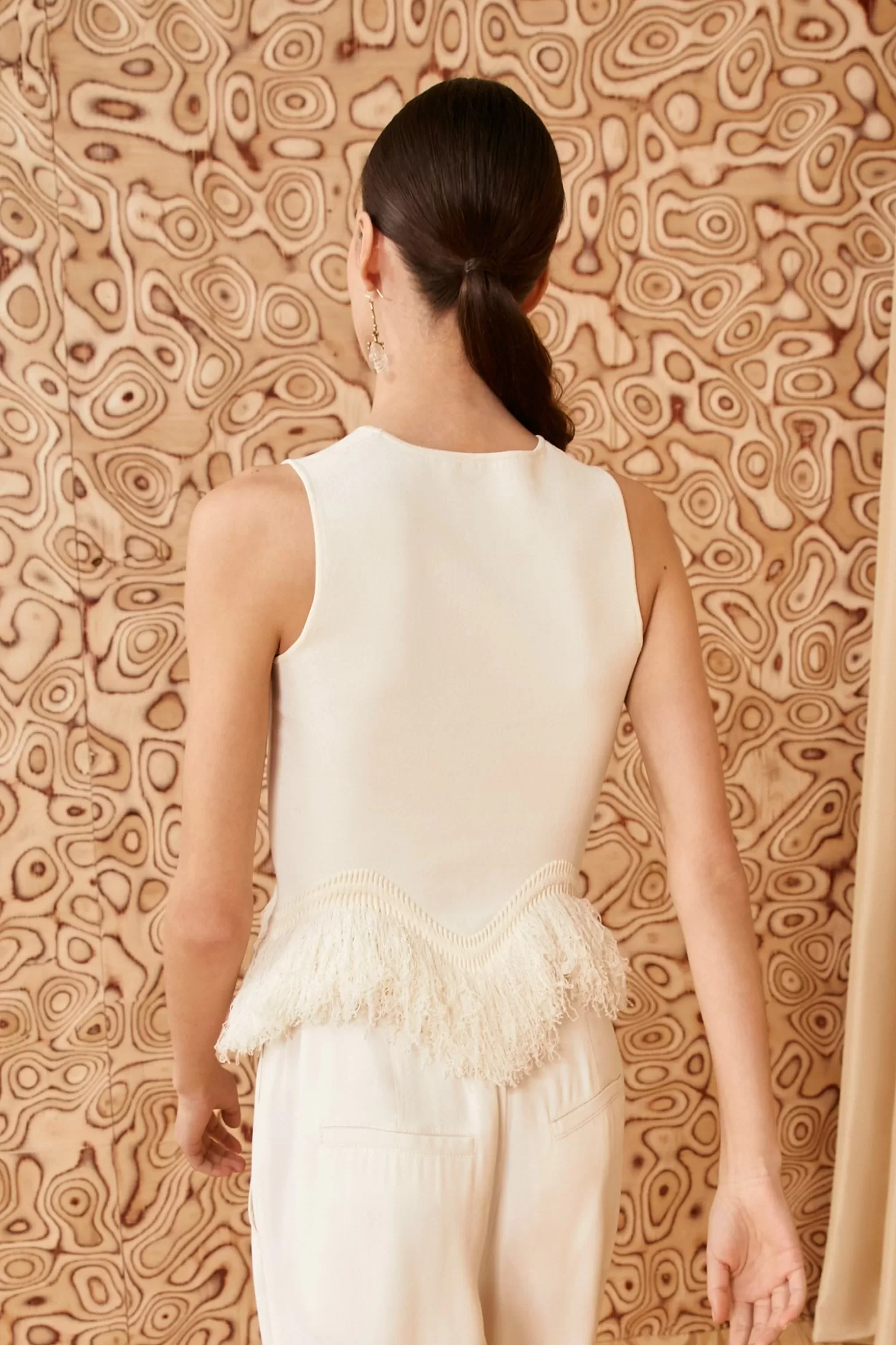 Artfully elegant, the Koa Top is spun from our plush compact knit into a sleek, sleeveless silhouette with looped hand-cut fringe at the hemline. It’s designed to have a slim fit and pairs beautifully with our coordinating Paulina Skirt.