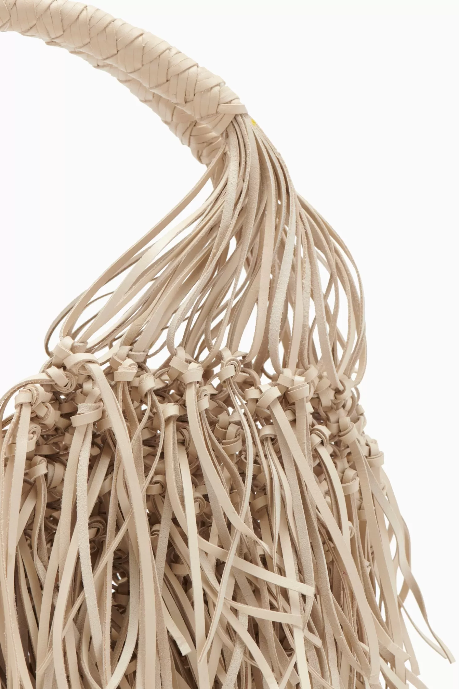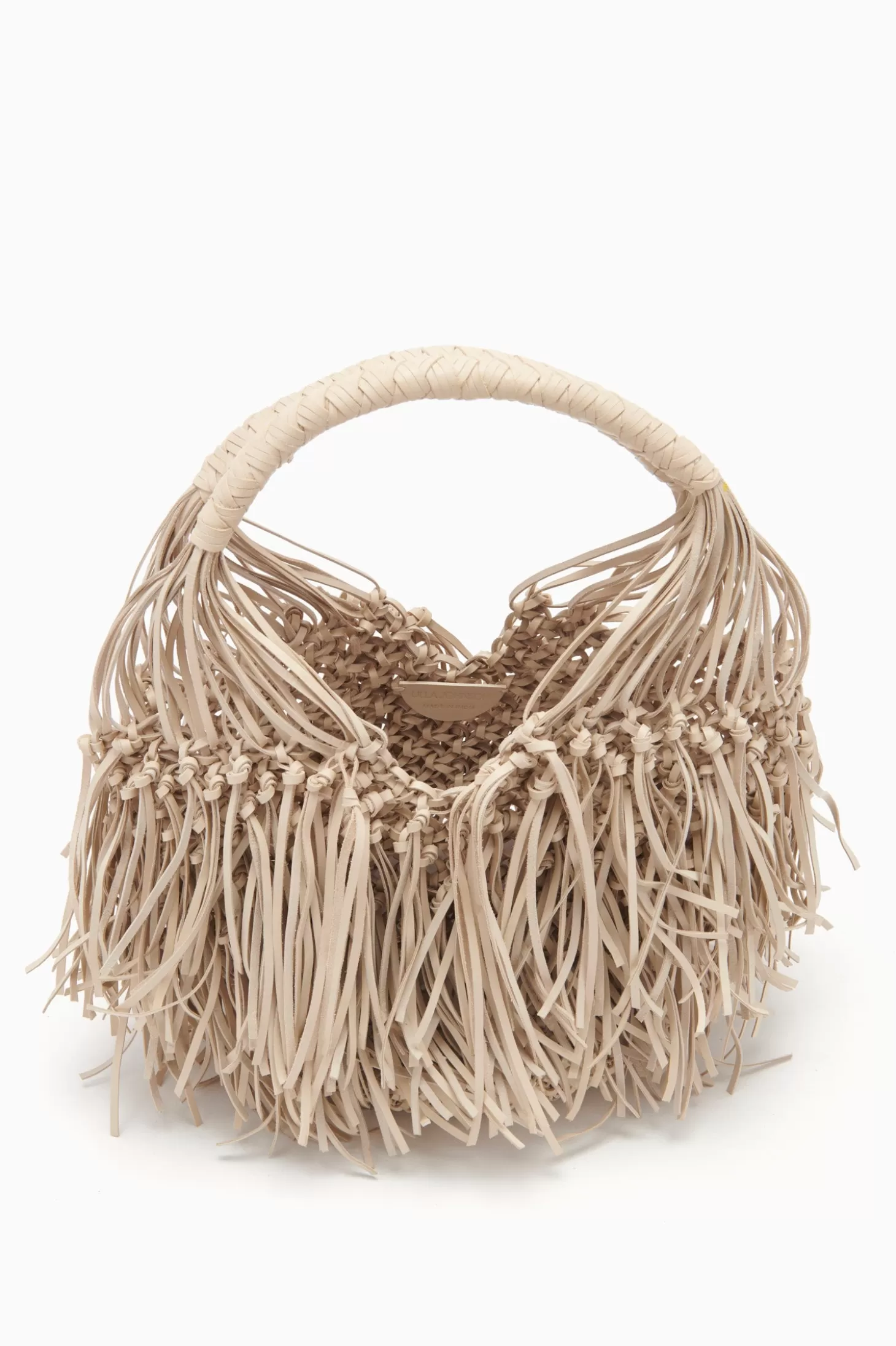 The Valeria Small Fringe Hobo is skillfully hand-woven from cream macramé leather with a playful explosion of fringe that’s carefully added by hand. The handle is reinforced with leather weaving for comfortable wear.