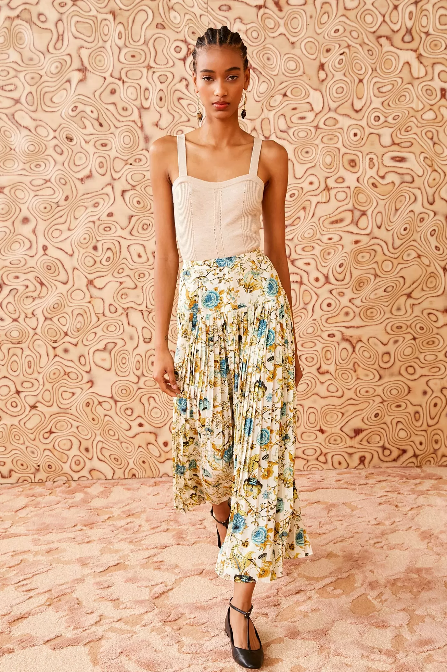 Featured in Look 2 of our Pre-Fall 2024 Lookbook, the Ella Skirt is a flowy midi style crafted from our forever-favorite silk crepe de chine that’s alive with botanicals inspired by 19th century French florals. Fixed at the waist, this cream and blue lovely features dimensional pleating that imbues the silhouette with graceful movement. It fastens with a side zipper.