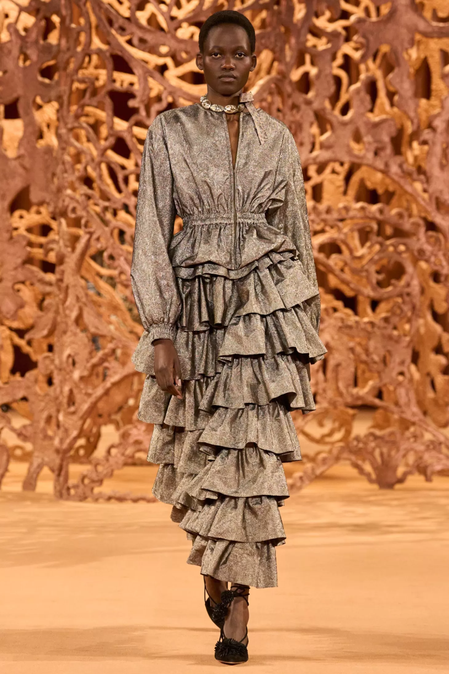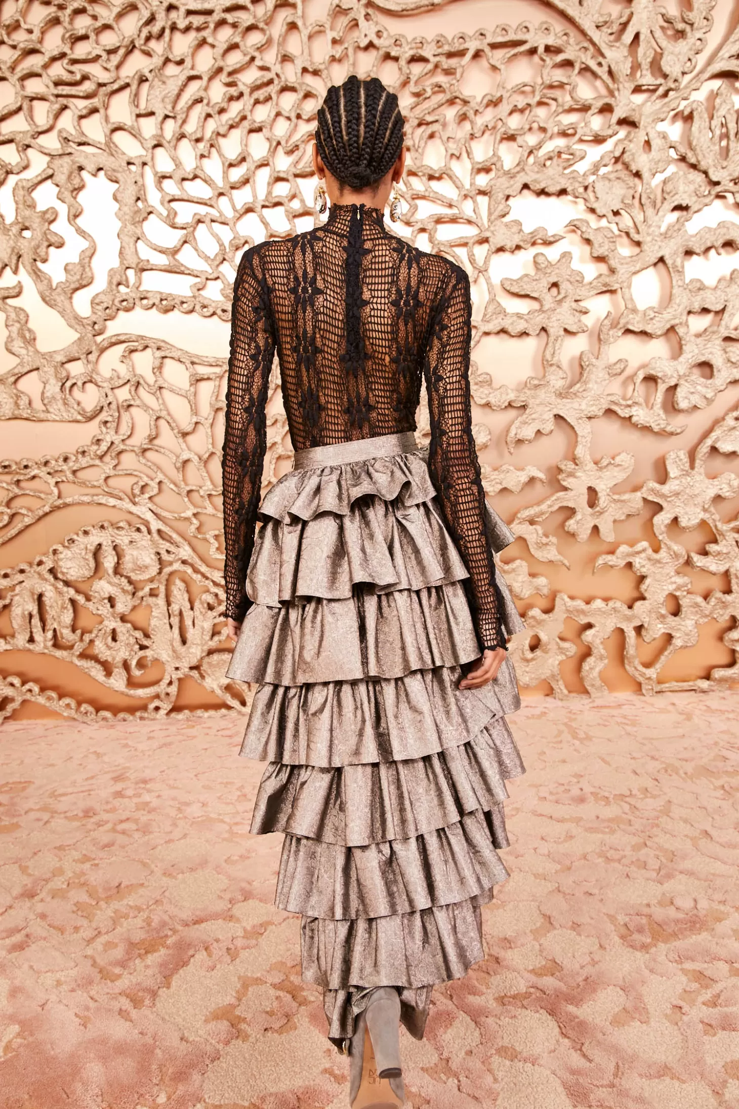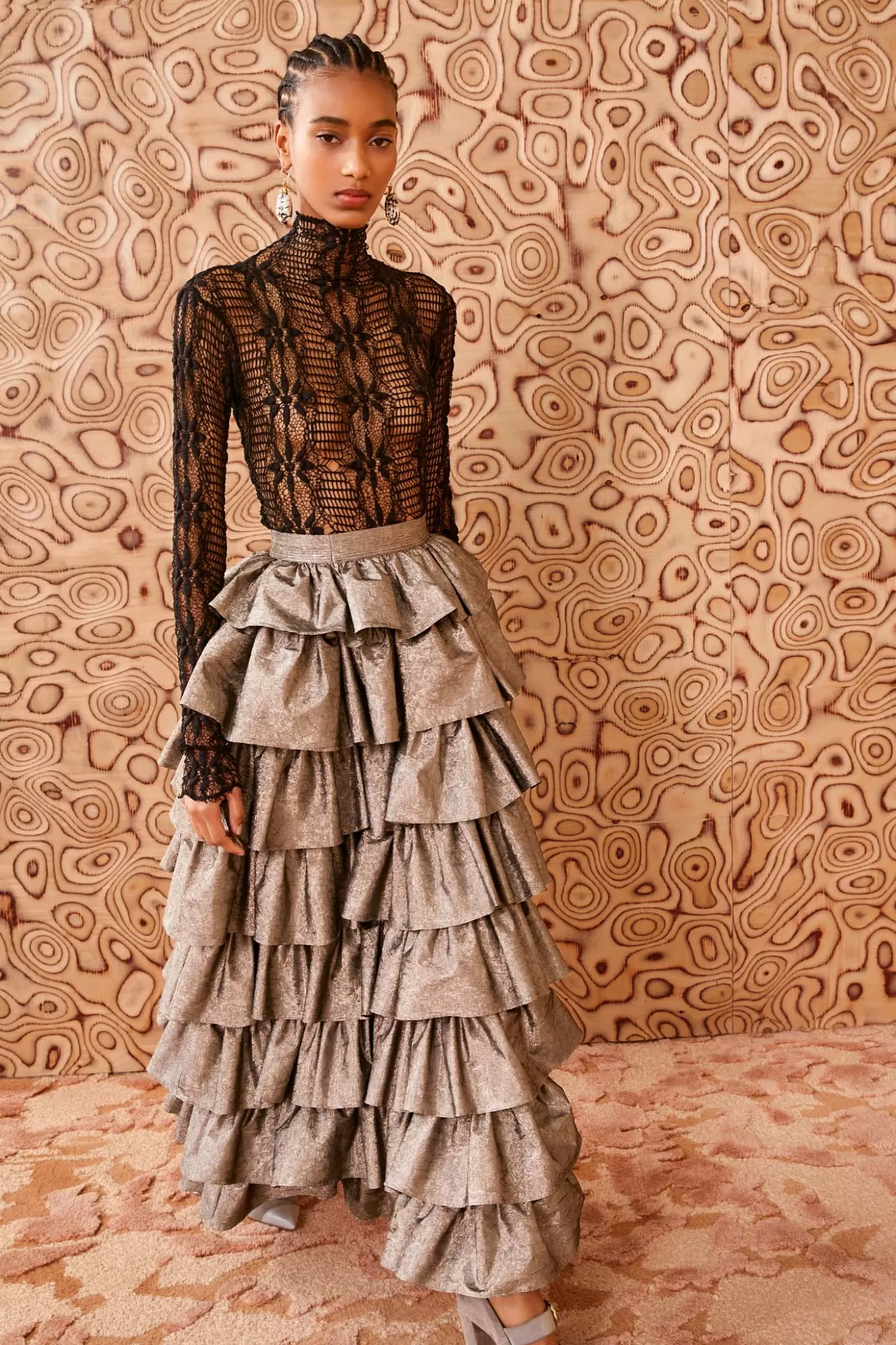 Fluttering down our Autumn/Winter ‘24 runway in Look 17, the Flora Skirt is masterfully crafted from our beloved crushed metallic taffeta—a featherlight fabrication woven in Italy from lurex yarns that maintain its beautiful drape. Arriving in luminous graphite gray, this silhouette is adorned with a burst of tiered ruffles that float to the ankle-grazing hem. It has a fixed waist and fastens with a concealed side zipper.