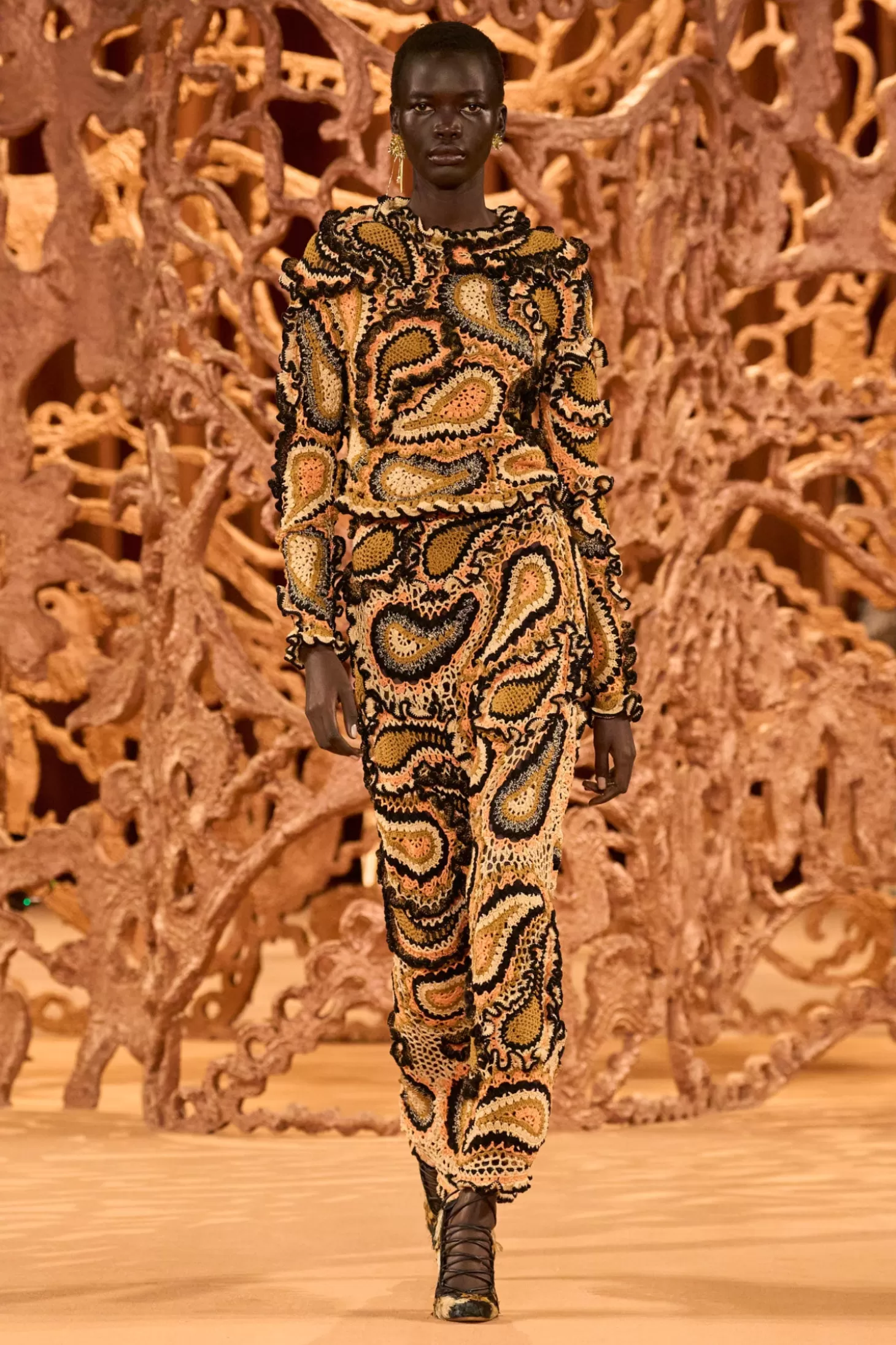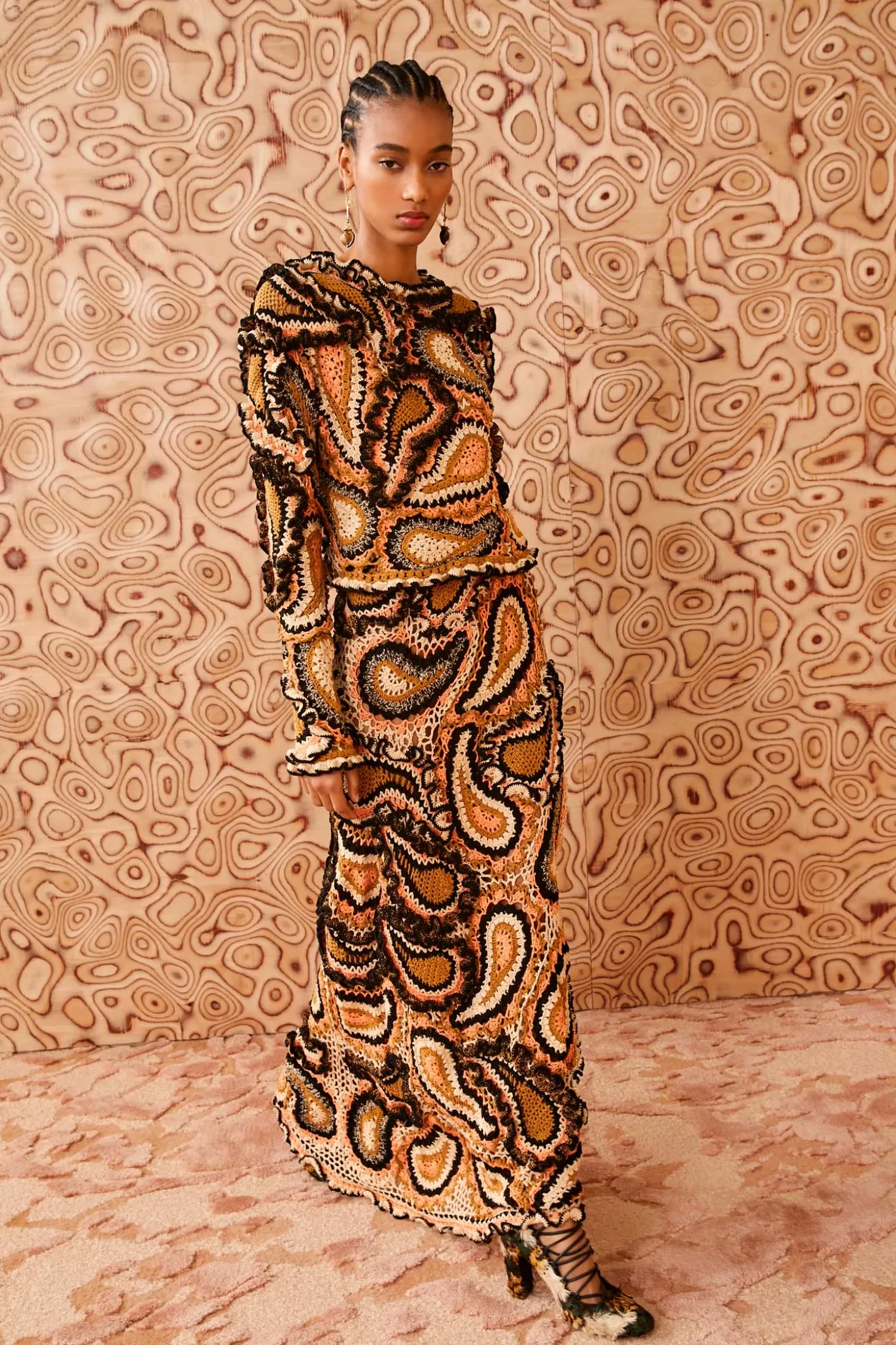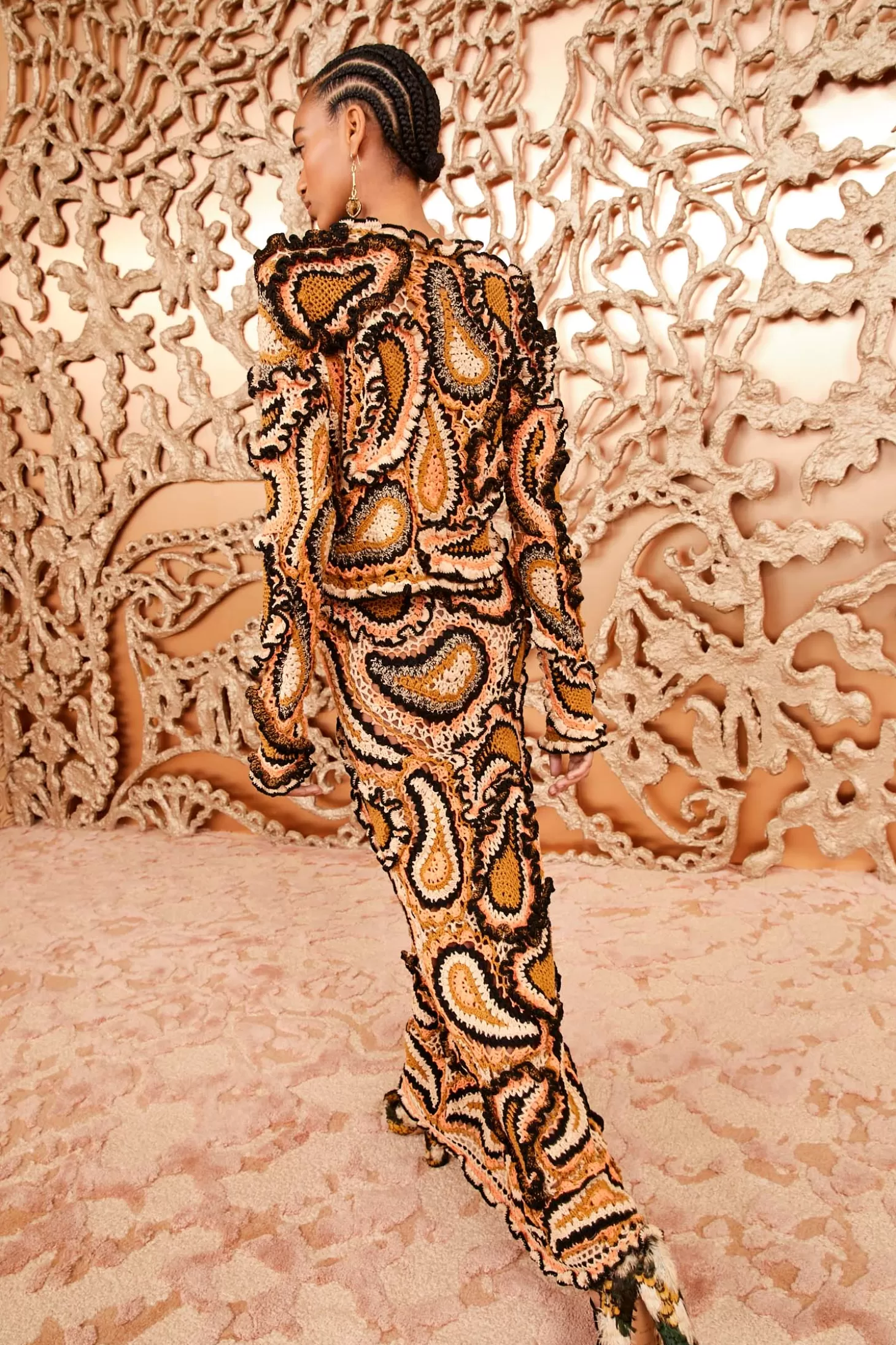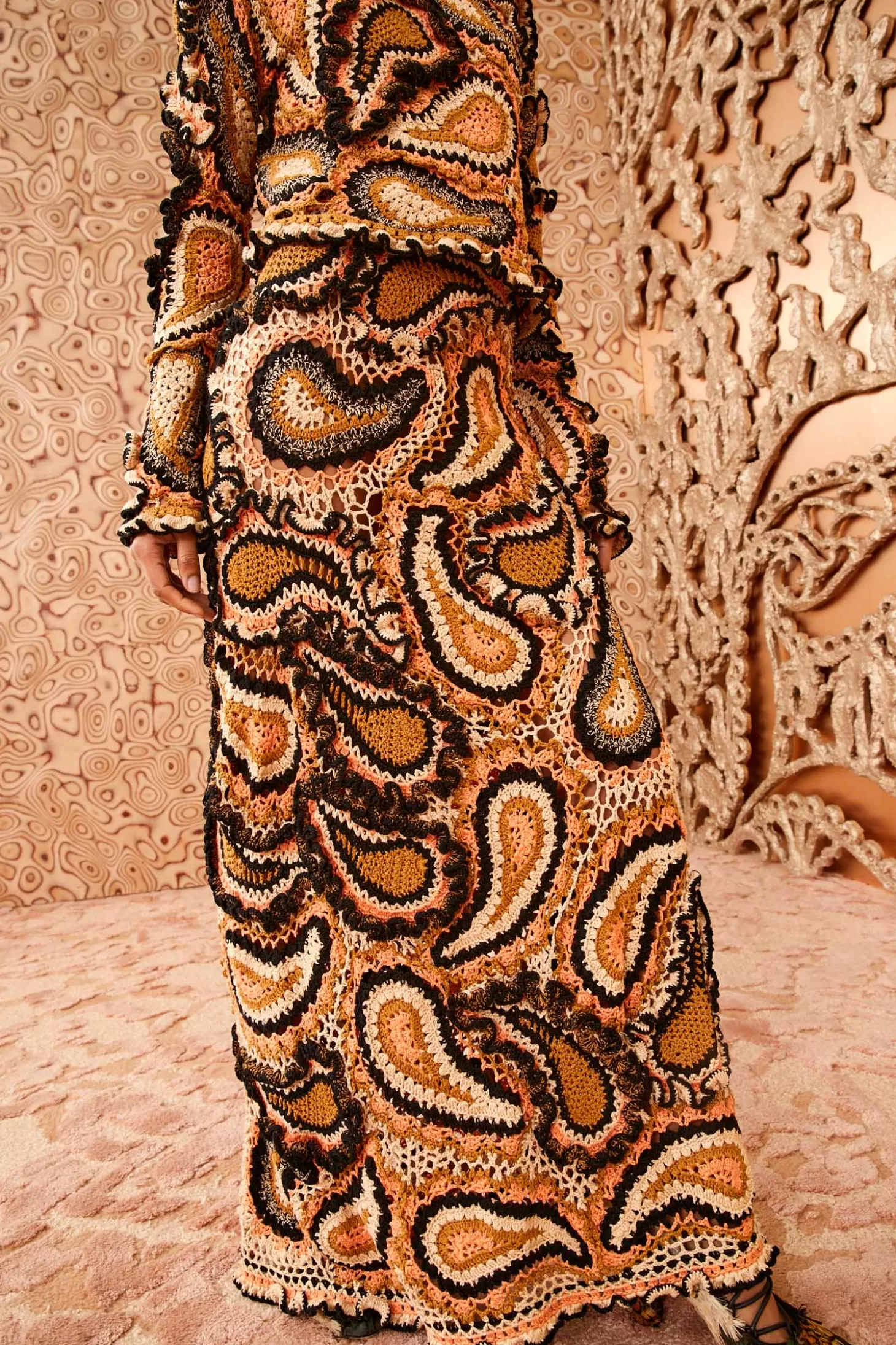 Featured in Look 55 of our Autumn/Winter ‘24 runway show, the Ina Skirt continues our commitment to handcrafted traditions. Made from Italian cotton, it features paisley patches that were handmade separately, and then crocheted by hand into this mesmerizing dimensional pattern. This unique future heirloom unfurls to a beautiful ankle length, has playful ruffled edges, and effortlessly pulls on.