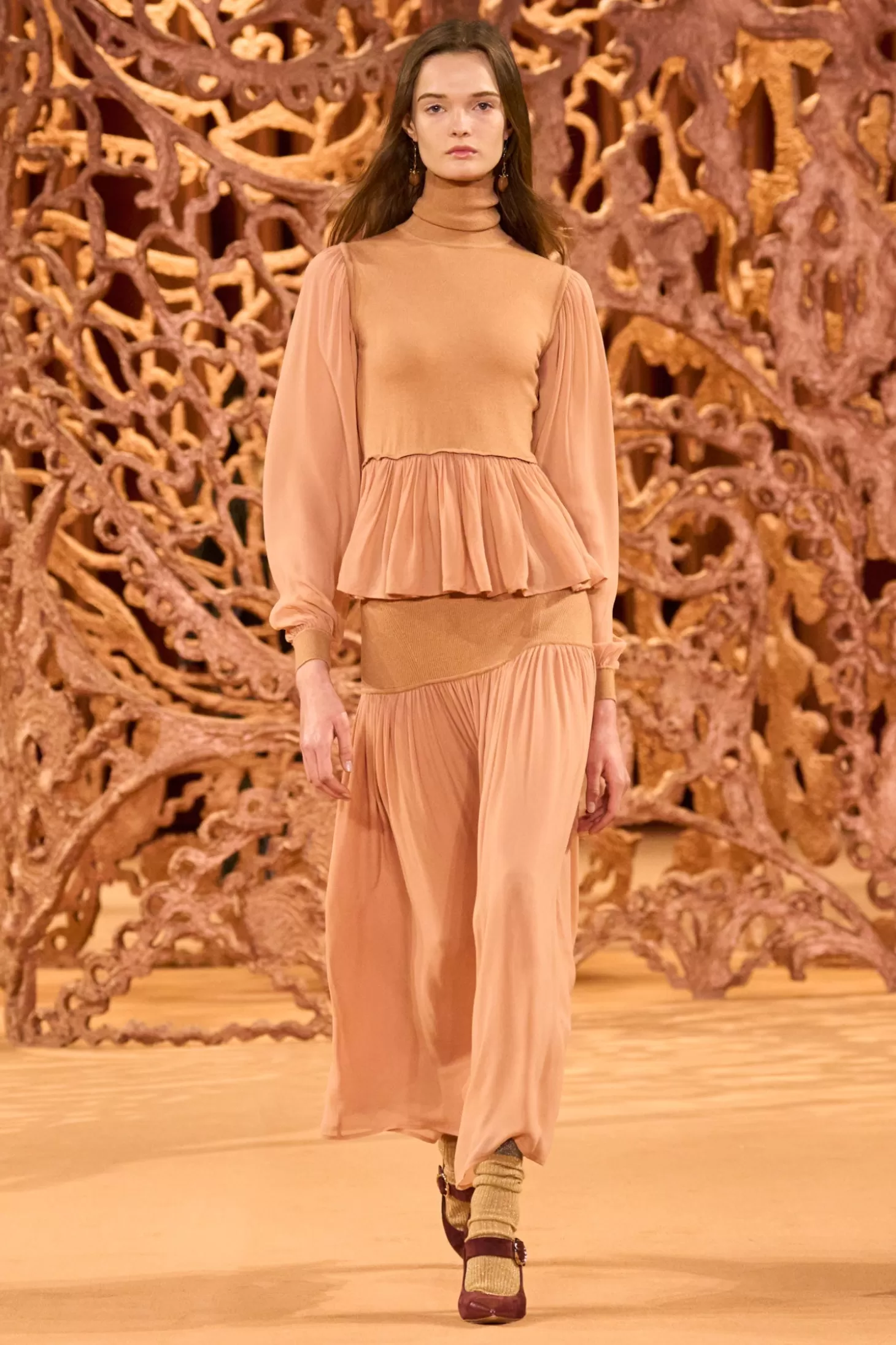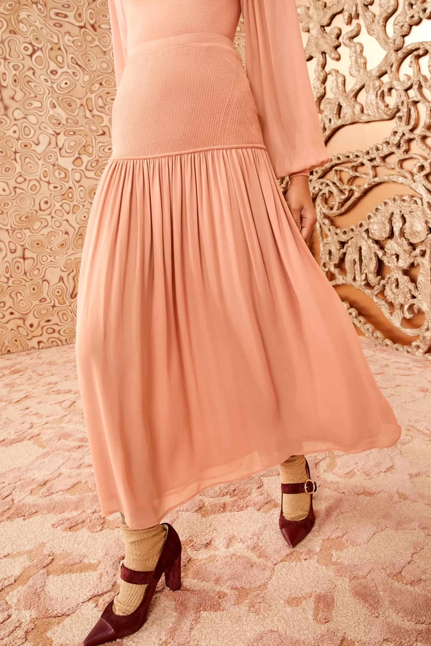 Debuting in Look 2 on our Autumn/Winter 2024 runway, the Miya Skirt arrives in an ethereal blush hue that’s inspired by the paintings of American artist Milton Avery, whose soft and dynamic palette is featured throughout our collection. It’s knitted at the waist from luxe merino wool and silk and unfurls to a crepe-chiffon skirt that adds romantic movement. This midi-length style pairs beautifully with our Liana Turtleneck.