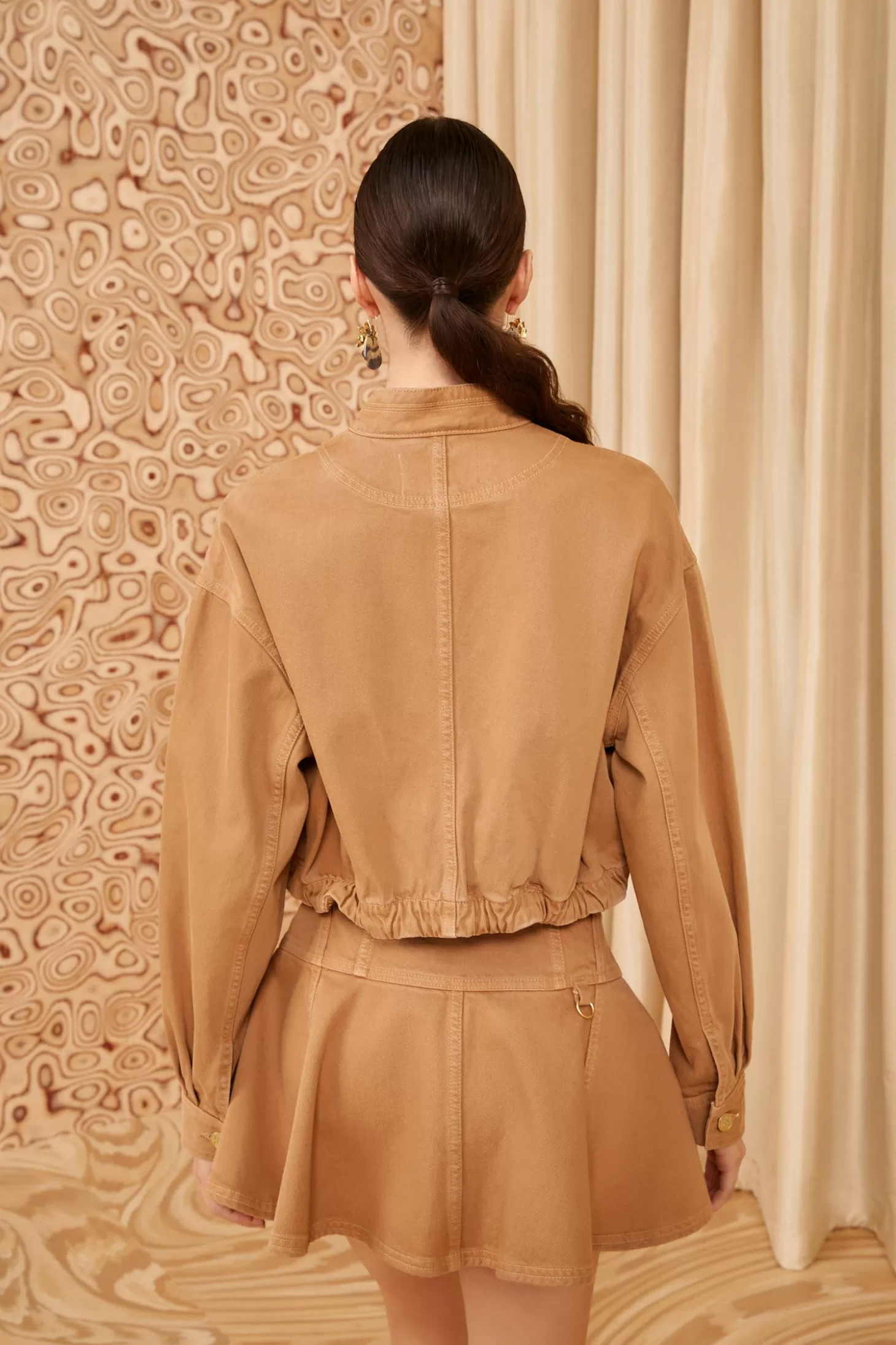 Featured in Look 37 of our Pre-Fall 2024 Lookbook, our Alessa Jacket is a new, bomber-inspired take on the classic denim jacket arriving in our warm, khaki-hued Tangier wash. This elegantly sportif style has an elastic band at the bottom and a cropped silhouette with voluminous sleeves. It has patch pockets with rivets and fastens with a zip front closure.