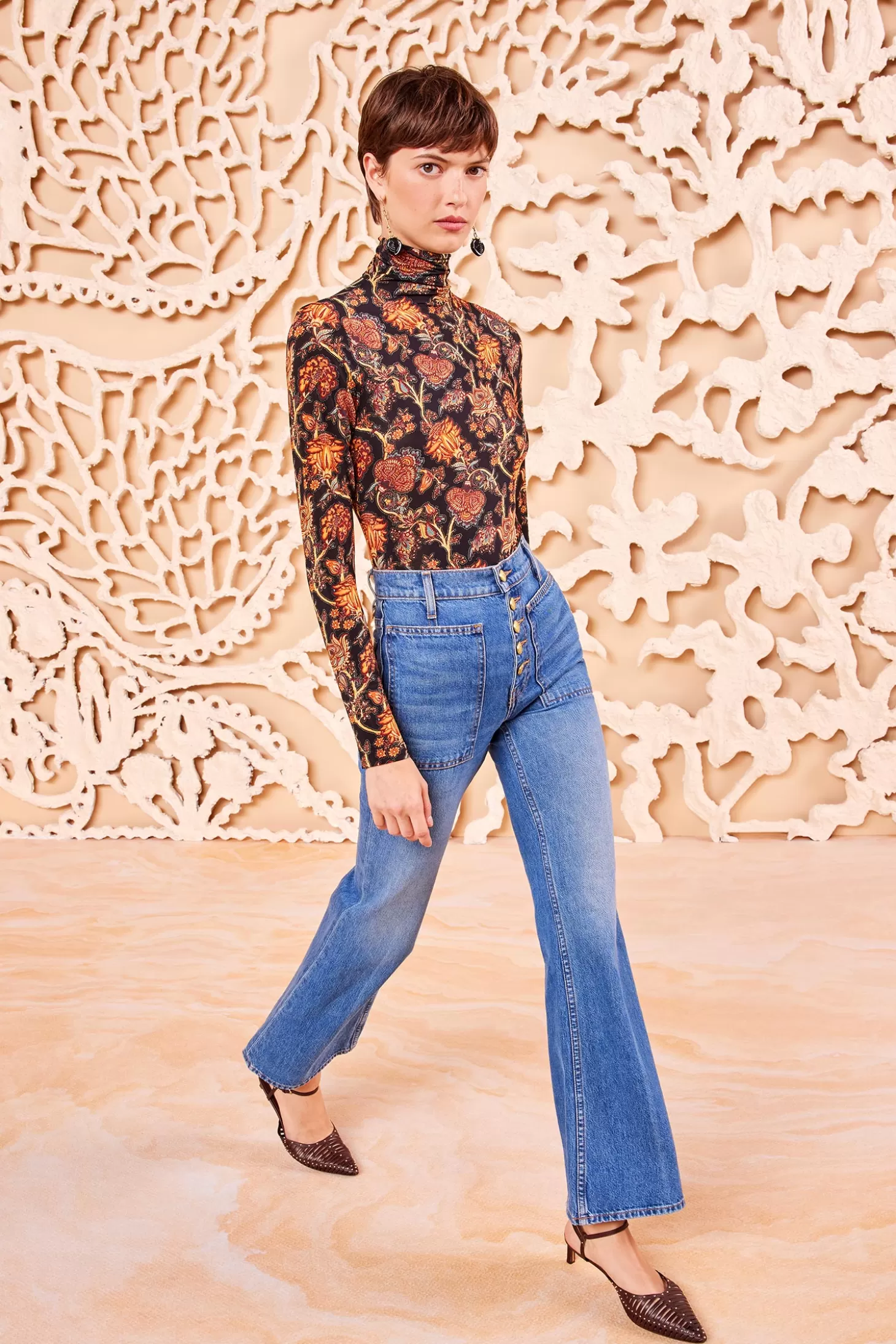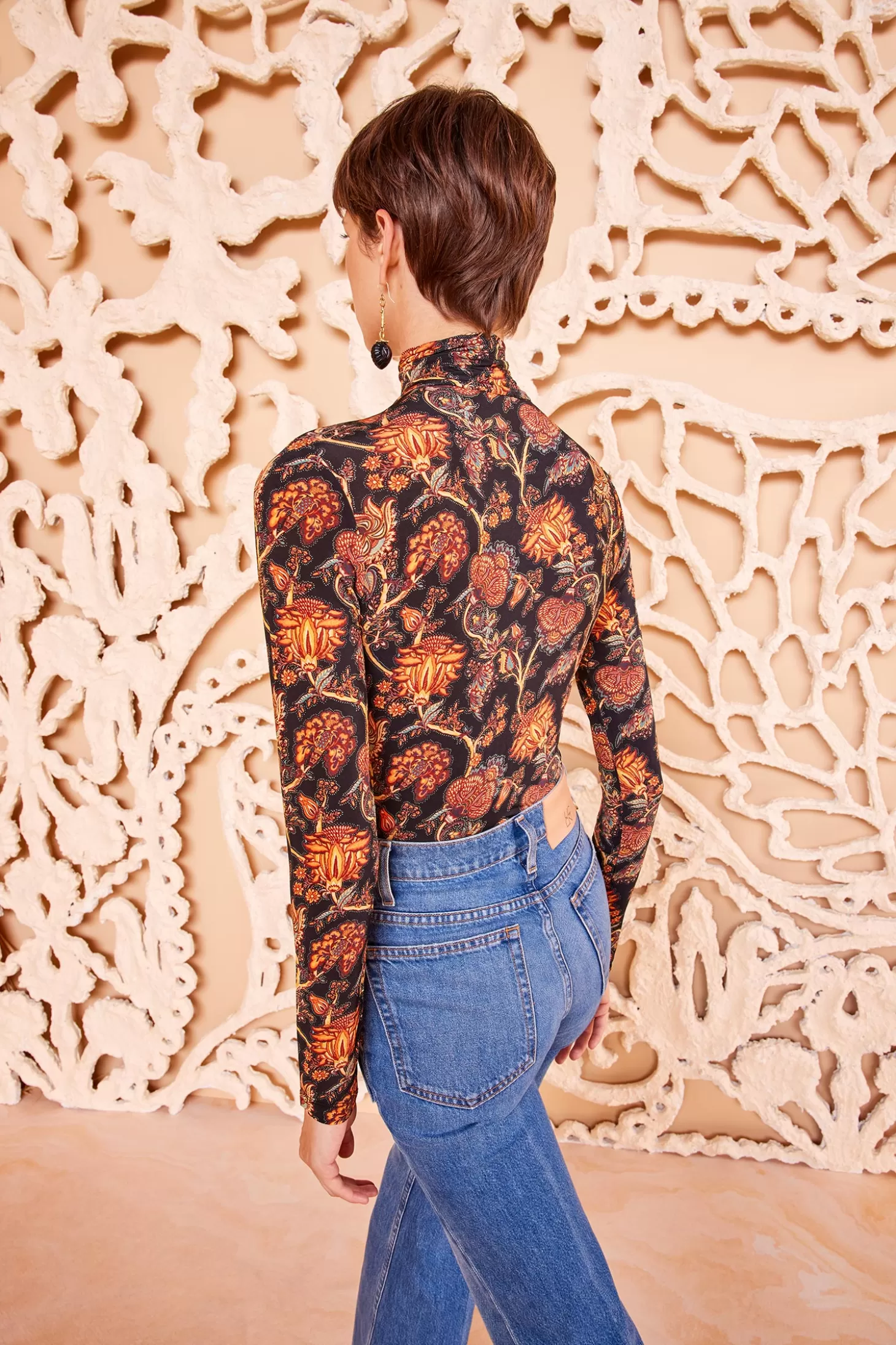 Our Aurelia Turtleneck in lightweight tricot jersey is a forever favorite silhouette, printed in a mesmeric blend of paisley botanicals inspired by vintage French florals. Blooming with orange and red hues against classic black, this long-sleeve top has a close fit that makes it perfect for layering or wearing on its own, while the high neck adds a touch of elegance.