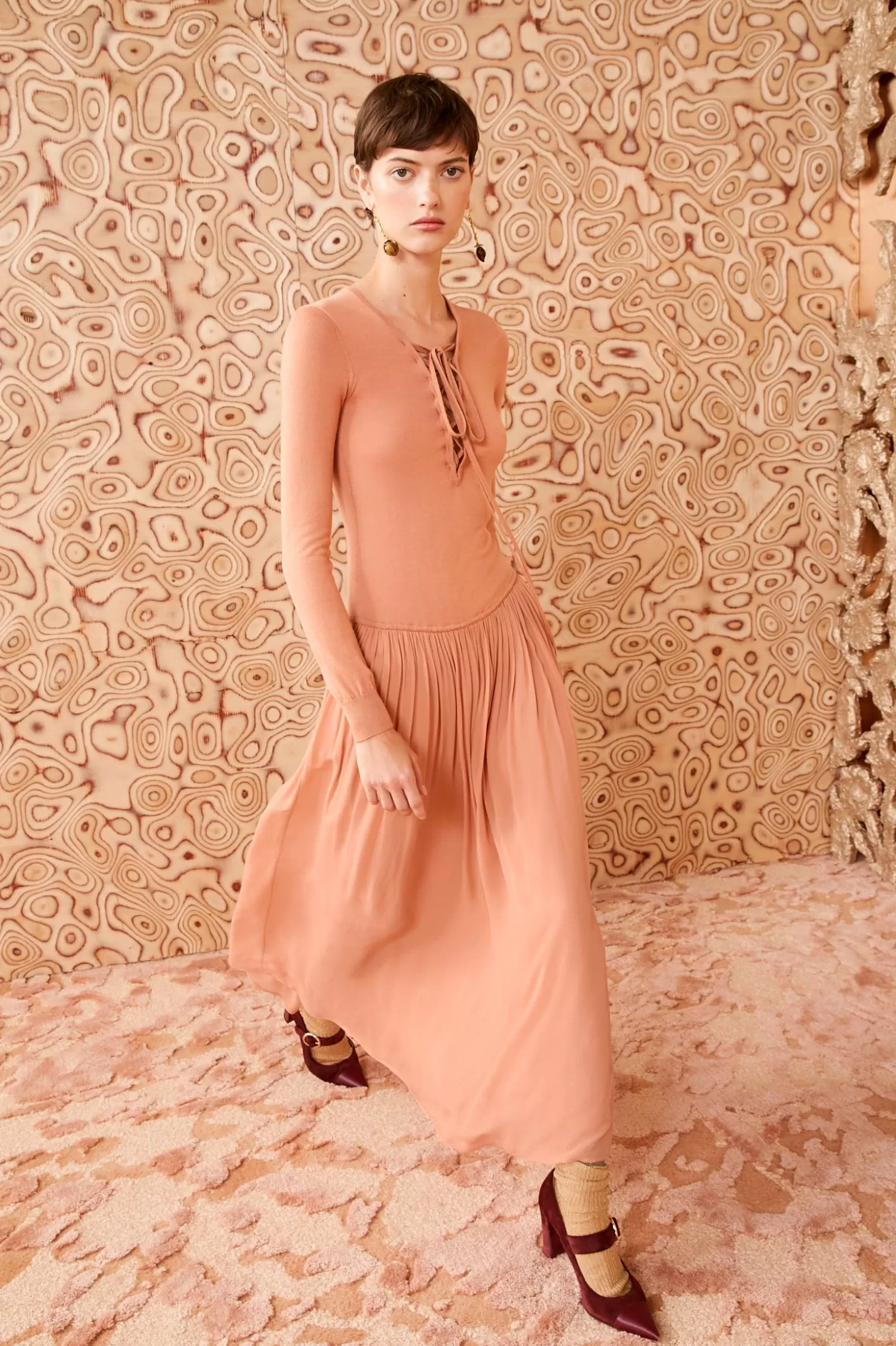 Debuting in Look 25 of our Autumn/Winter ‘24 runway show, the Colette Dress is crafted from a beautiful mix of luxe fabrications, with a bodice spun from silk and extra-fine merino wool, and a flowing skirt made from gossamer crepe-chiffon. It is adorned with a delicate lace-up neckline, long sleeves, and a drop waist with a midi hem. The soft blush shade is inspired by the landscapes of American painter Milton Avery, whose serene and dynamic palette is featured throughout the rest of our collection.