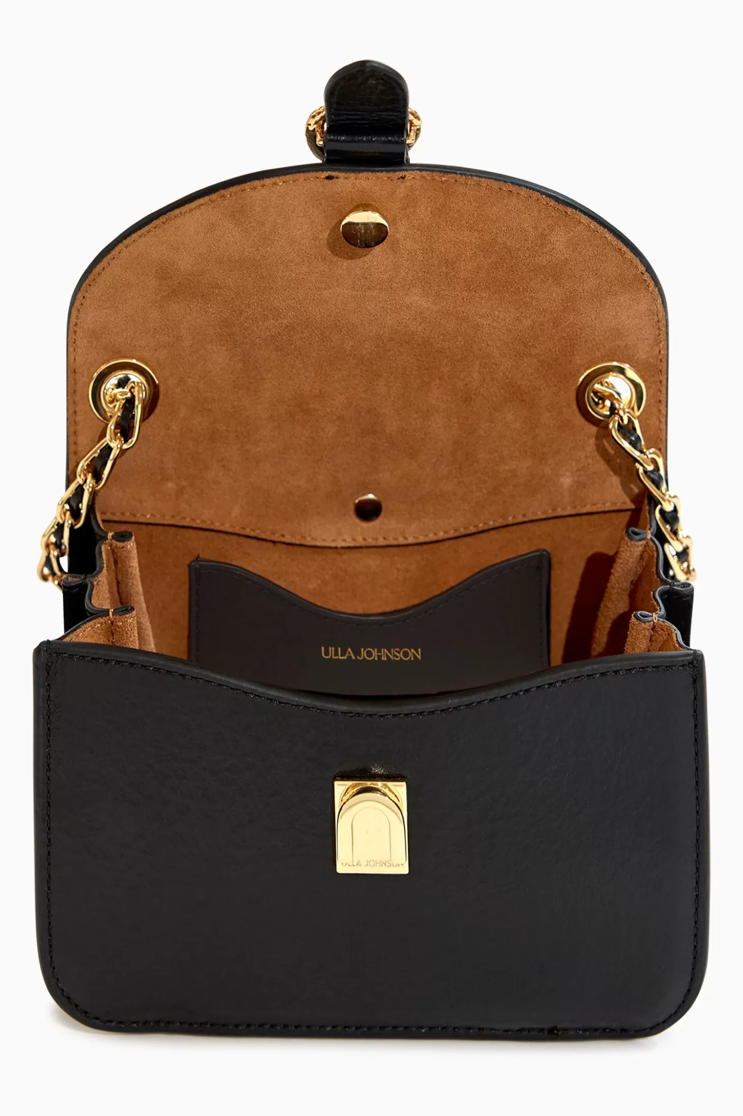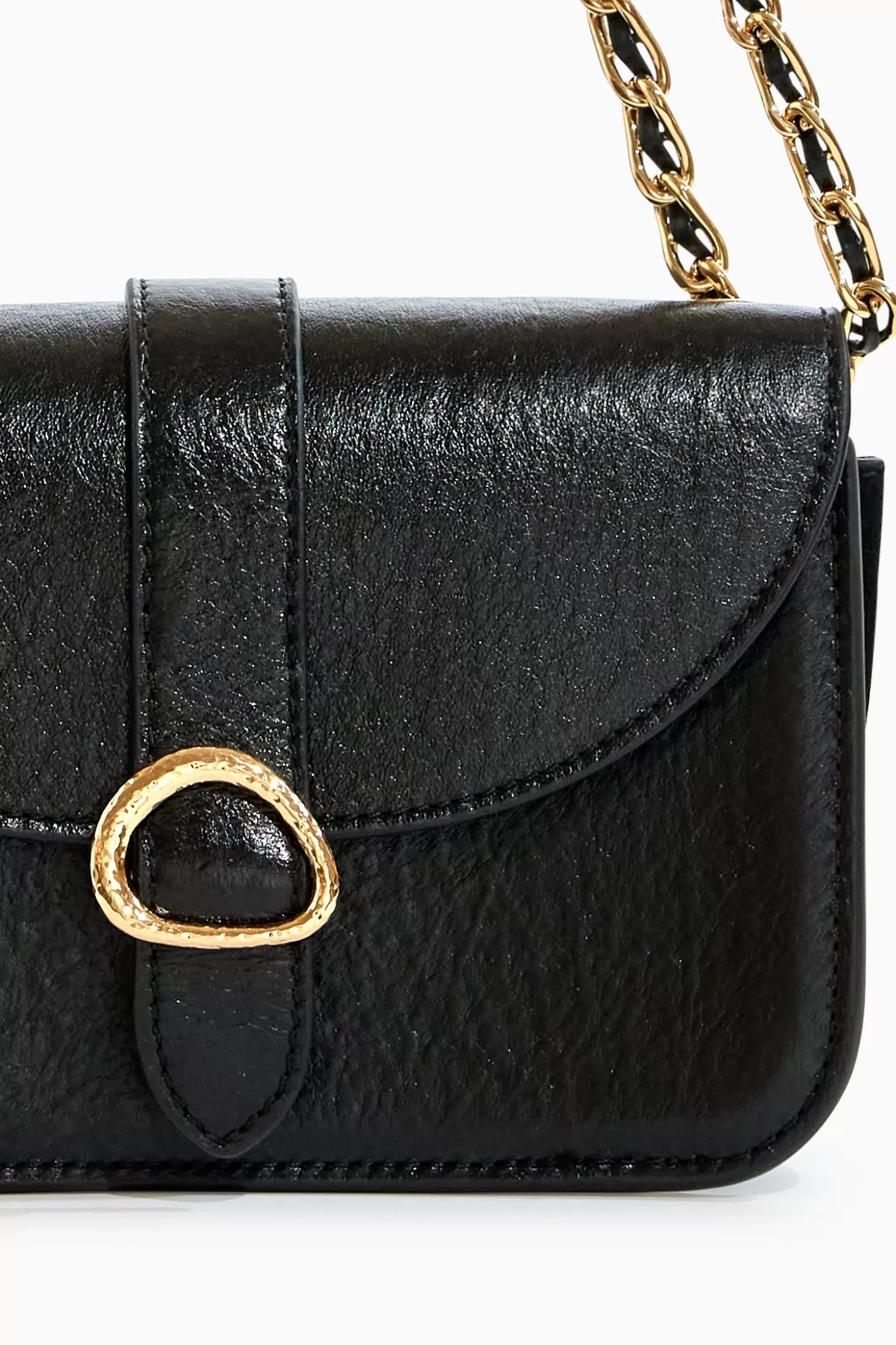 Our beloved Esme is crafted from glossy leather in classic black with an accordion-like shape that won’t topple if placed on a flat surface. Designed with function and ease in mind, it has a chain strap that can be worn doubled up over the shoulder, slung as a crossbody, or tucked inside for an evening-ready clutch. Our iconic brass hardware at the front adds a luxurious touch. This beauty fastens with a concealed magnetic snap closure.