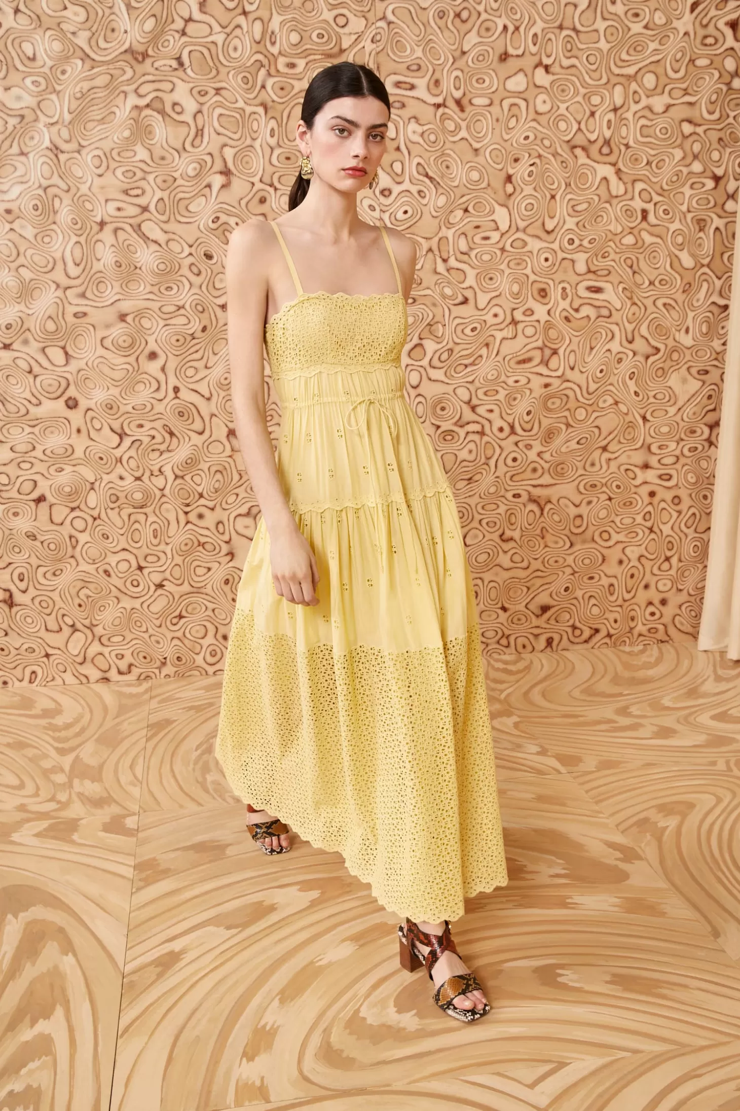 Arriving in a delightful pale yellow, our Isadore Dress is beautifully tailored from airy cotton voile that’s adorned with eyelets in scattered and concentrated geometries, displaying subtle hints of skin. Suspended from pin-thin straps, this effortless lovely has a drawstring waist and falls to a timeless midi silhouette. It fastens with a concealed back zipper.