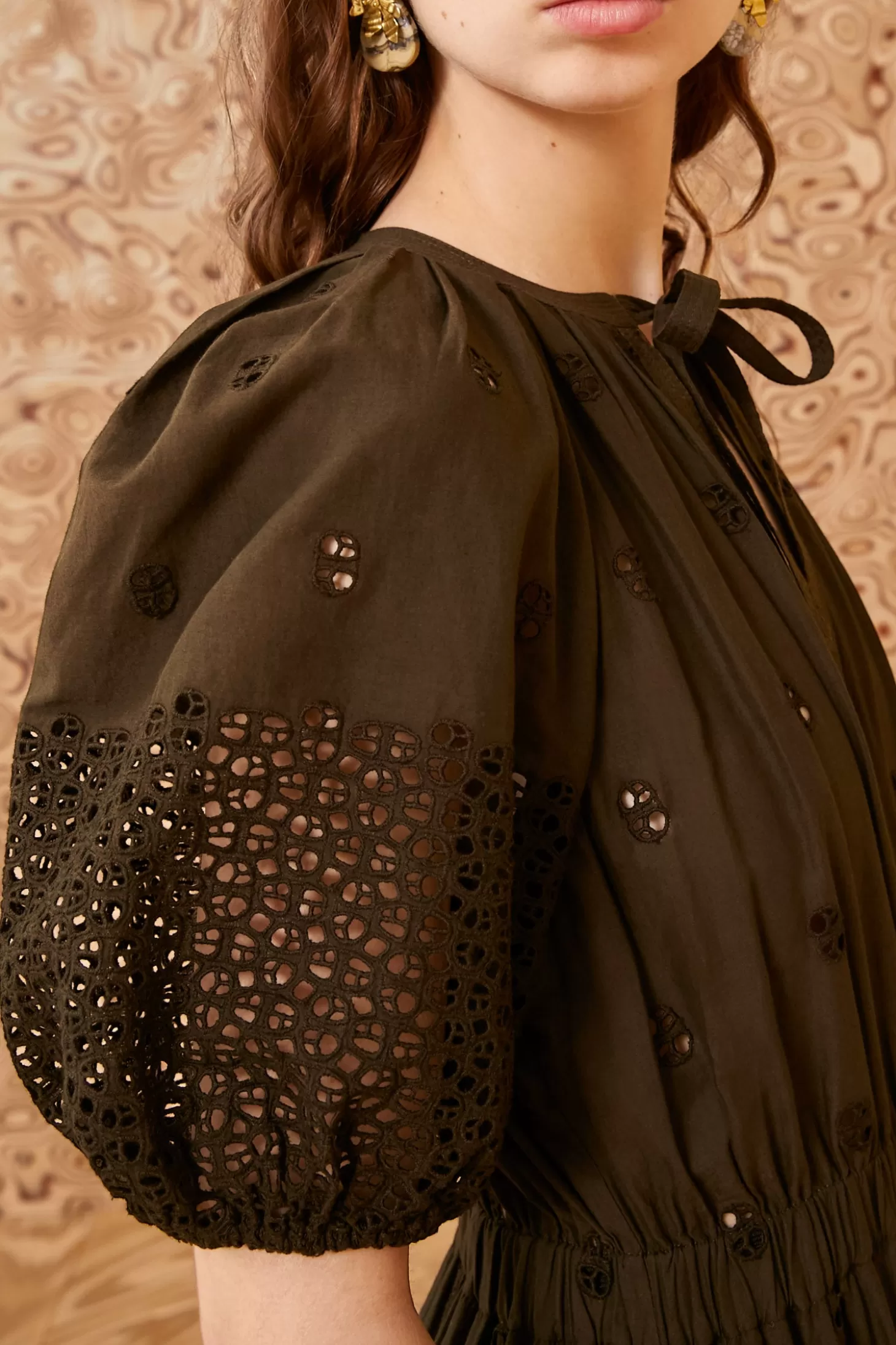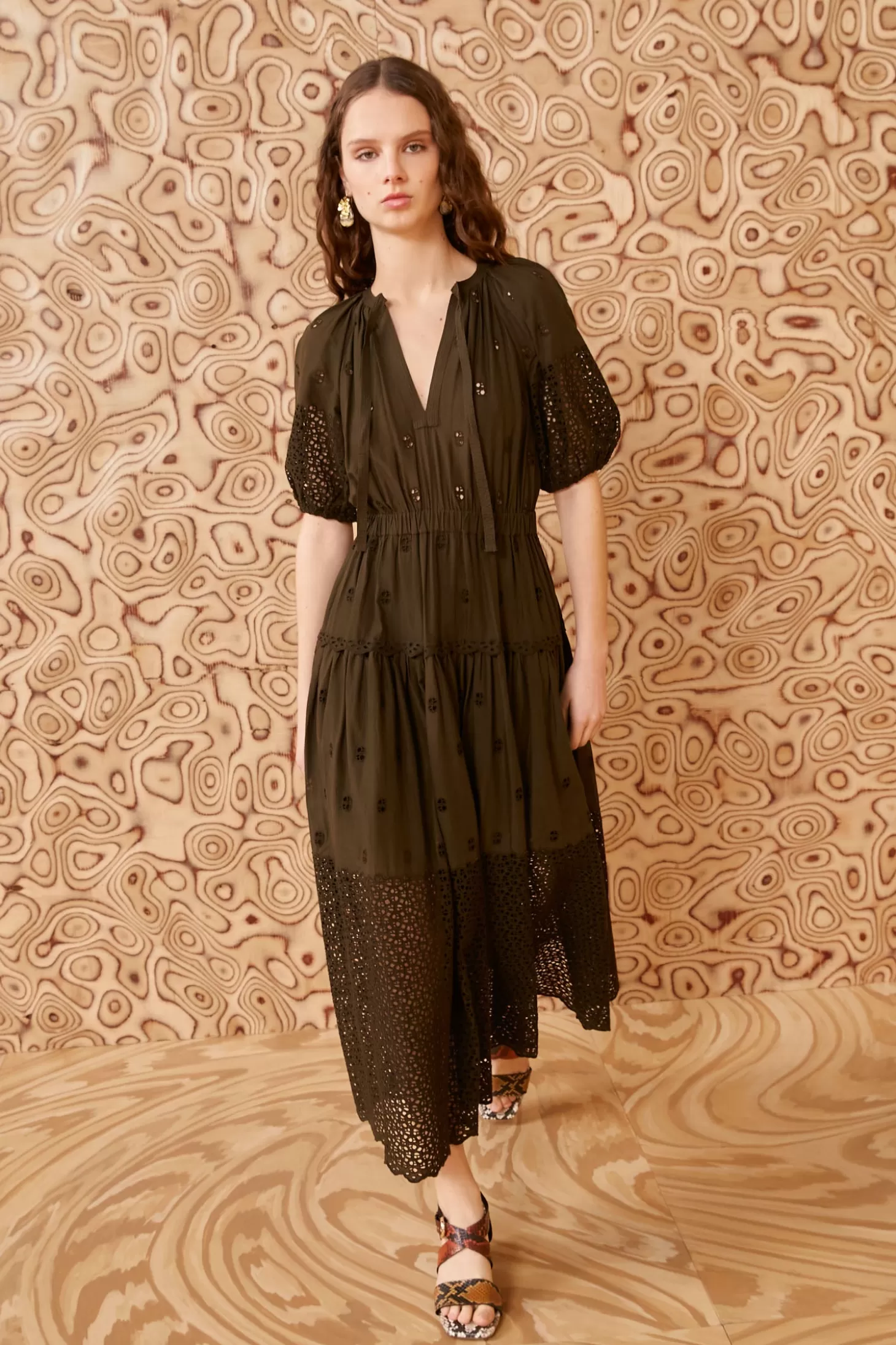 A beloved Ulla Johnson silhouette, our Nova Dress is made from lightweight cotton voile with beautifully placed geometric eyelets that playfully reveal and conceal. Framed by our signature puff sleeves, this earthen green midi dress has a V-neckline with ties, a comfortable elastic waist, and convenient side pockets.