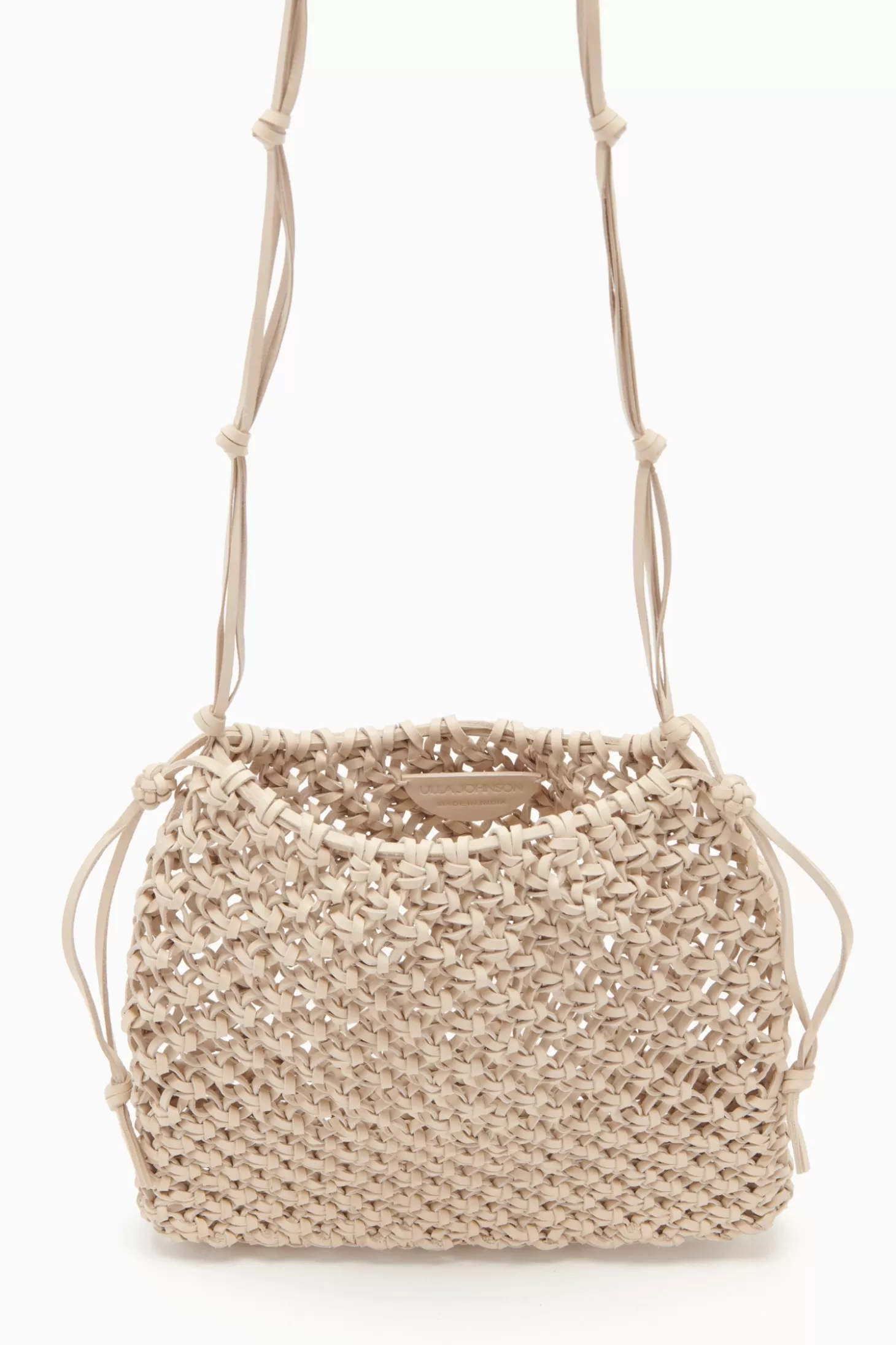 A gorgeous addition to our artisan-made handbags, our Tulia Crossbody is expertly hand-woven in India using an intricate macramé technique. Arriving in pearly alabaster white, it has an elegantly slouched silhouette that fits your phone, a drawstring top, and an adjustable shoulder strap with knotted detailing. Due to the handmade beauty of this piece, no two are exactly alike.