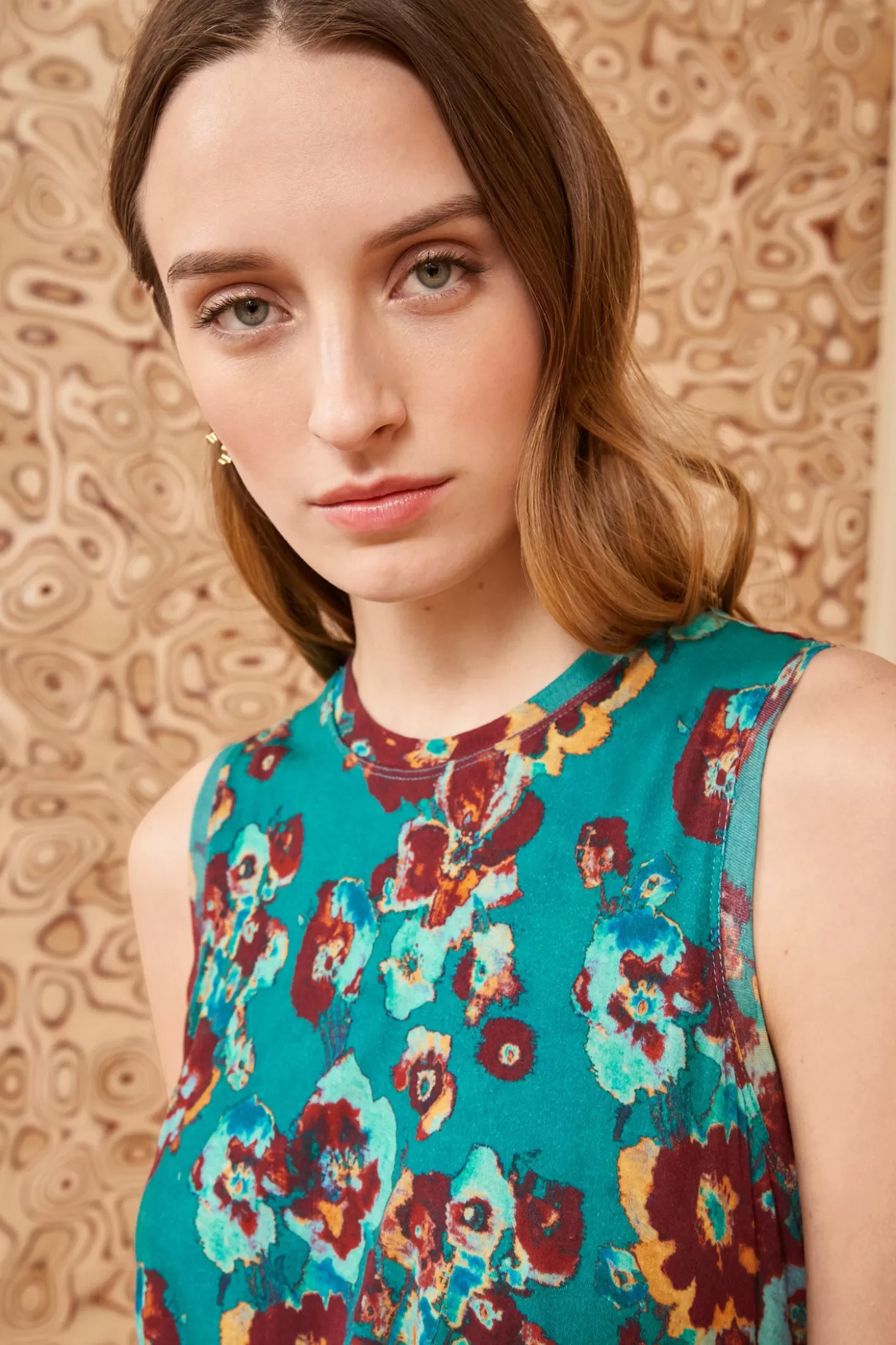 One of our bestselling silhouettes, the Irina Dress arrives in our tissue weight jersey that’s adored for its softness. Splashed with blurred florals in red, blue, and orange, this sleeveless dress features gathers that define the waist, side pockets, and has an elegant midi-length hem.