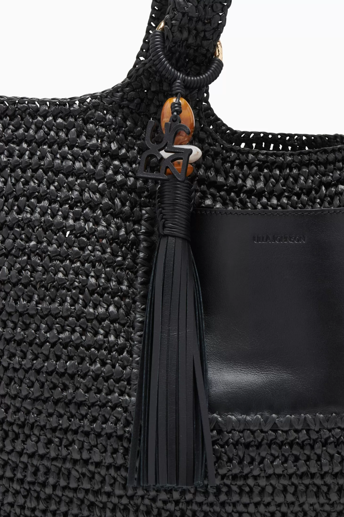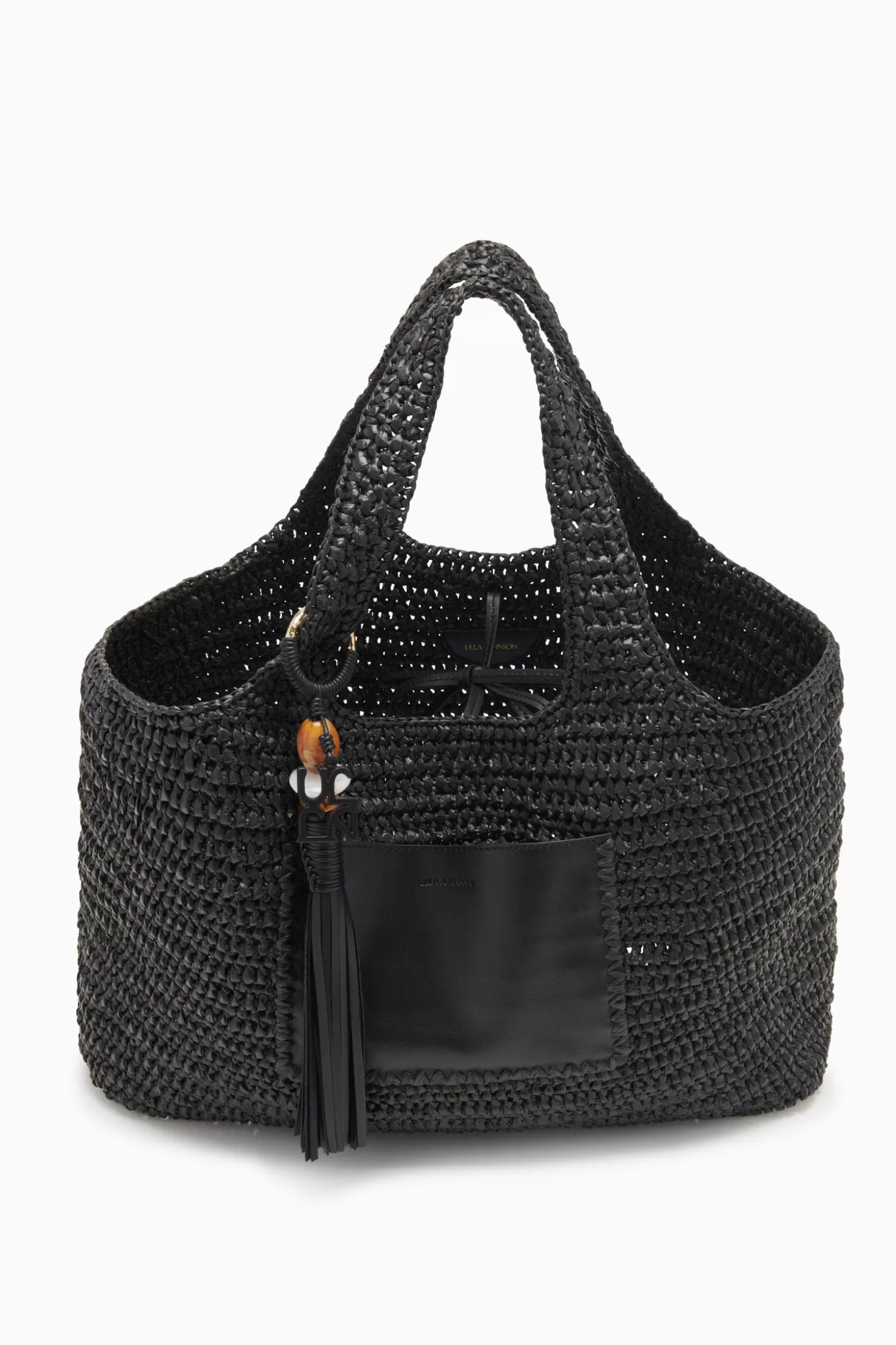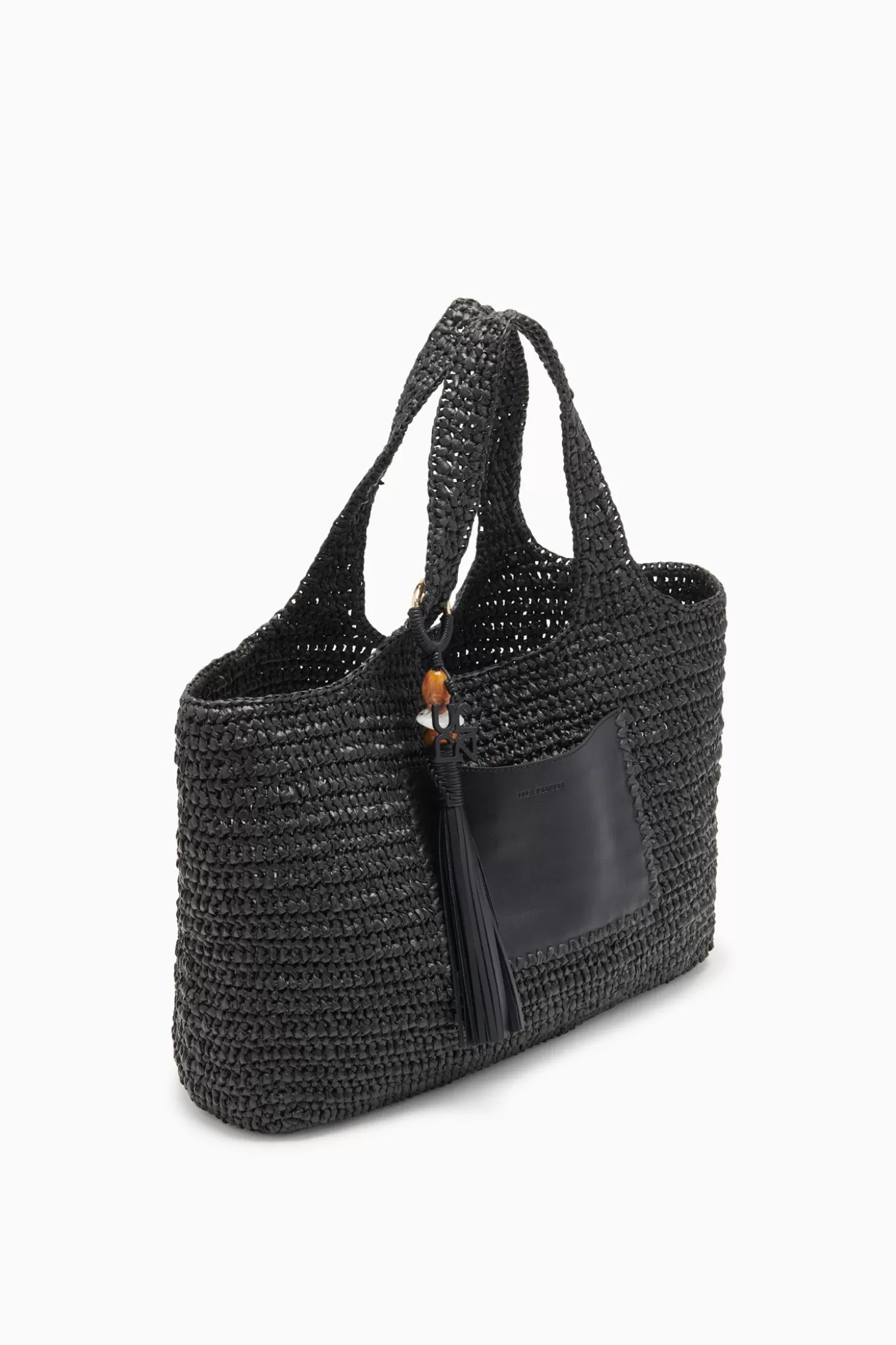 Our Kamari Tote is a refined, everyday bag made all the more elegant thanks to subtle detailing. Hand-woven from black raffia, it has a roomy interior that’s unlined to maintain its drapey silhouette and has two top handles you can easily slip over your shoulder. A whipstitched-trimmed leather pocket on the outside secures smaller items, while the leather tassel with antique brass ring adds an elevated touch.