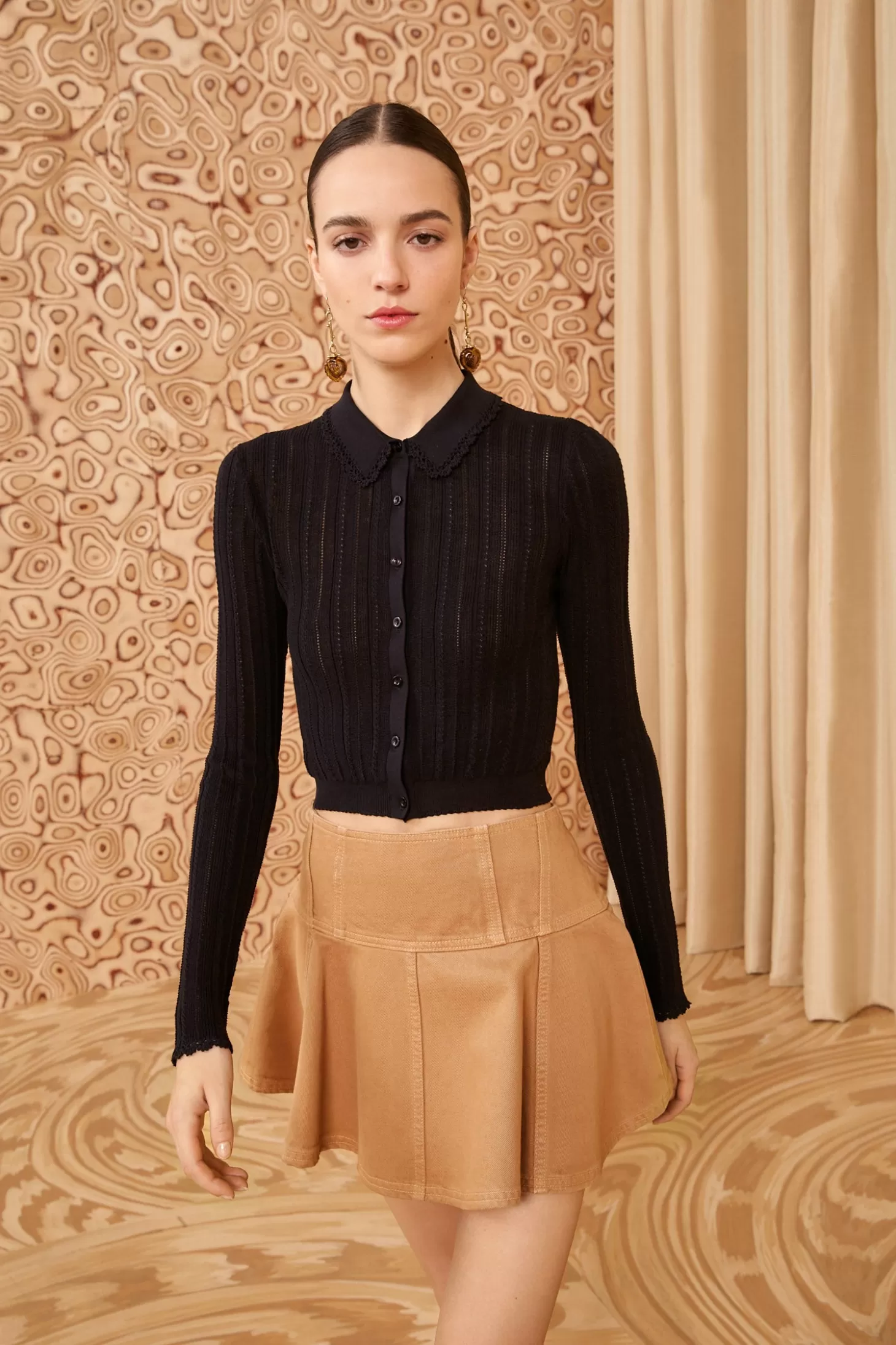 Beautifully geometric, the Lottie Top is crafted from our luxurious cotton and silk pointelle knit inspired by antique textiles. This black top features a slim, layer-friendly silhouette that’s slightly stretchy and has a classic collar with long sleeves. Pair with your cherished wardrobe separates or other special pieces from our collection.