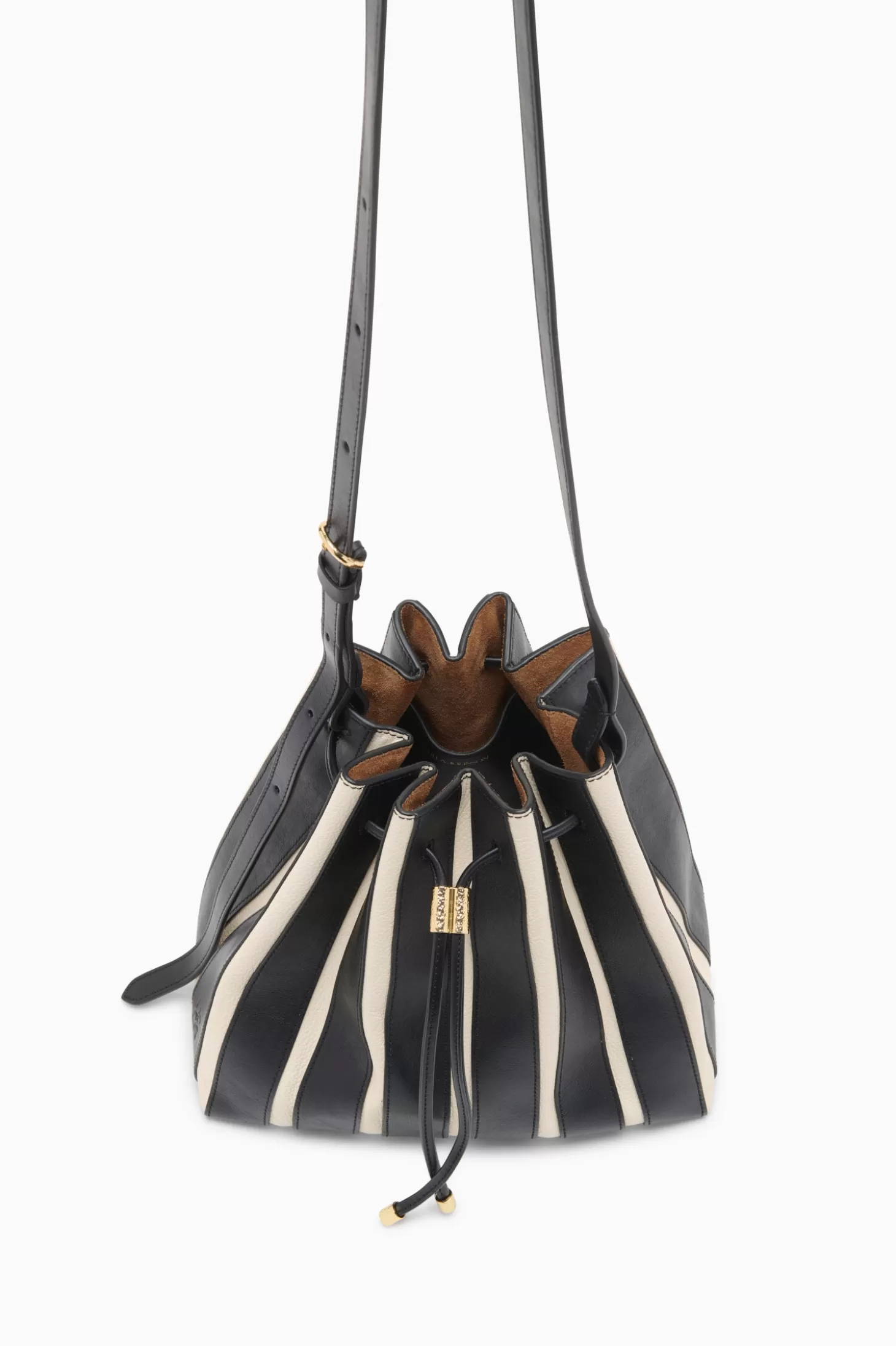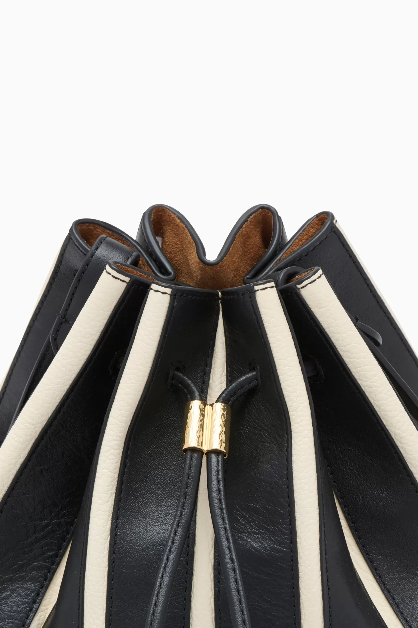 Featured on our Spring/Summer 2025 runway, the Alma Bucket is a wear-with-anything essential, molded from pebbled leather with contrasting stripes in smooth calfskin. This pleated black and white lovely has a drawstring top, an interior pocket to fit your phone, and an adjustable strap for shoulder or crossbody wear.