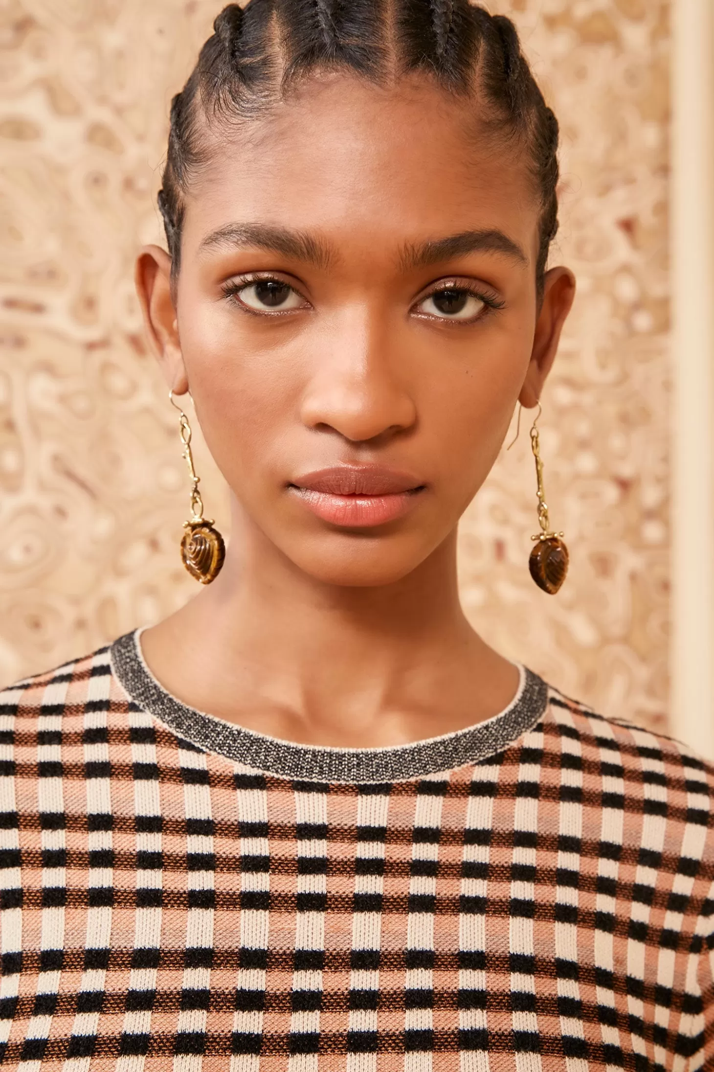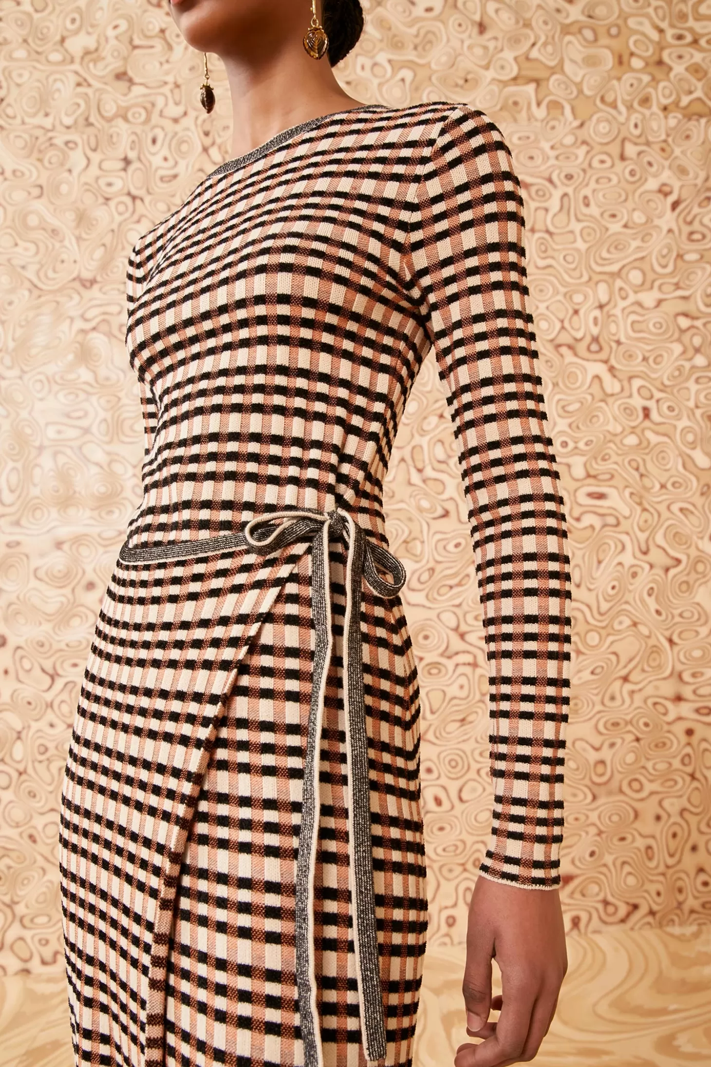 Refined yet impactful, the Anouk Dress is spun from our lightweight jacquard with an intricate mix of brown and black yarns with varied stitches, resulting in a lovely checked motif. This long-sleeve dress has a classic crewneck and a tie-waist detail that creates a wrap-effect skirt. It gracefully skims the body and falls to a midi length.