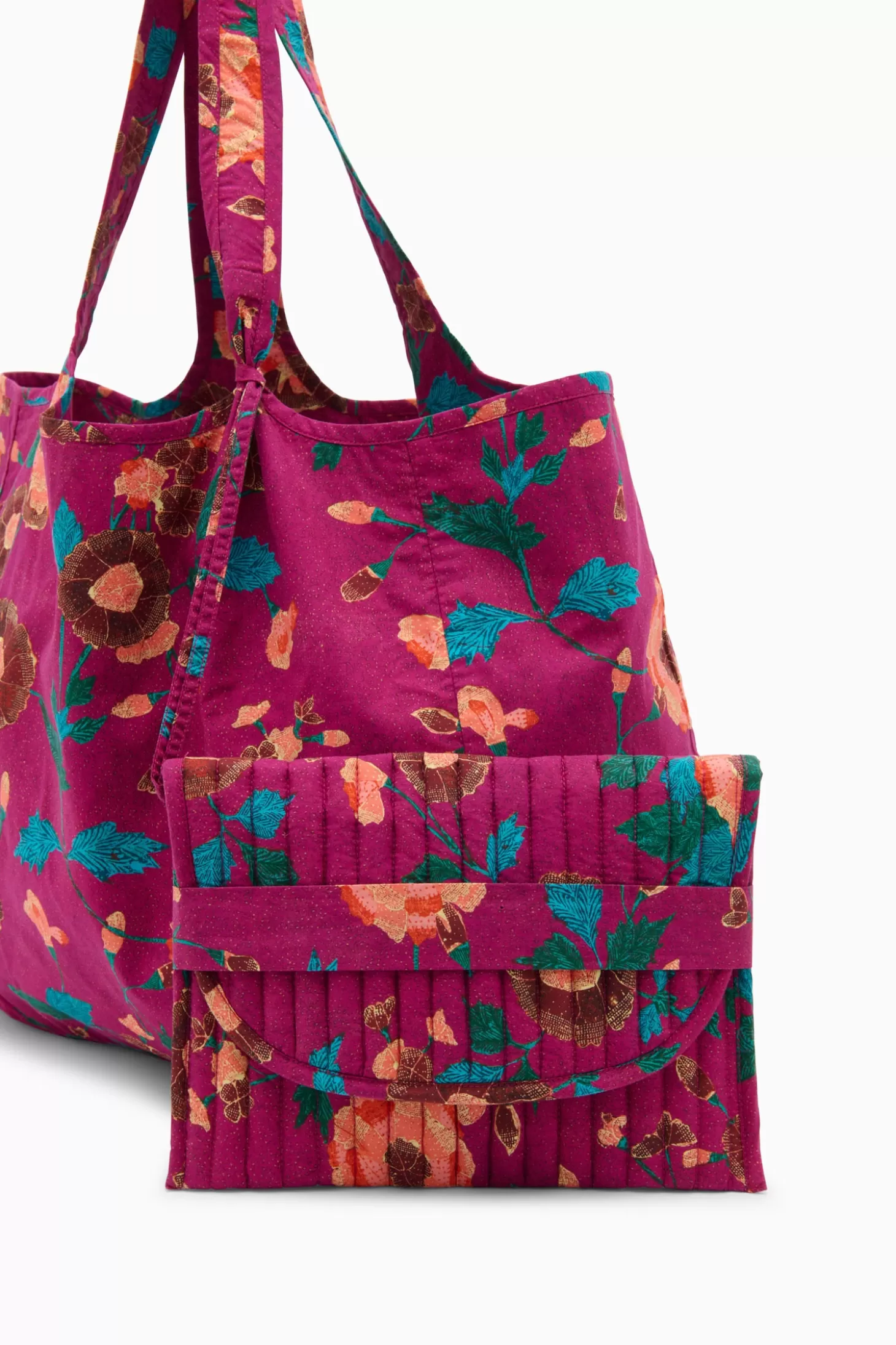 Exclusively ours, the Kamari Tote is made from floral cotton awash in vivid pink and blue hues. This carryall bag features a rounded double handle and comes with a separate pouch to keep your essentials organized.