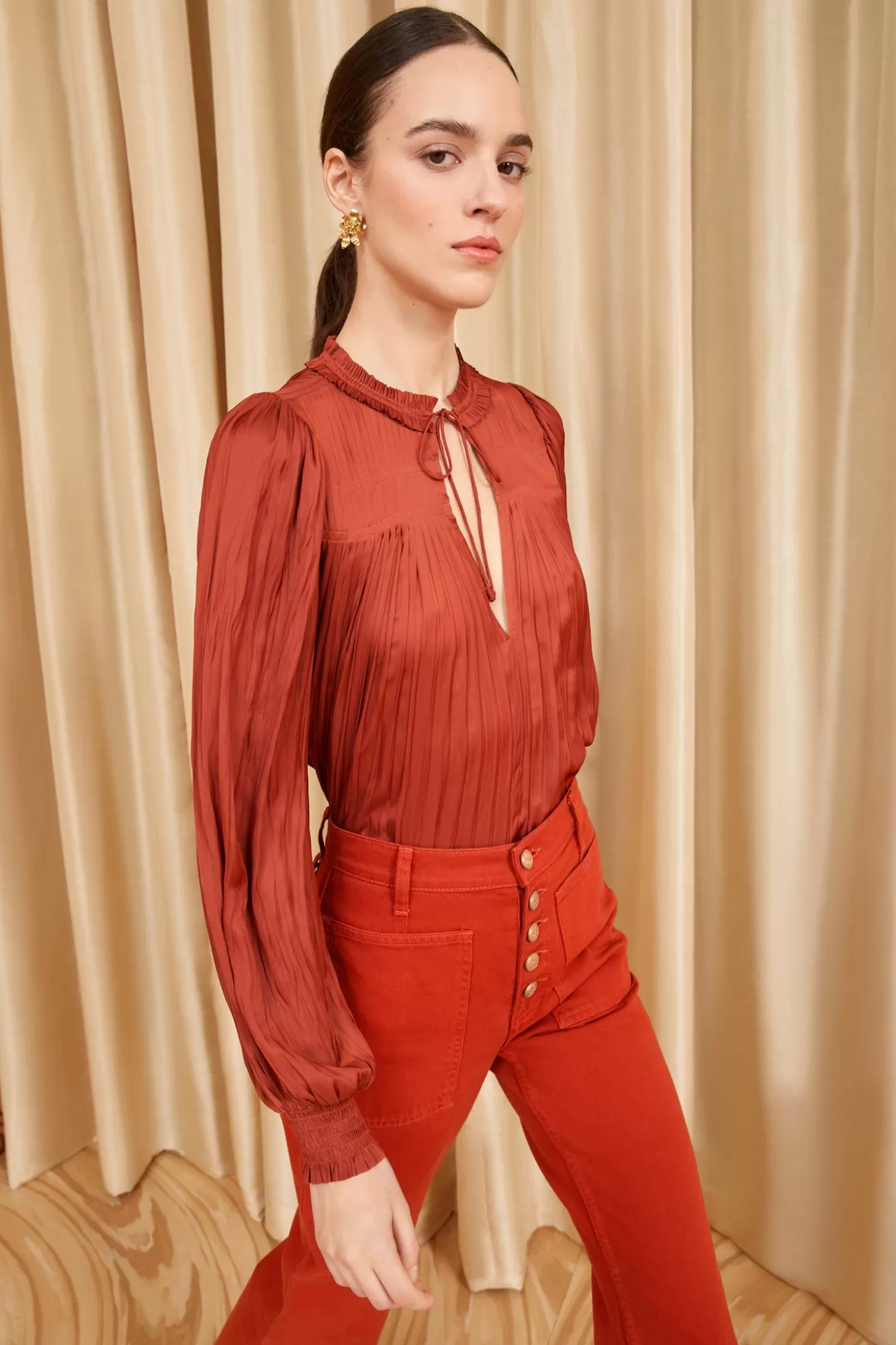 Our Leah Blouse is cut from our signature plissé satin that’s adored for its slinky drape and smooth feel. Splashed a deep tierra brown, this pleated top has voluminous long sleeves that are cinched at the cuffs and is trimmed with delicate flutters at the neckline. It has sleek neckties you can fasten or leave undone for a more relaxed look.