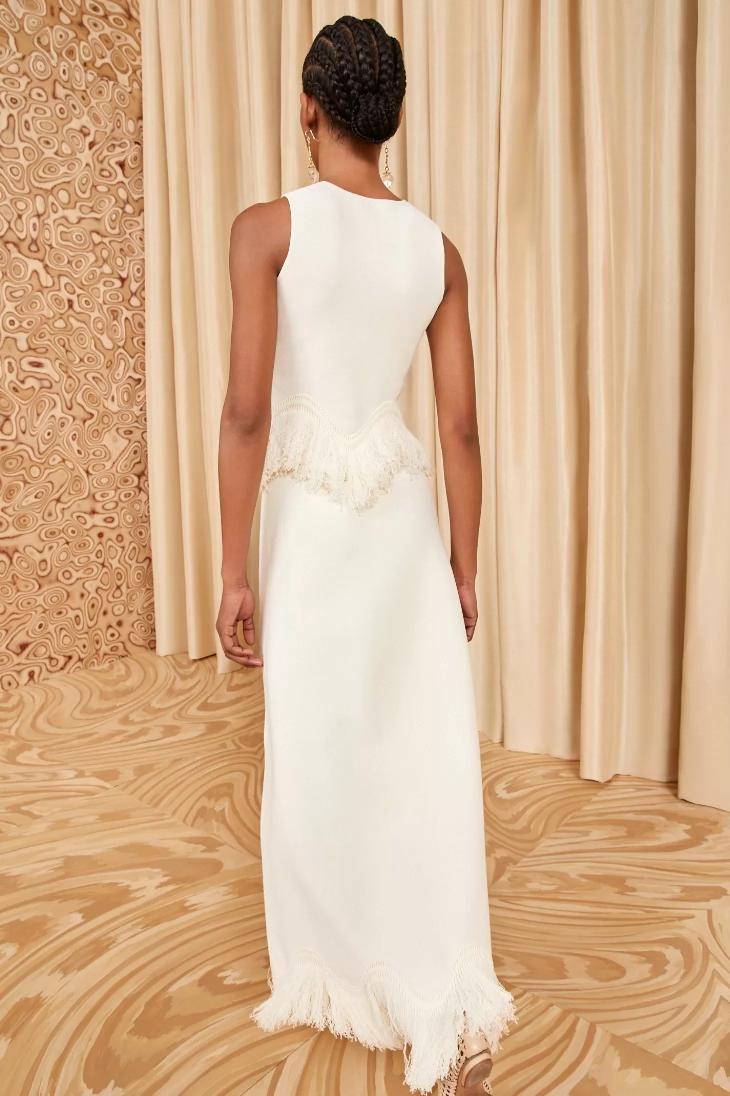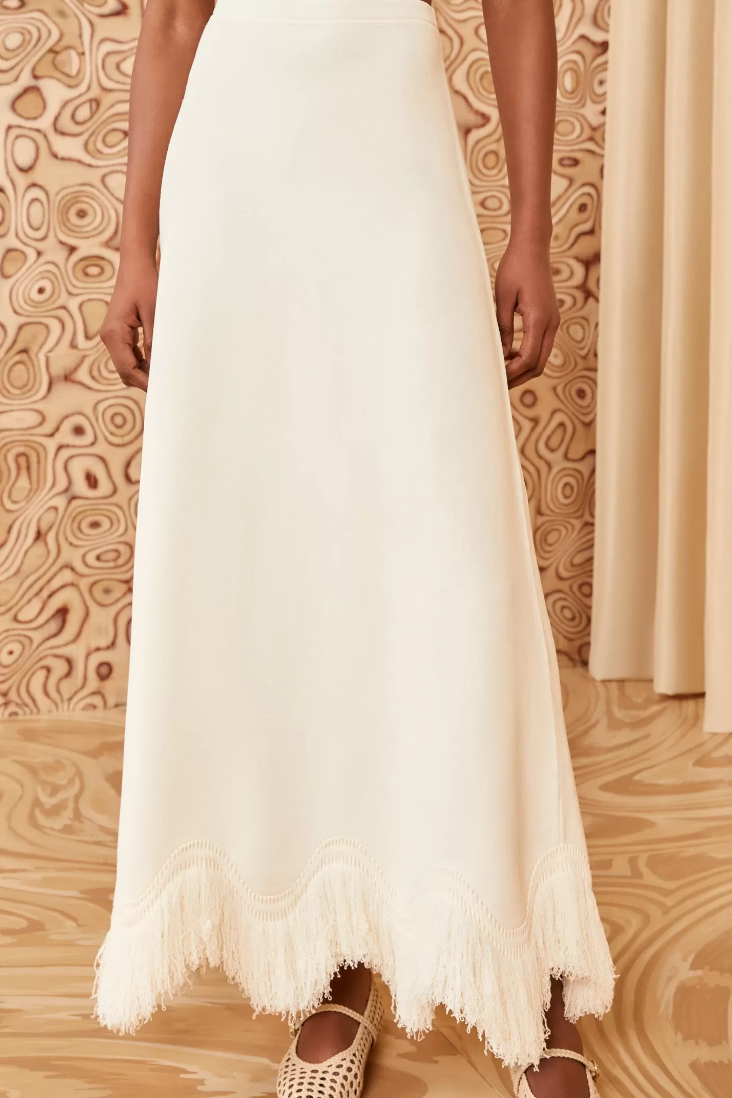 The Paulina Skirt is spun from our plush compact knit into an elegant midi-length with artfully looped hand-cut fringe at the hemline. It is an ethereal, pristine white and pulls on easily thanks to the elastic waistband.