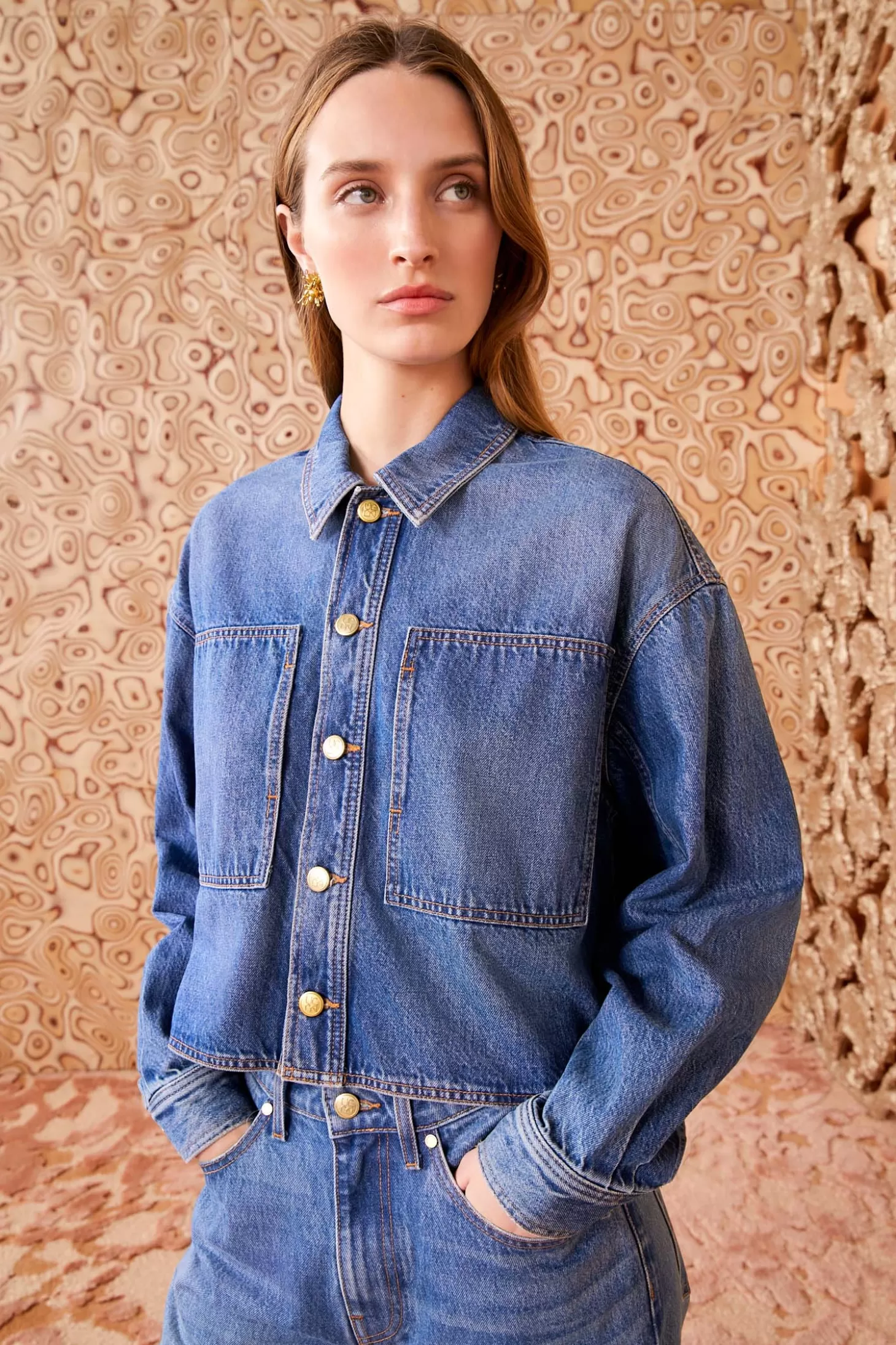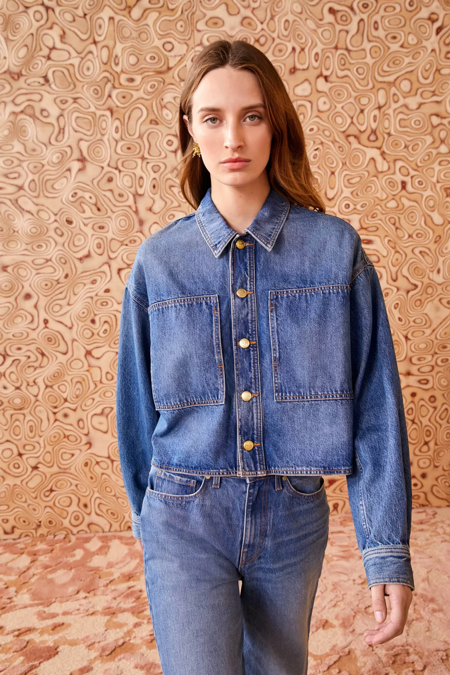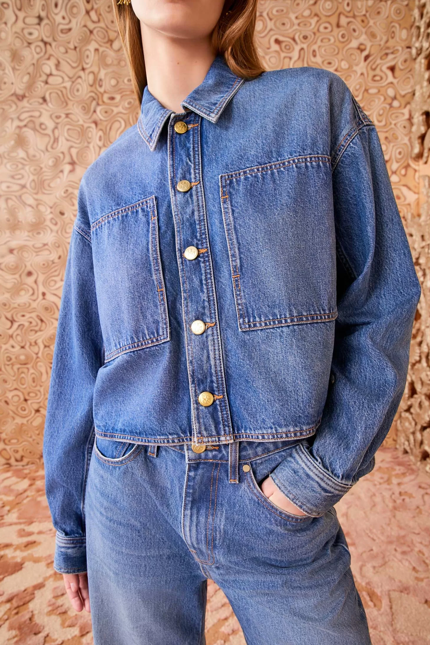 Featured in Look 38 of our Autumn/Winter ‘24 runway show and one of Ulla’s personal favorites, the Bobbi Jacket is a new silhouette handcrafted in Los Angeles from non-stretch, rigid denim in our classic Danube Indigo wash. This modern style features a boxy shape with a cropped hem, signature antique brass buttons, and oversized patch pockets.
