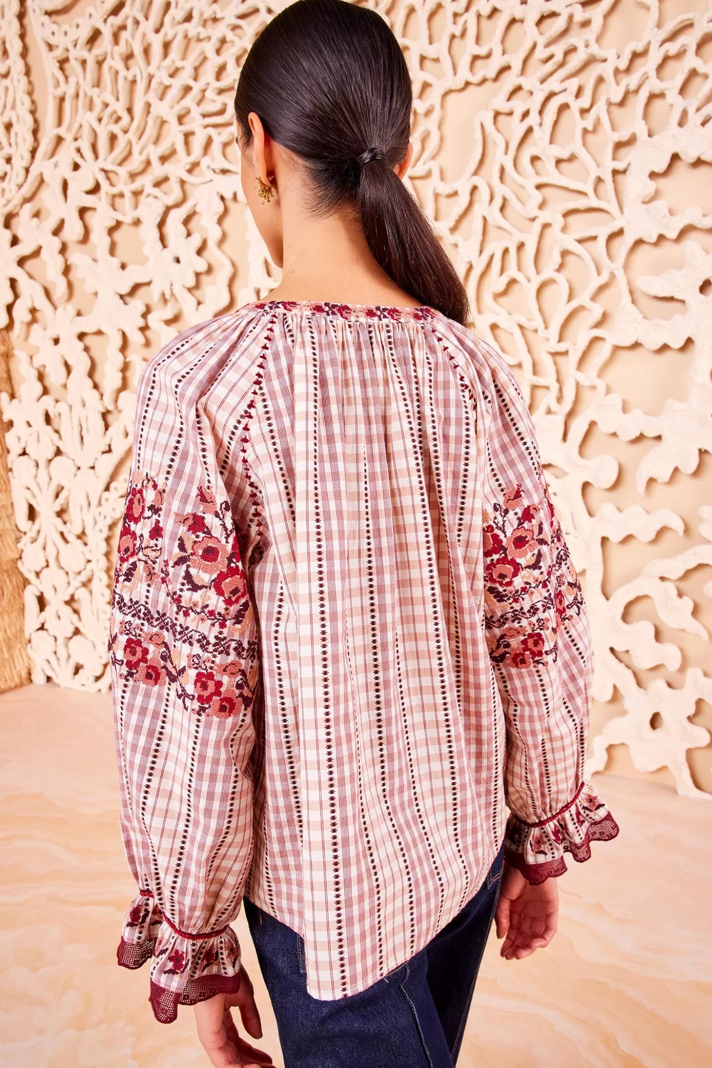 The Emi Blouse is an intricate beauty cut from lightweight cotton shirting, vividly patterned with Madras plaid and embroidered with blossoms. This long-sleeve, romantic style has notes of soft red and pink, tassel-adorned neckties, and is finished with delicate lacing at the cuffs.