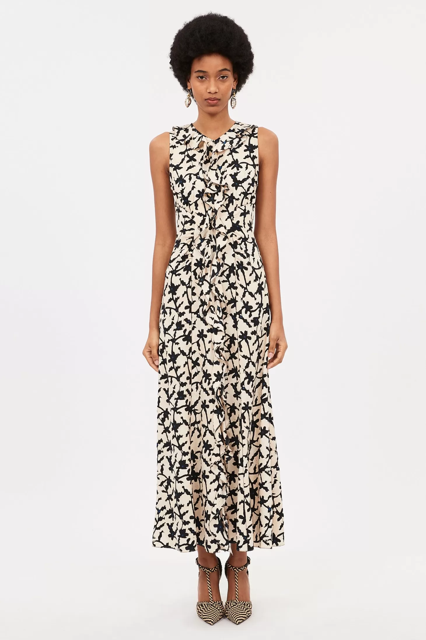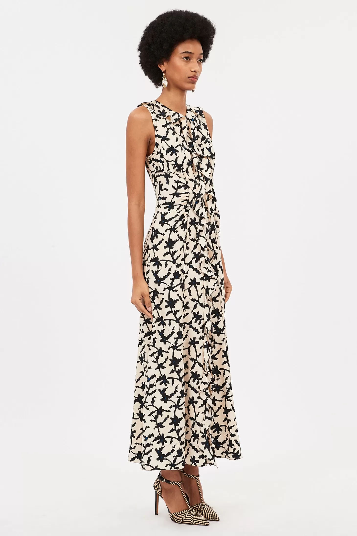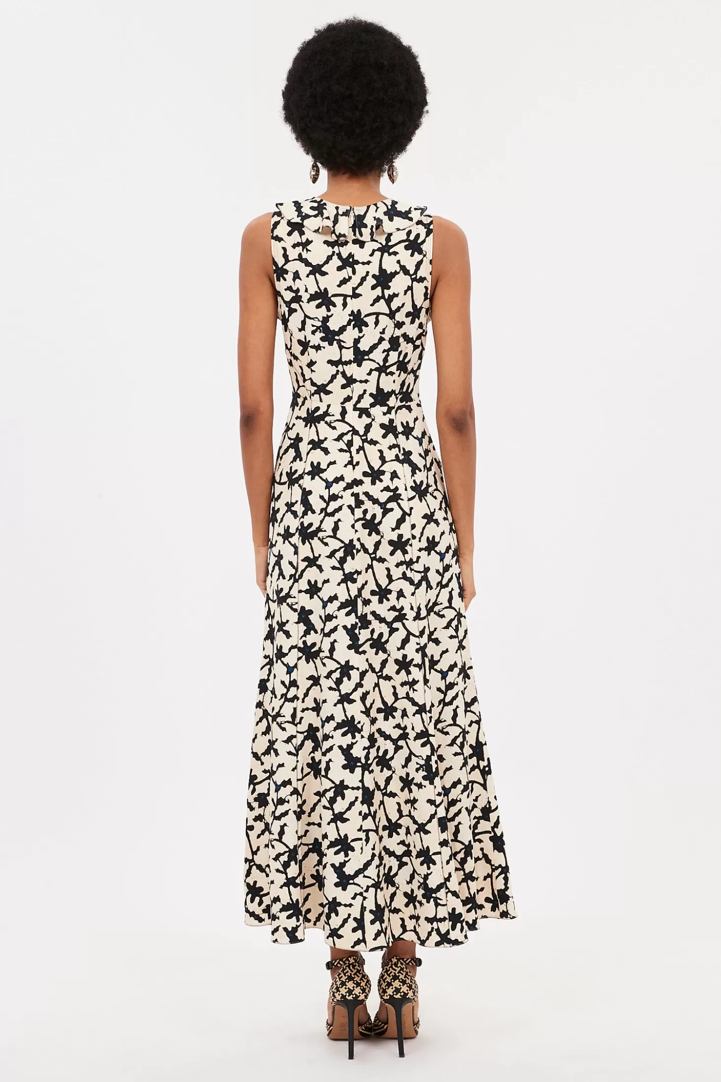 The Lille Dress arrives in our signature satin-back crepe, beautifully draped with ruffles and defined by architectural seams. Delicate contrast stitching brings added definition to this elegant black silhouette, perfect for all occasions. This midi dress fastens with a concealed back zipper.
