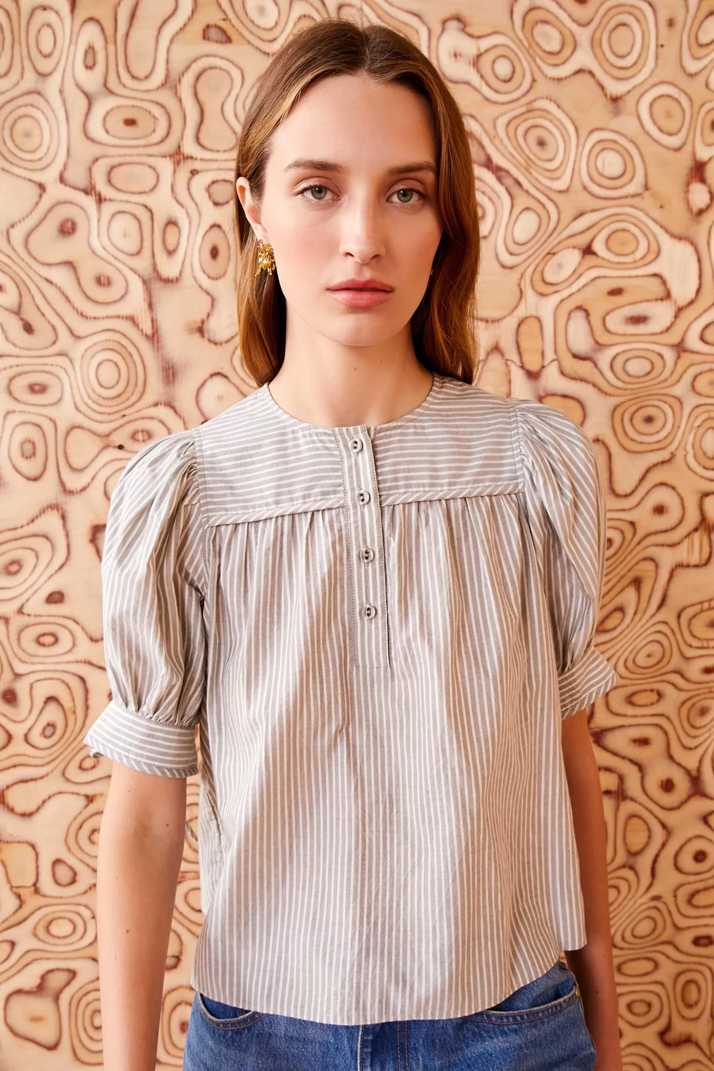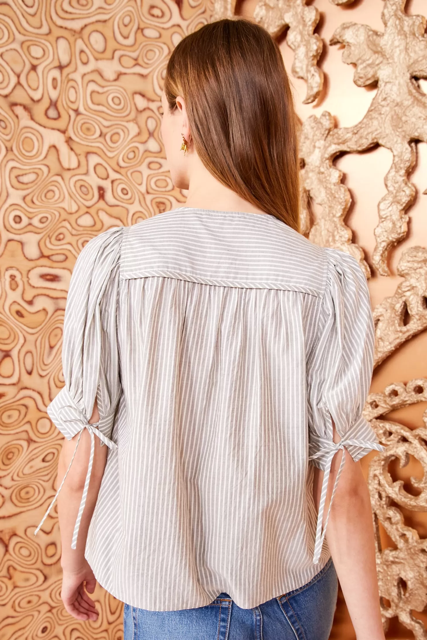 An easy classic, our Mira Top is made from a luxe blend of cotton and Mulberry silk that enhances the luster and is smooth to the touch. Patterned with light gray stripes, this style has gently puffed short sleeves with delicate ties at the cuffs, a round neckline, and is designed for a loose fit. It fastens with a partially buttoned front placket.