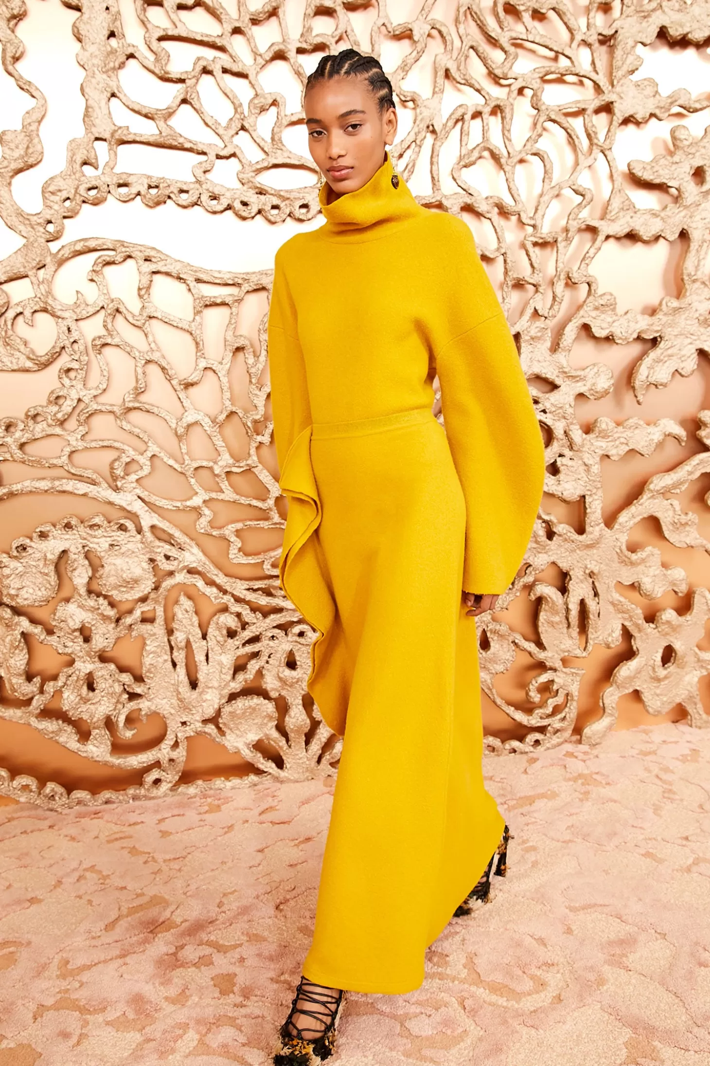 As seen on Ulla for the Autumn/Winter ‘24 runway finale, the Mireya Skirt is a sculptural beauty made from felted merino wool in a golden turmeric hue. This midi-length skirt beautifully cocoons the body and is finished with a burst of dimensional ruffles. Style yours with our Corinna Top for the complete runway look.