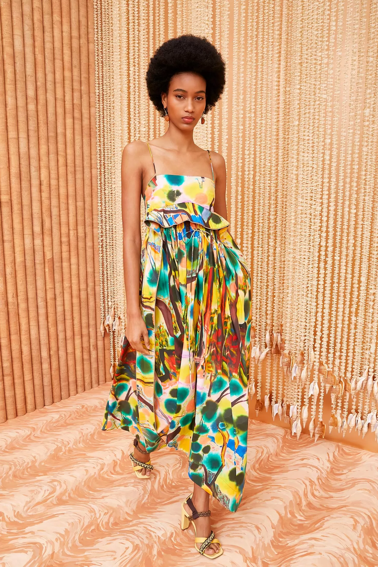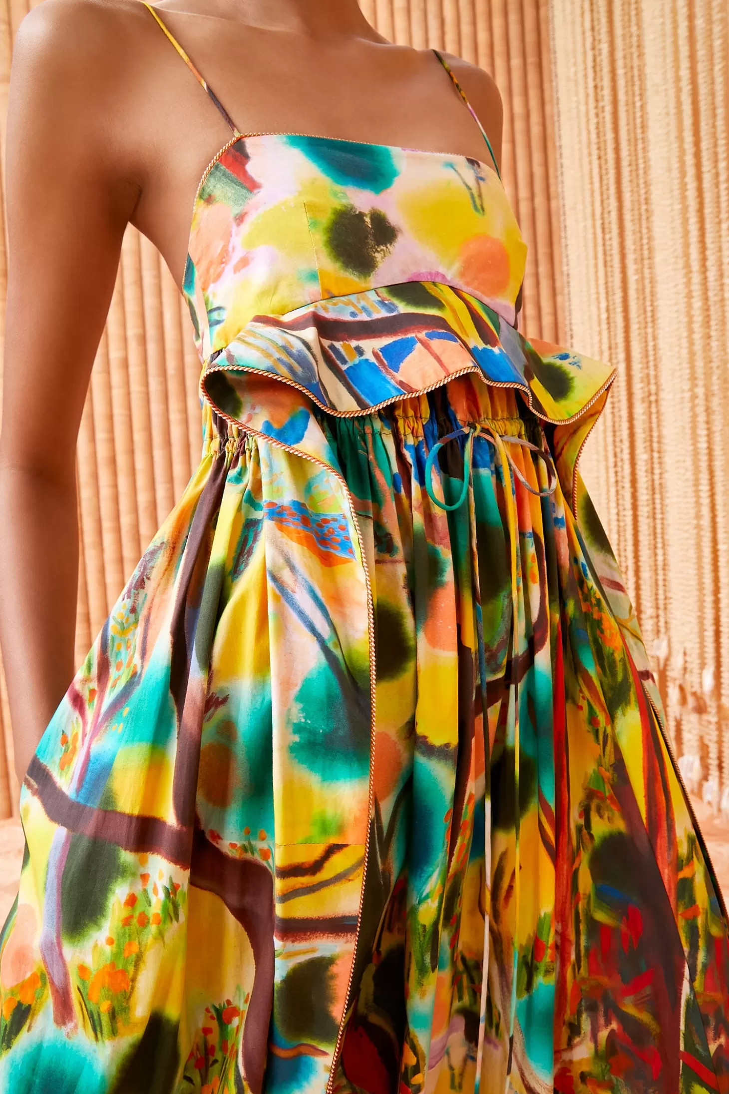 One of Ulla’s favorites and featured in Look 50 on our Spring/Summer ‘24 runway, our limited-edition Leighton Dress is part of our collaboration with renowned painter Shara Hughes, whose dreamlike 2018 painting “Ignoring the Present” is translated across the silhouette in vibrant yellow, blue, and green hues. This spaghetti strap midi dress arrives in cotton poplin with cascading ruffles and unfurls to a handkerchief hem. Fitted at the bodice, it has an adjustable drawstring waist, side slit pockets, and fastens with a concealed center-back zipper.