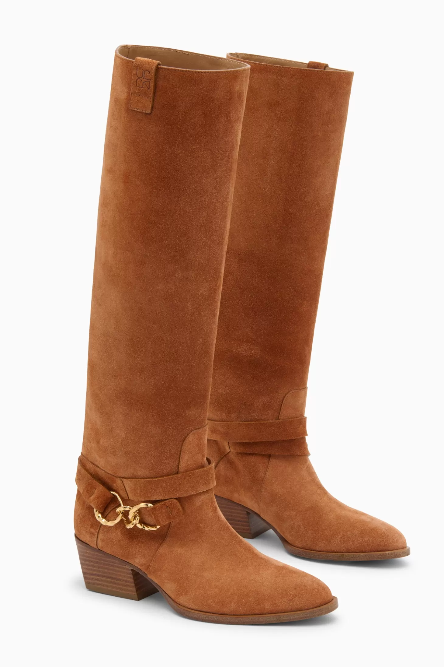 A true forever silhouette, our Willow Cowboy Boot is carved in Italy from velvety suede in rich pecan brown, which really complements our signature twisted brass hardware. It features a knee-high length, a pointed toe, and rests on a stacked block heel.