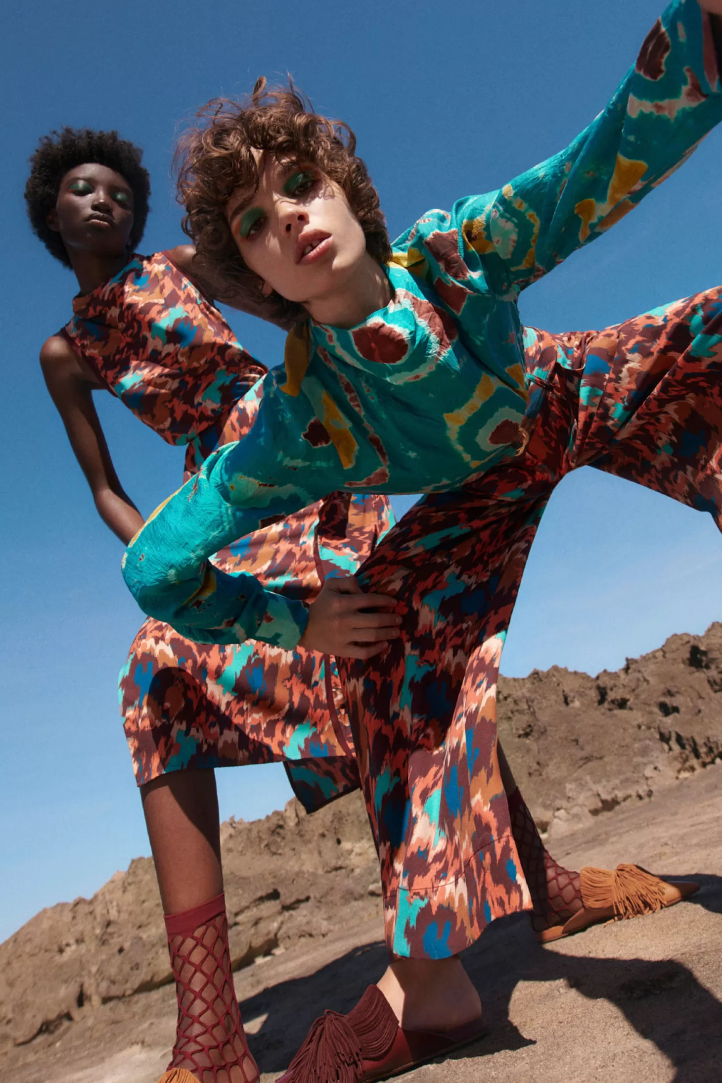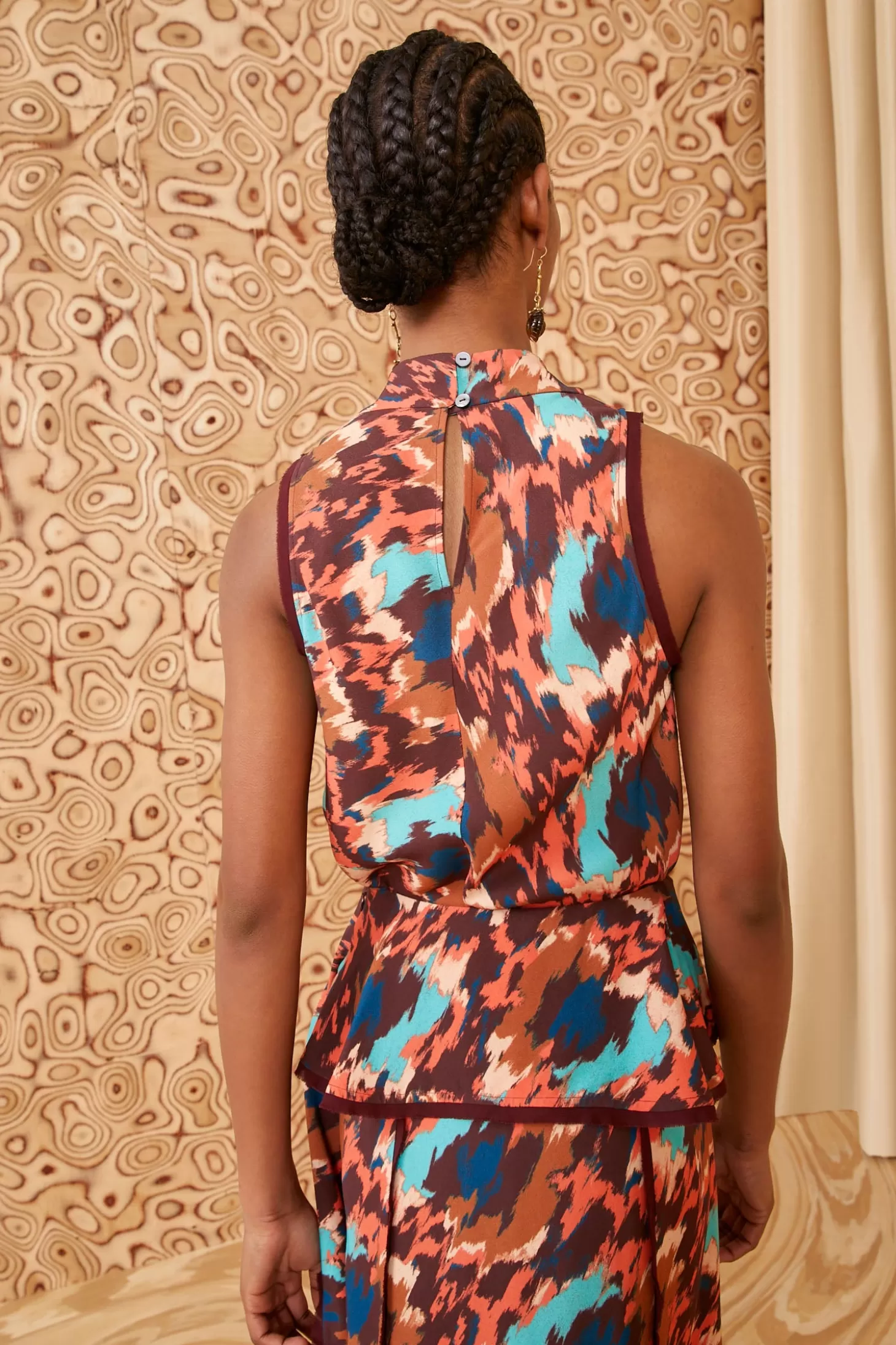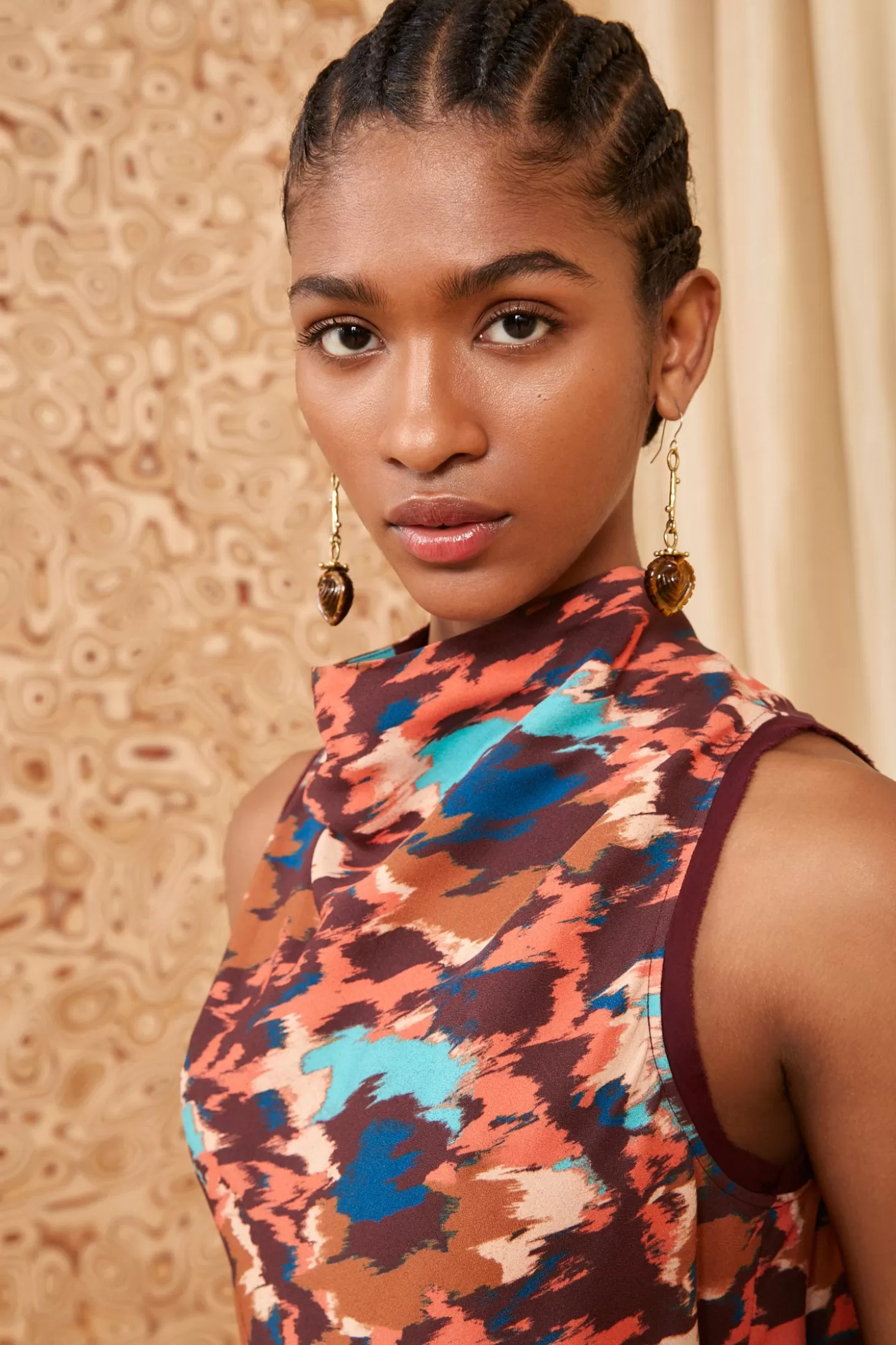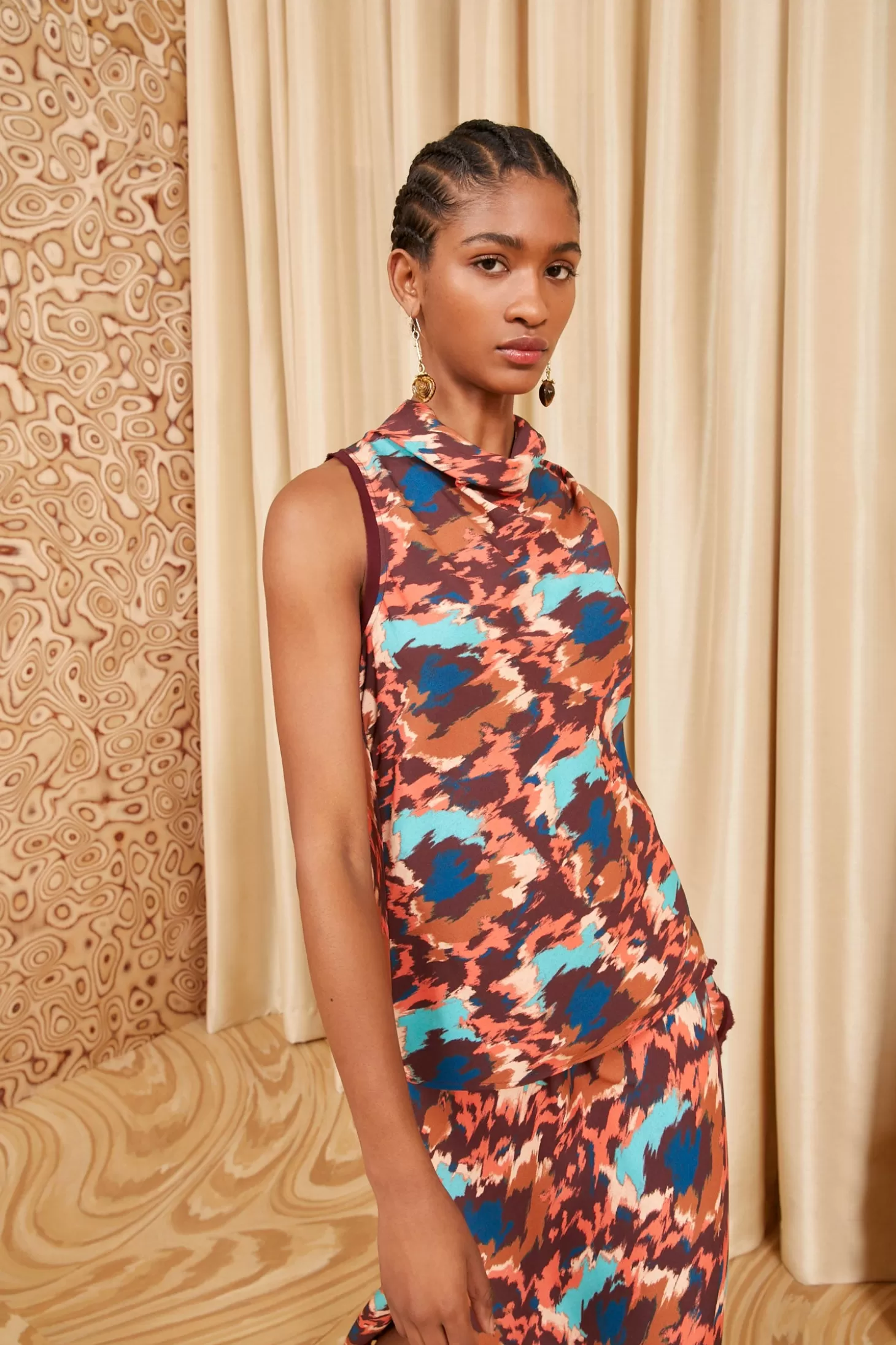 The Cleo Top is crafted from textured satin-back crepe and splashed with abstract floral ikat motifs in vivid shades of red and blue. This sleeveless, bias-cut silhouette features a softly draped cowl neckline and flowing bodice for an effortless look. It fastens with a buttoned keyhole at the back.