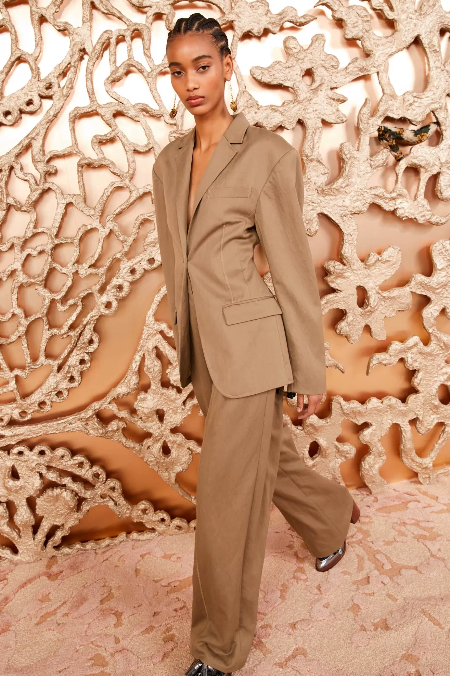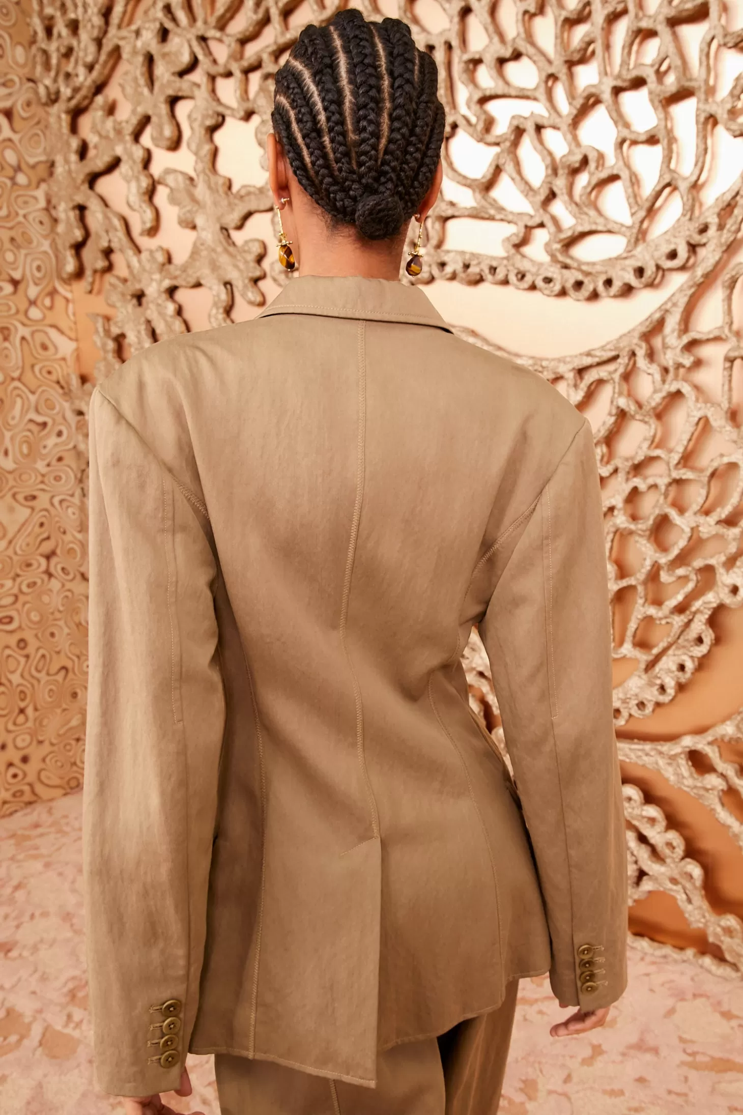The Dhemi Blazer is masterfully tailored from our fluid twill suiting in a soft green shade. Borrowing codes from menswear, this single-breasted jacket has sharp shoulders and beautifully nips in at the waist when worn closed. It has classic notch lapels, a back vent, and is finished with a lustrous shell button. Coordinate with our matching Delvine Pant.