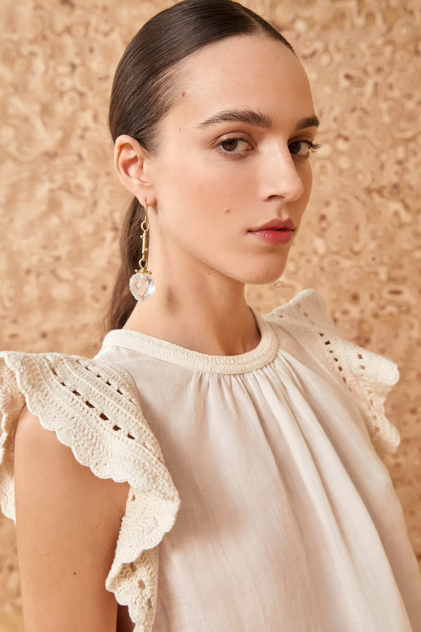 Understated and effortless, our Kai Top comes artfully adorned with hand-crocheted ruffles at the sleeves. This pristine white style has a round neckline and a loose fit that easily pairs with your favorite denim. It’s cut from soft and eco-friendly ramie fabric made from plant fibers, part of our continued efforts to lower our impact on the Earth. It fastens with a buttoned keyhole at the back.