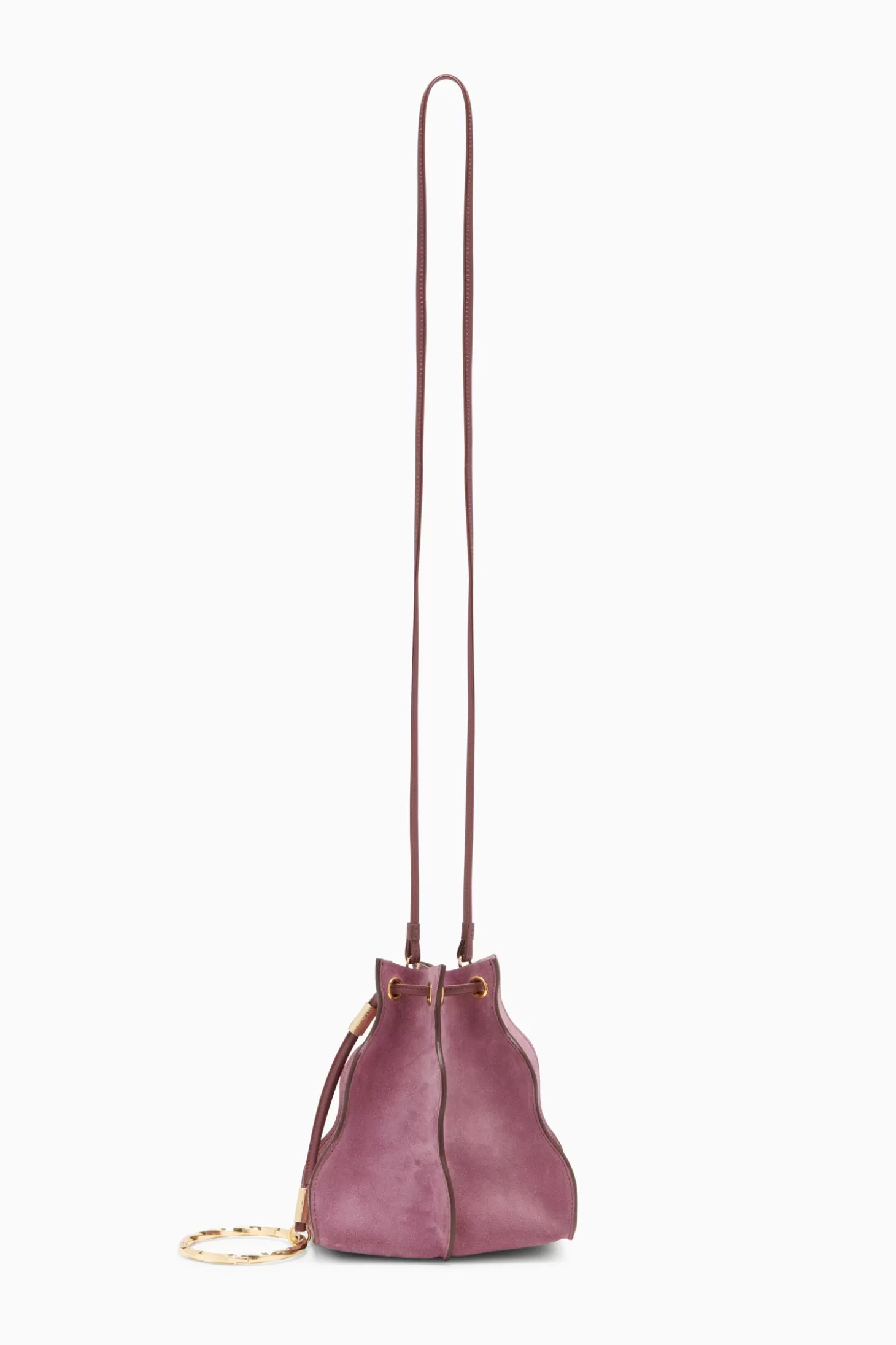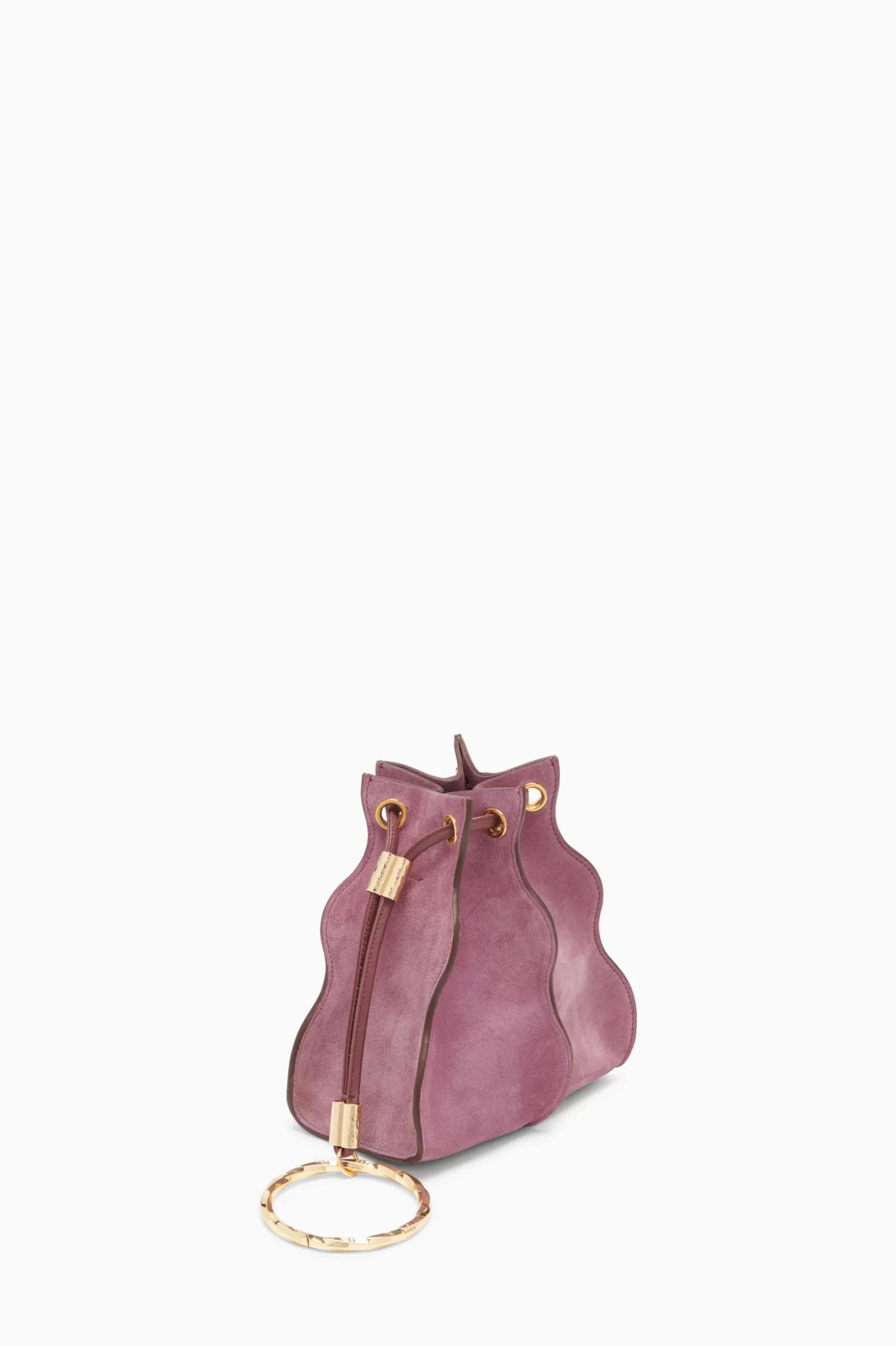 Featured throughout our Autumn/Winter ‘24 runway, our beloved Adria silhouette is updated for the season in a sleek and compact pochette. This small but mighty bag is carved from strips of supple suede that mimic the beauty of undulating waves. Arriving in a delightful lilac purple, it is topped with an elegant bracelet-inspired ring that’s detachable and has a removable crossbody strap.