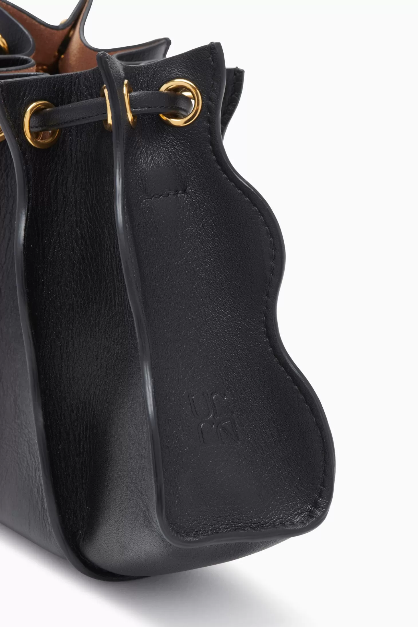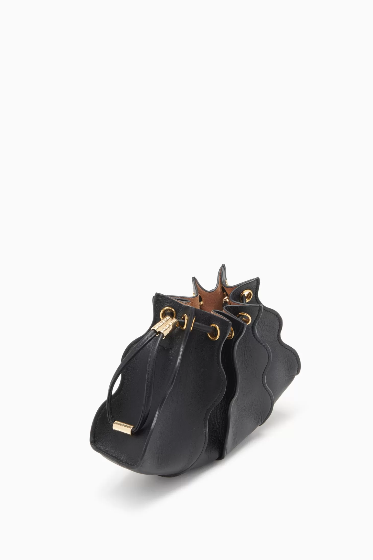 The Adria Wristlet is sculpted in Italy from strips of leather that are sewn together and finished with painted edges, emphasizing the beauty of the undulating waves. This wear-everywhere black wristlet features a drawstring opening, a removable shoulder strap, and is finished with lustrous antique brass accents.