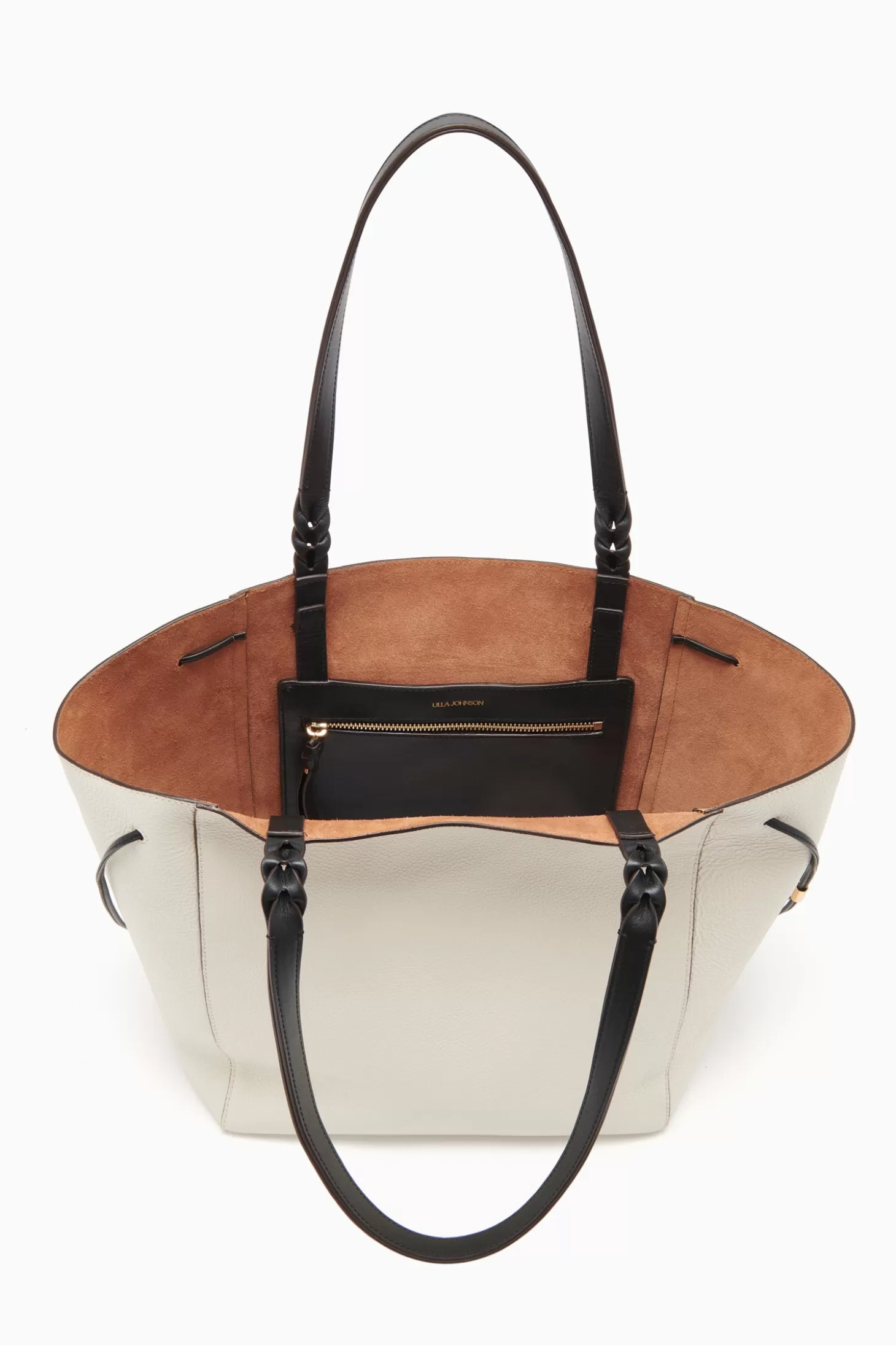 The Alma Everyday Tote is a wear-everywhere bag reimagined for Pre-Spring ‘24 in a black and white colorway with hammered brass hardware. This textured leather bag is the perfect day size—spacious but still compact and elegant. It features exquisite braided detailing at the handles and is lined in suede.