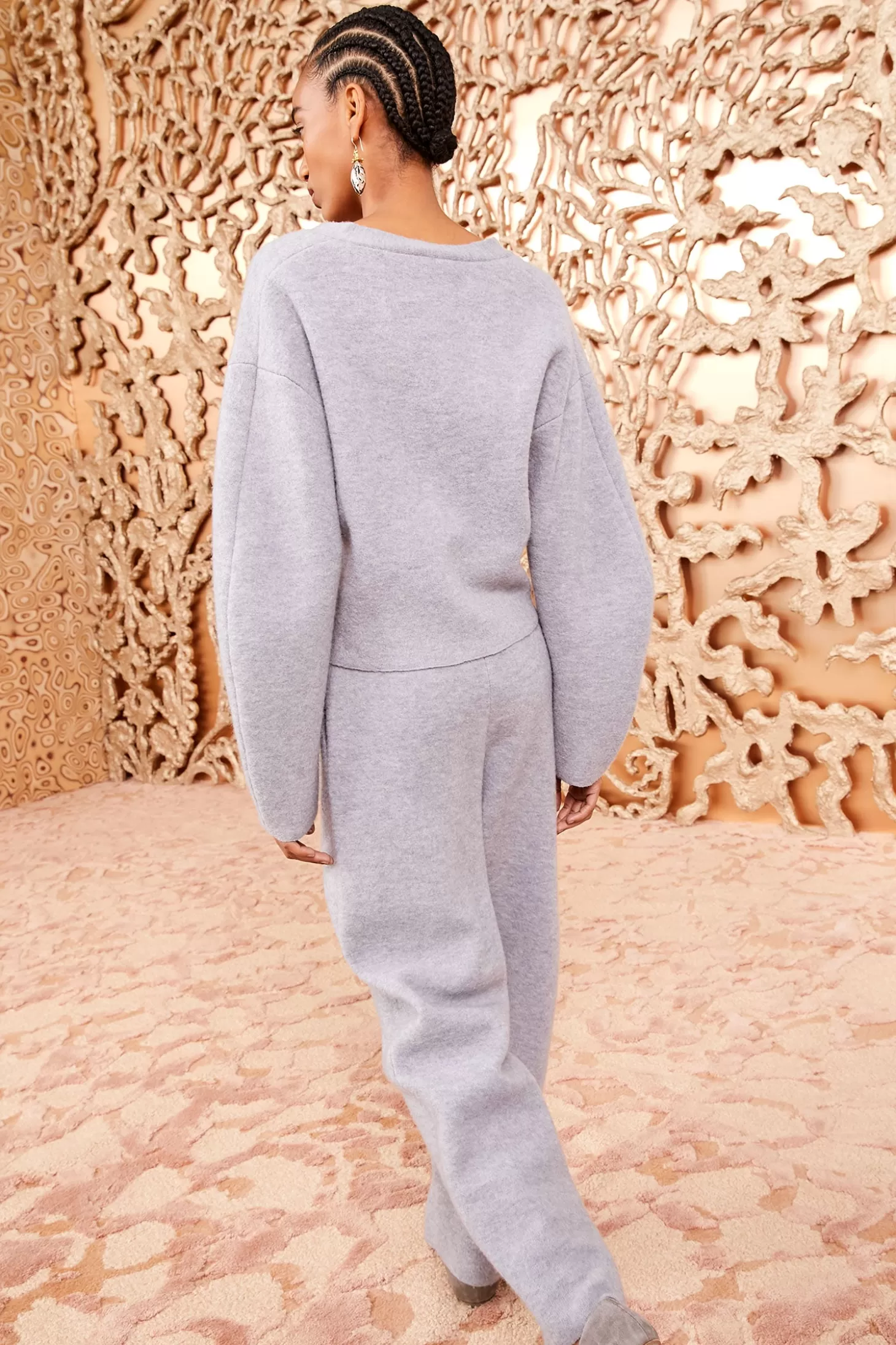 Effortless and cozy, our Delphine Pant is made from felted merino wool in a serene shade of heather gray. This pant has a streamlined, cocooning silhouette with a tapered leg, side pockets, and pairs with our Hadley Cardigan for a relaxed and sportif look.