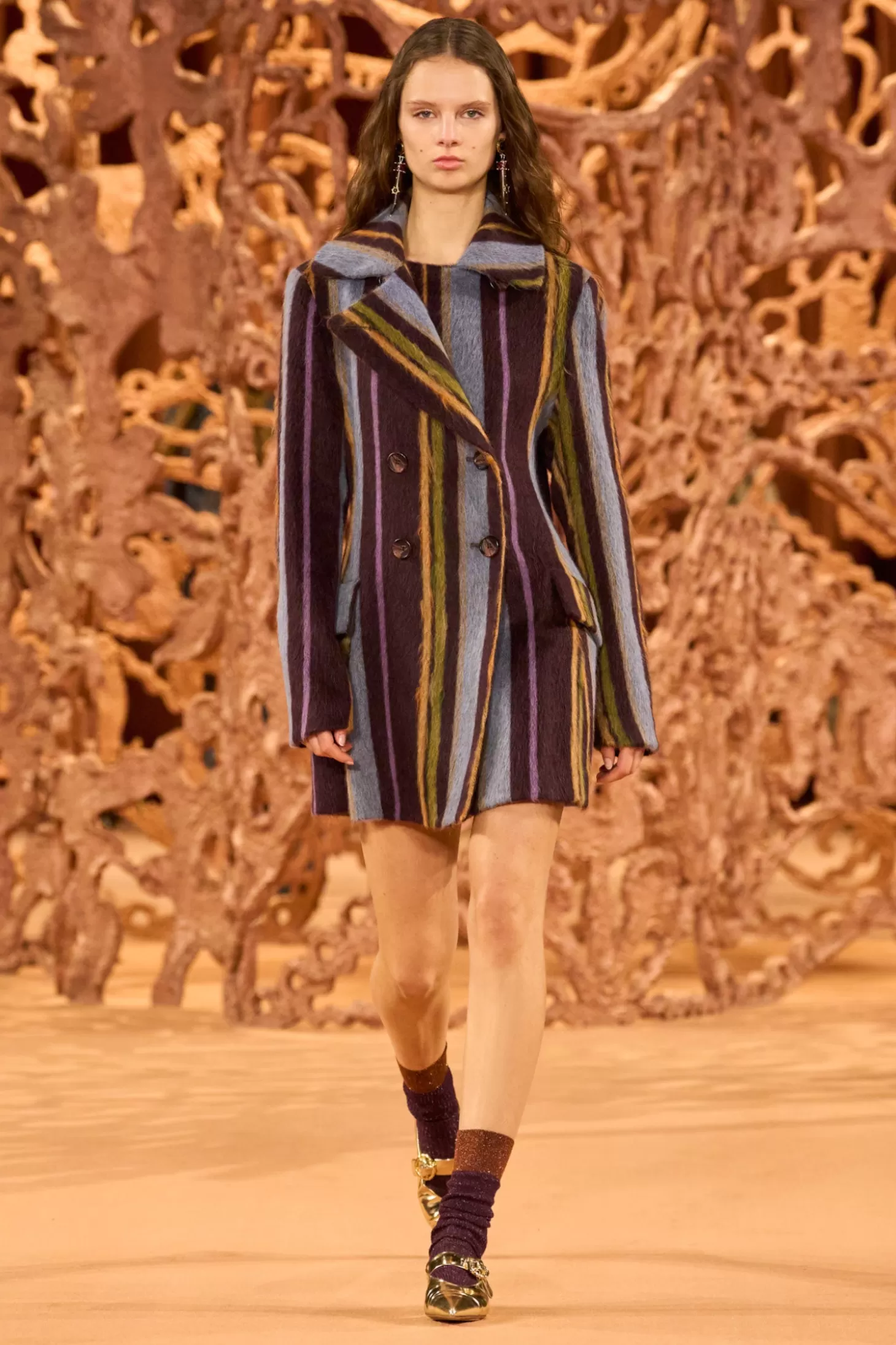 Featured in Look 45 of the Autumn/Winter 2024 runway show, the Lucie Coat is crafted from striped suri alpaca-blend coating, a luxuriously soft, Italian fabrication adorned with painterly multicolor stripes. This peacoat features a short hem, wide notch lapels, and side flap pockets. It has a classic double-breasted fastening through the front.