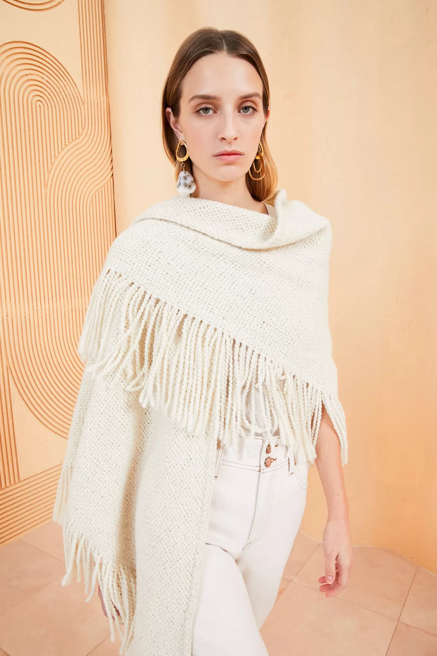 The Martina Shawl is handcrafted by our artisanal partners in Peru from a soft midweight cotton yarn. This cream shawl is a cozy wrap-around silhouette that can be worn several different ways. This unlined style is finished with a natural fringe hem.