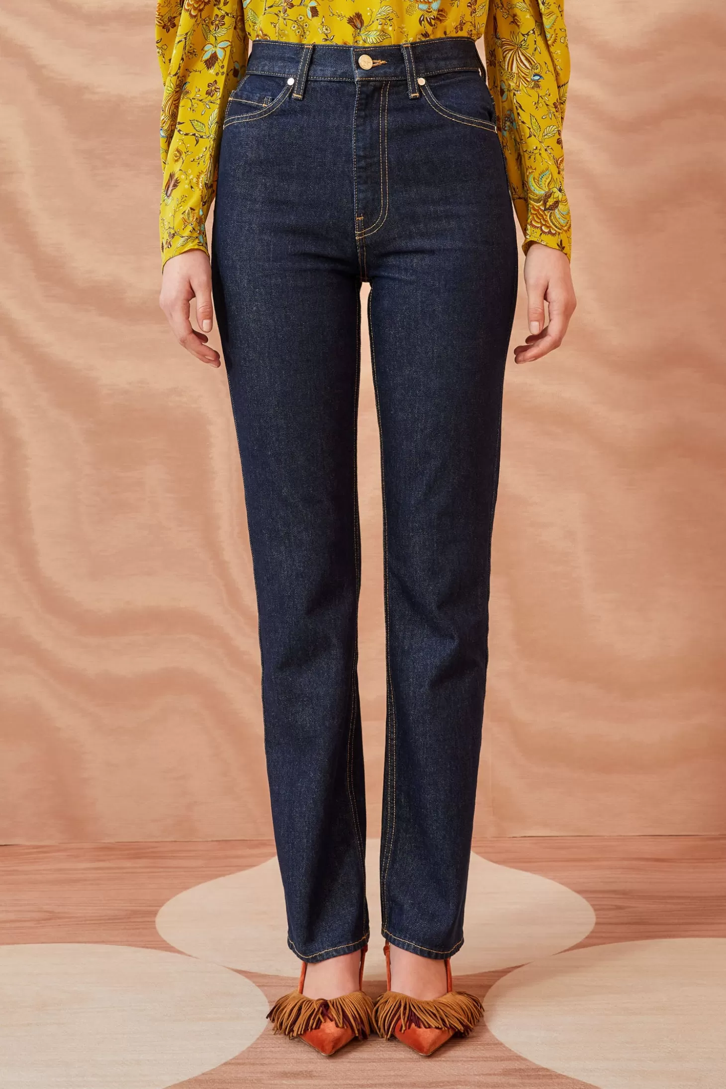 The Agnes Jean is one of our iconic styles of our inaugural denim collection, handmade in Los Angeles. This denim jean silhouette features a straight leg, high-waist and elegant, clean lines, arriving in deeply-hued Tigris. This jean is cut in non-stretch denim with a leather logo-embossed waistband patch and a hand-hammered ring attached to the back belt loop. Each style is designed to perfectly complement the silhouettes of every ready-to-wear collection.